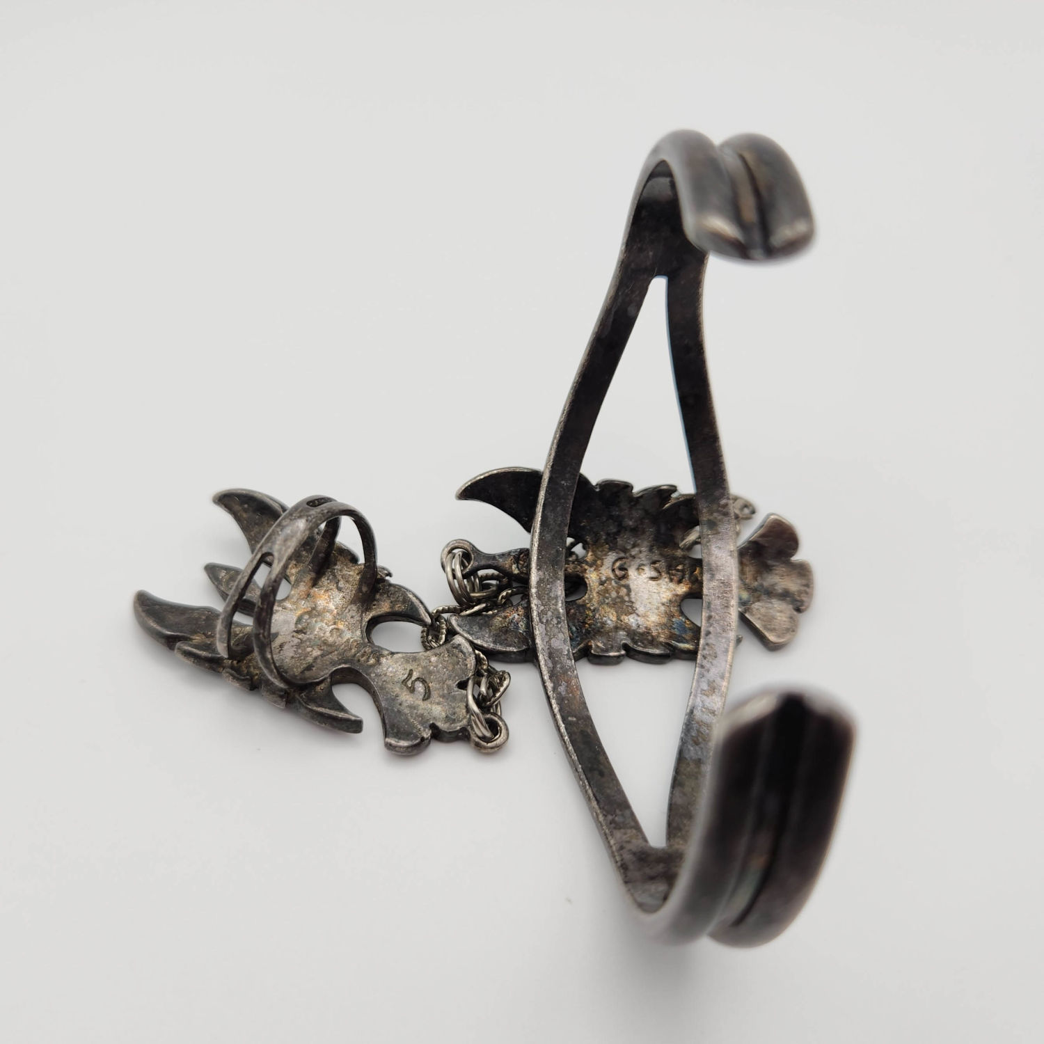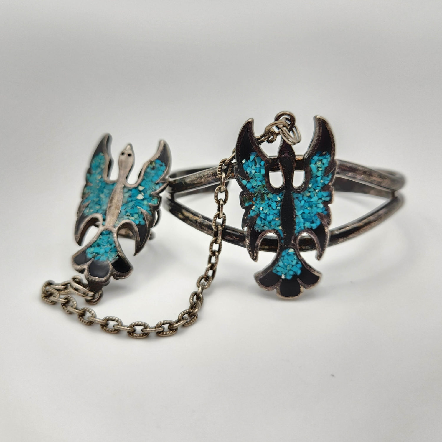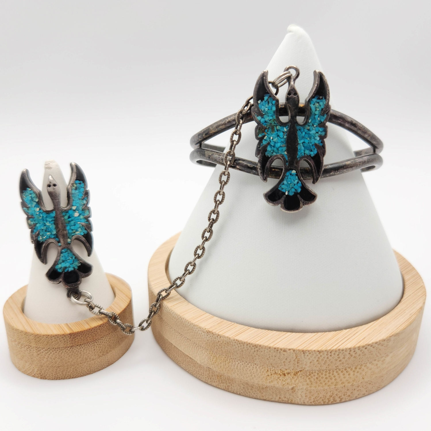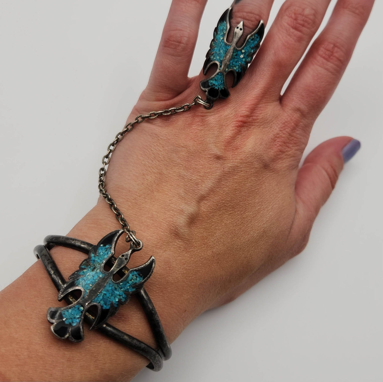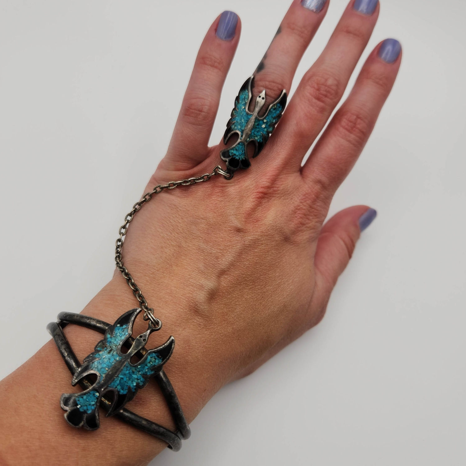 Sterling crushed Turquoise inlay firebird slave bracelet, 35.5g. Ring size 5. Signed GS 1985- Gordon and Smith