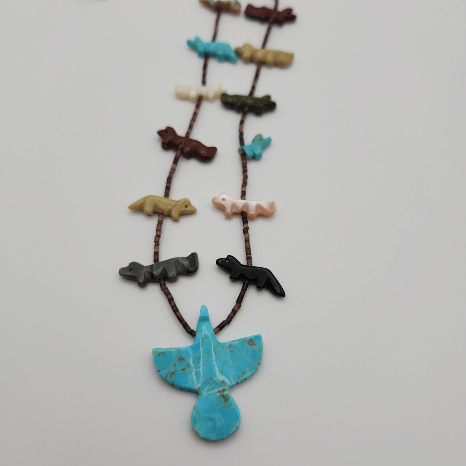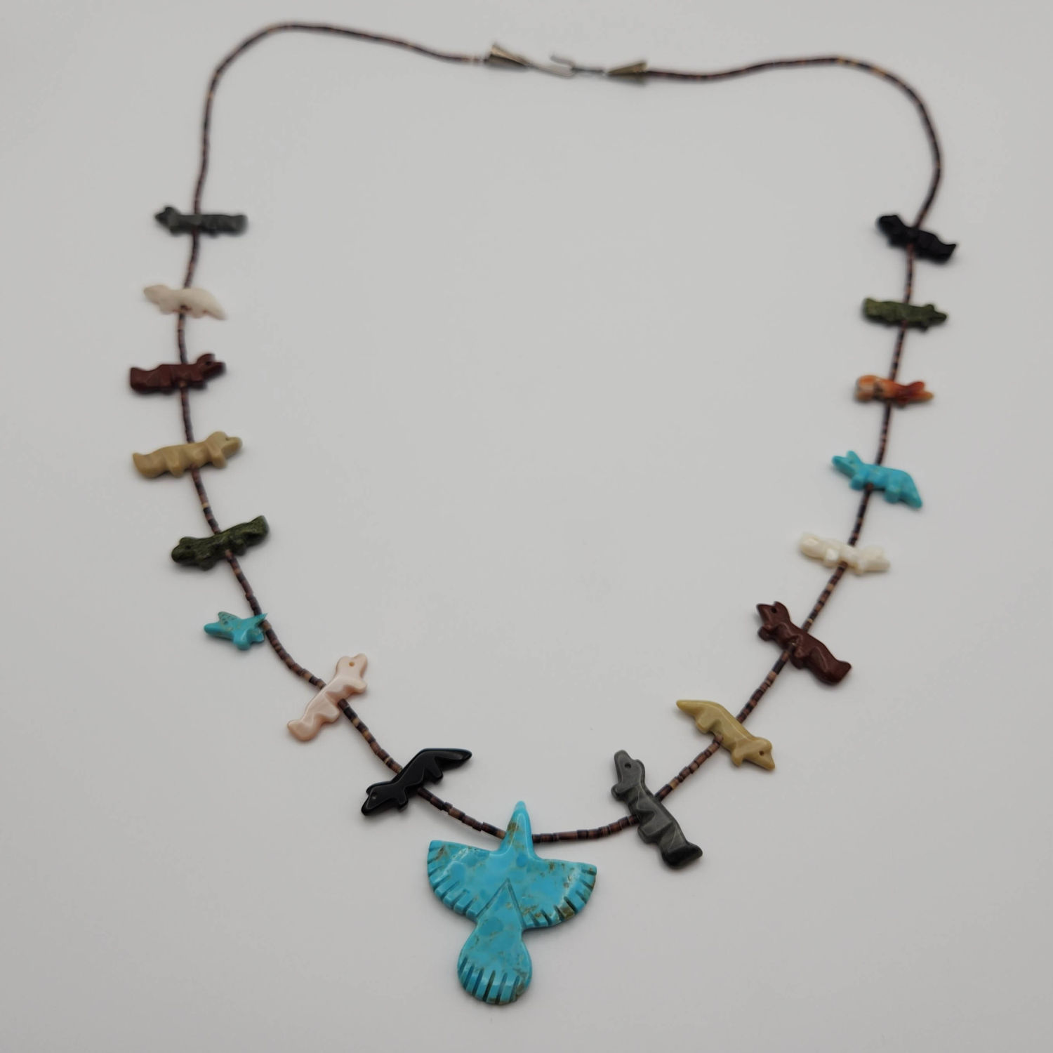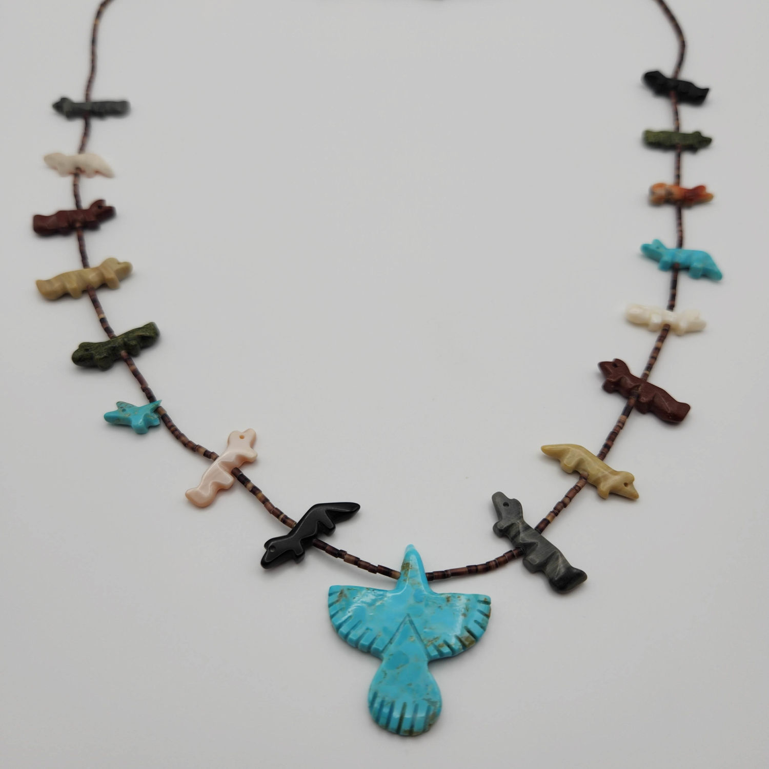 Zuni fetish carved bird heishi beaded necklace, 32g. As-is- one of the little animals has a broken wing.