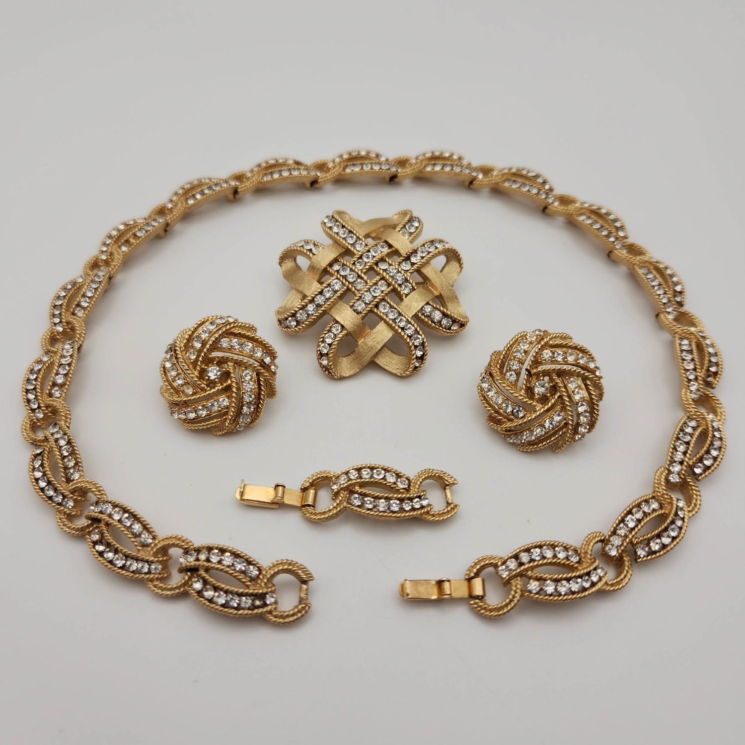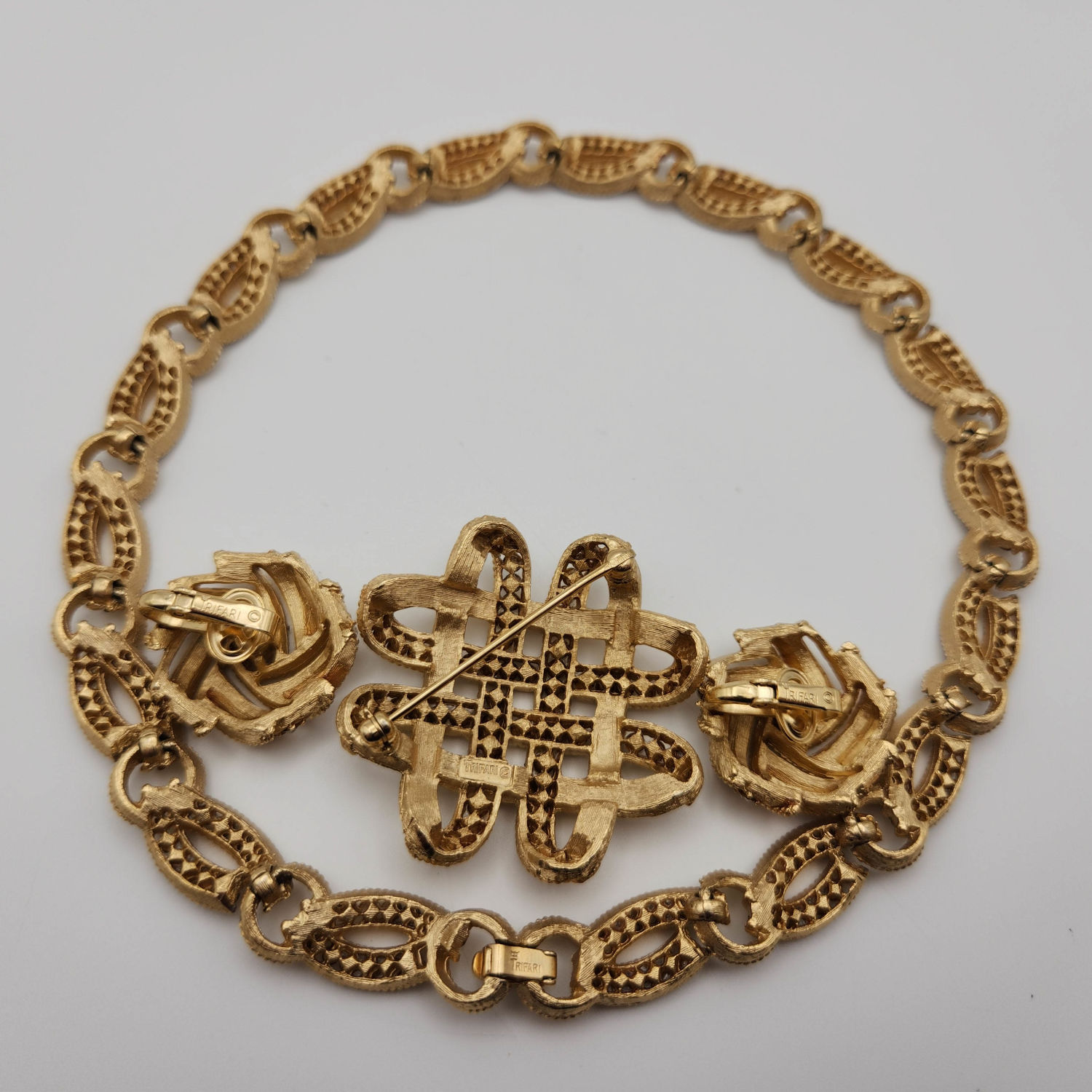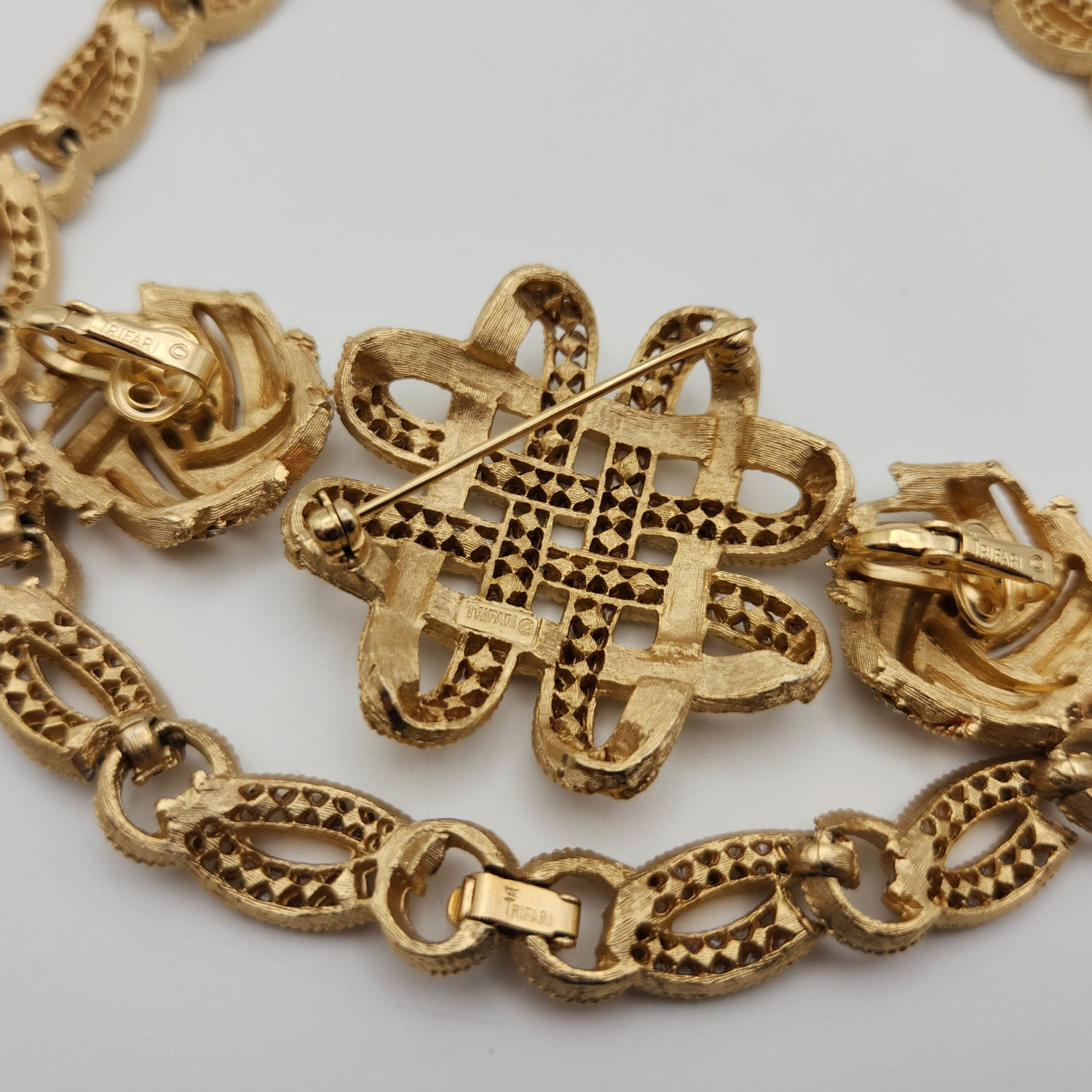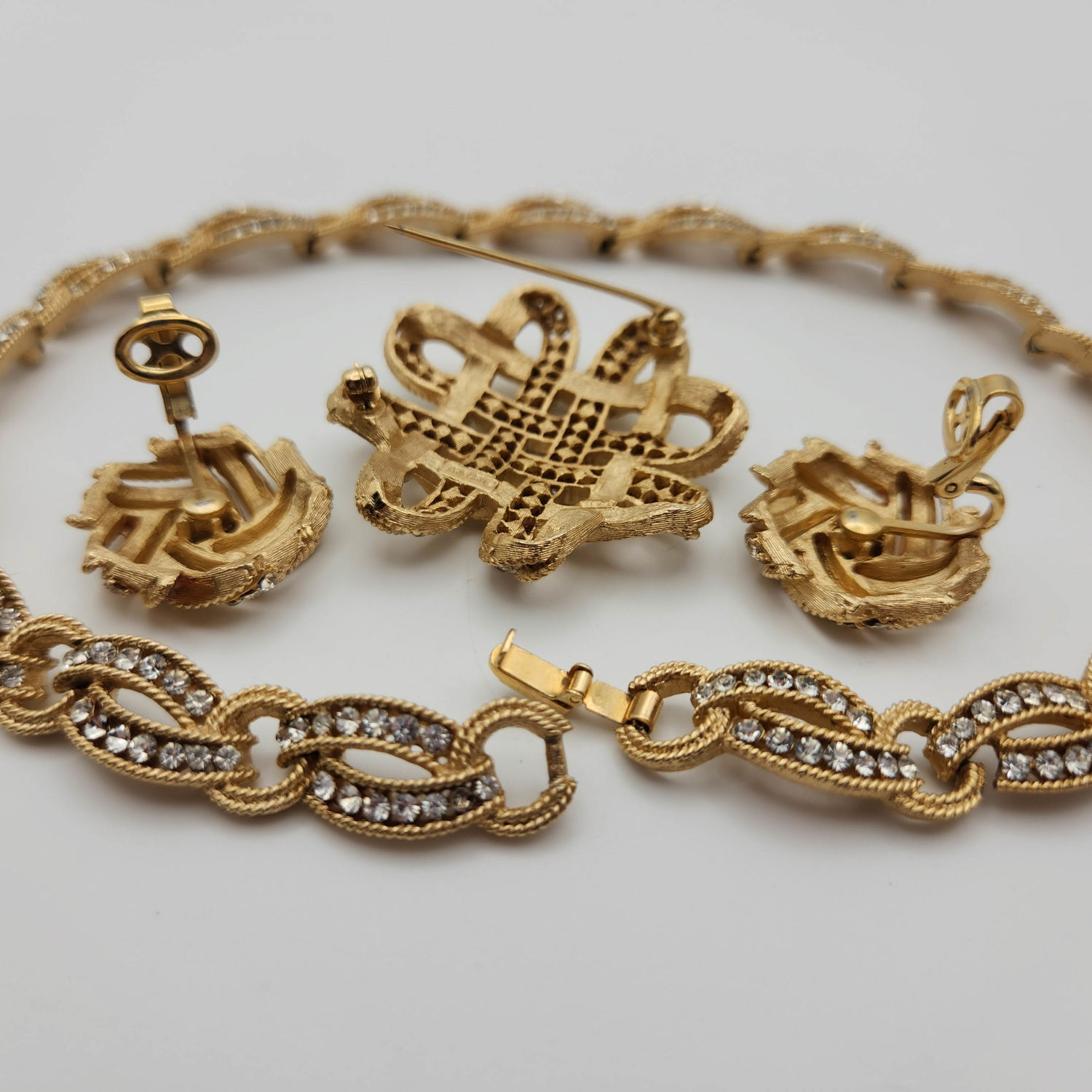 Crown Trifari Brushed Gold Rhinestone set Necklace/Earrings Brooch