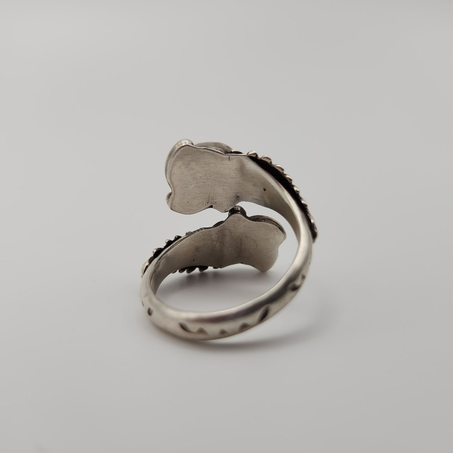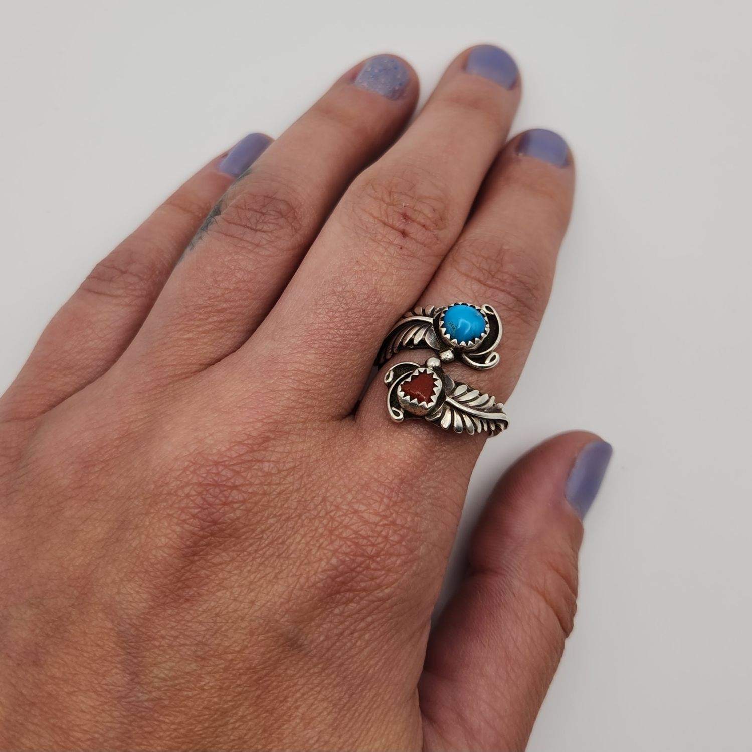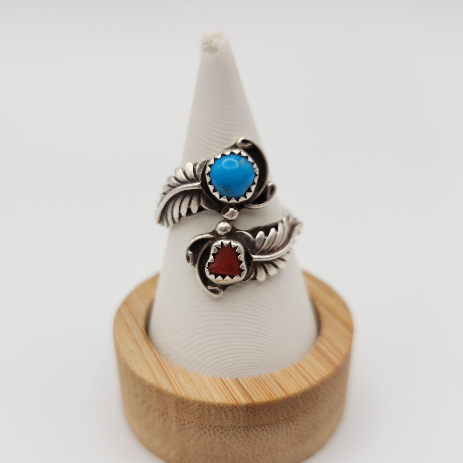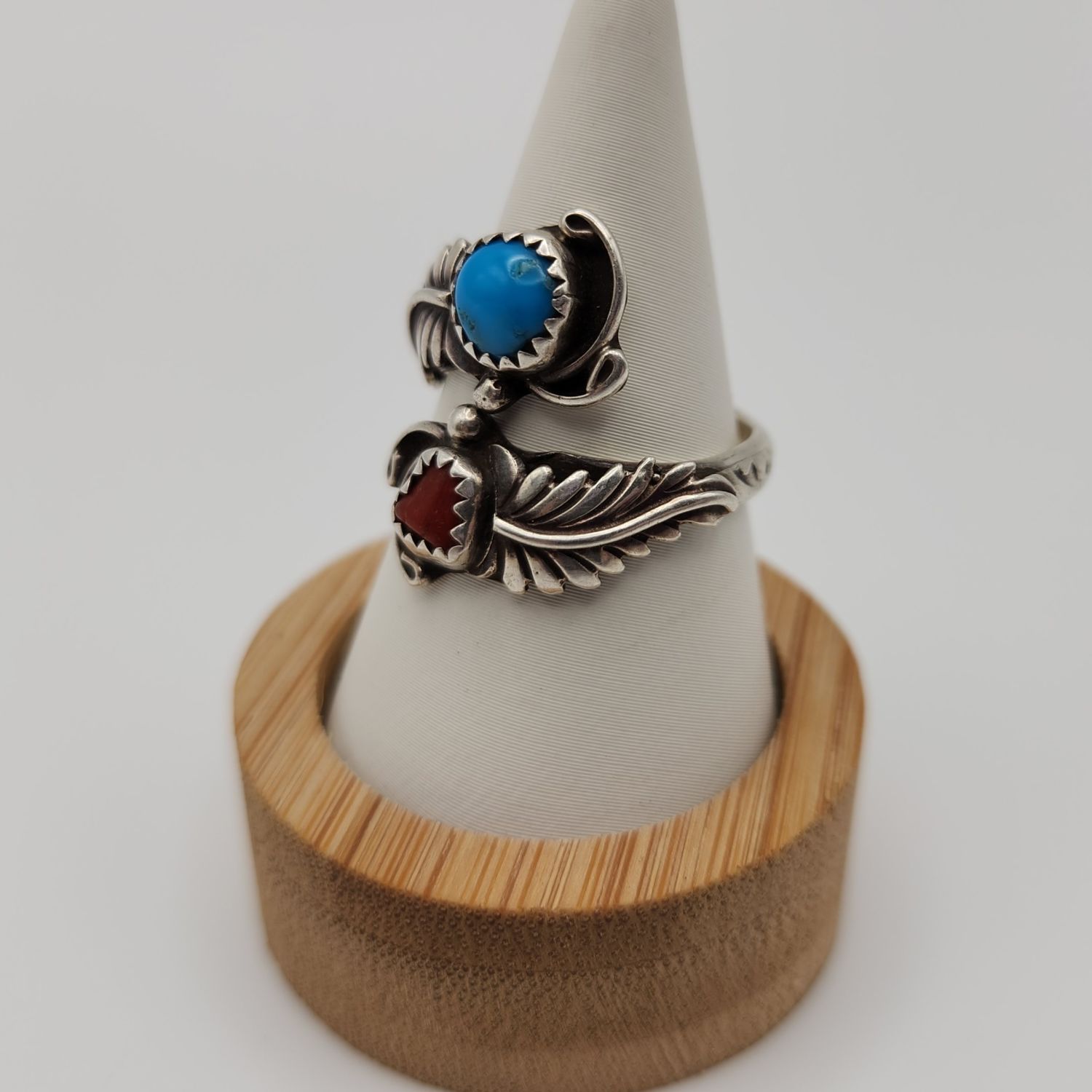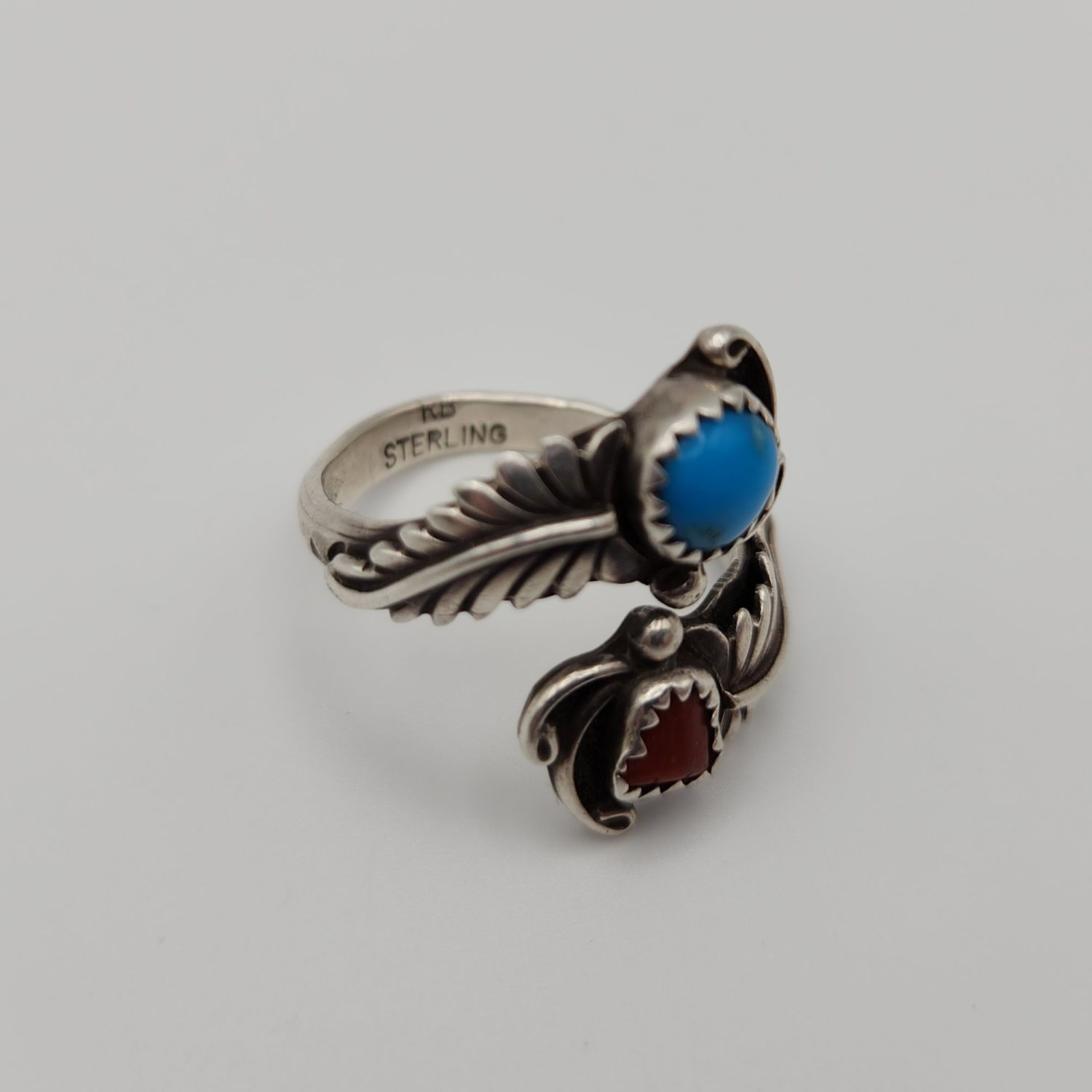 Sterling Turquoise and coral feather wrap ring, 5.1g. Signed RB- Running Bear. Size 7.75/adjustable