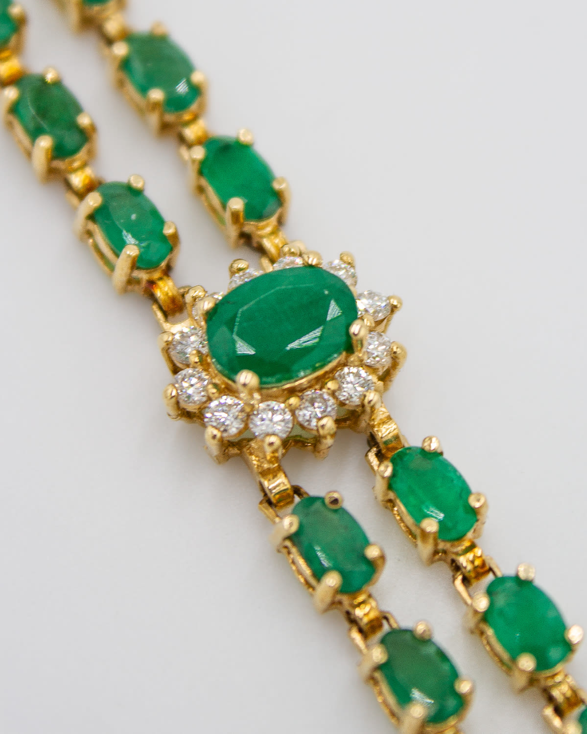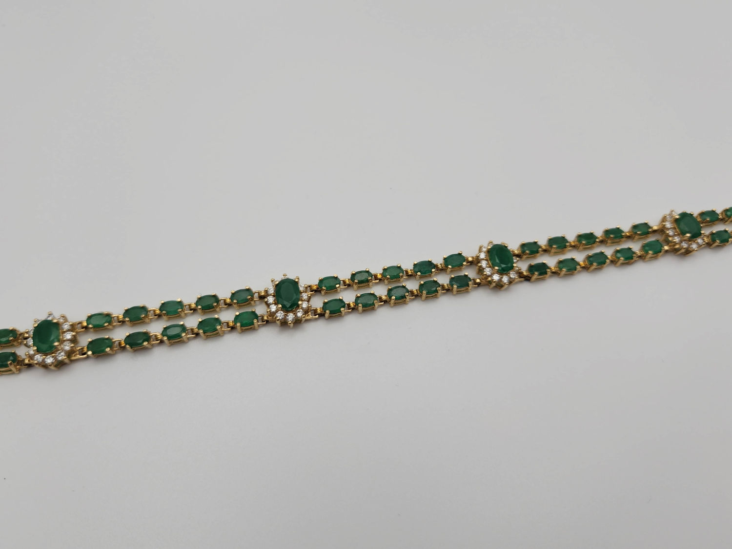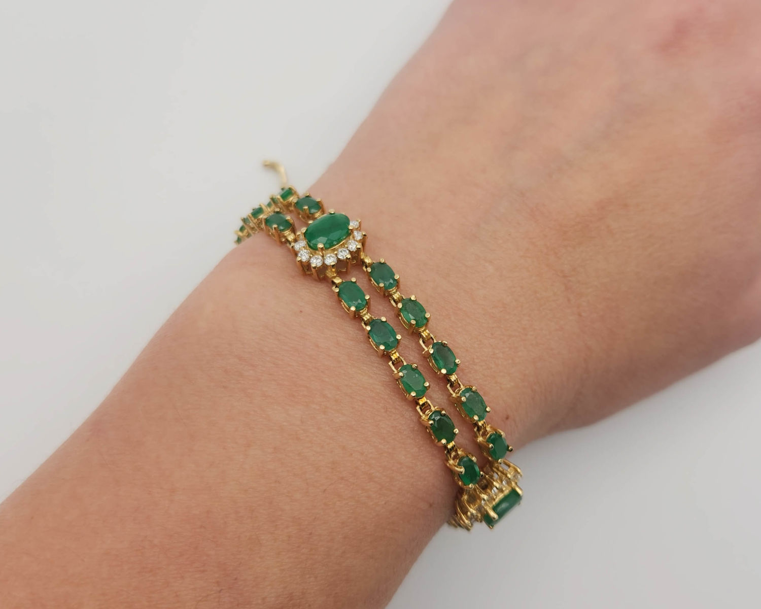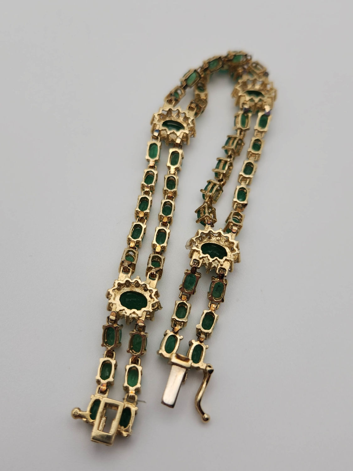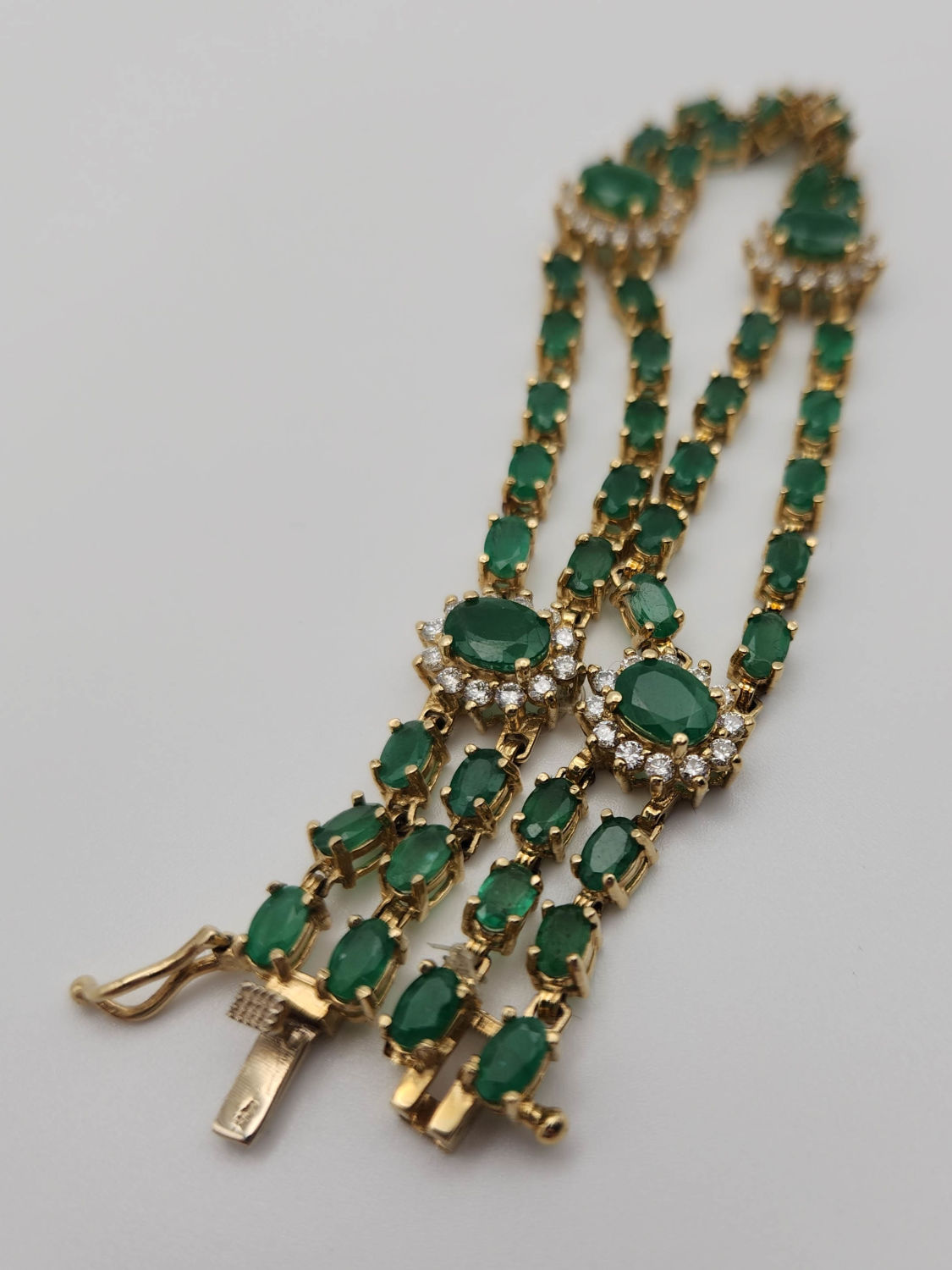 14k Gold with 12 carats of Natural Emeralds and Diamonds- Brilliant cut crown, Step cut pavillion, 42 emeralds. 5×3-7x5mm. Cut grade is very good to good. 1.5 carats of diamondsSI1-SI2. Total Weight of the bracelet is 18g