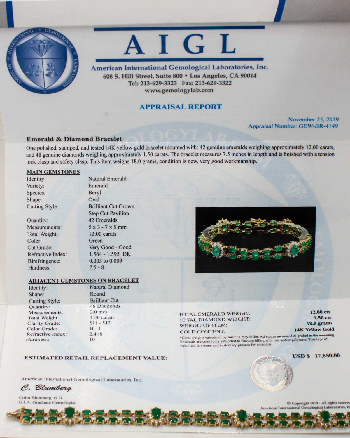 14k Gold Natural Emerald and Diamond Bracelet w/ Appraisal