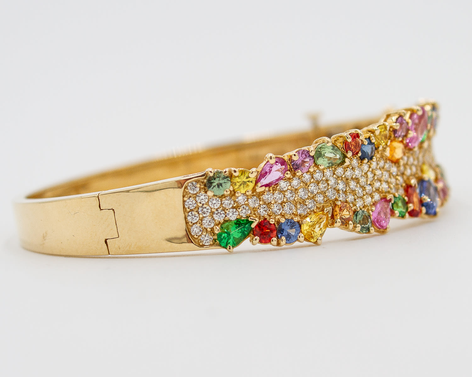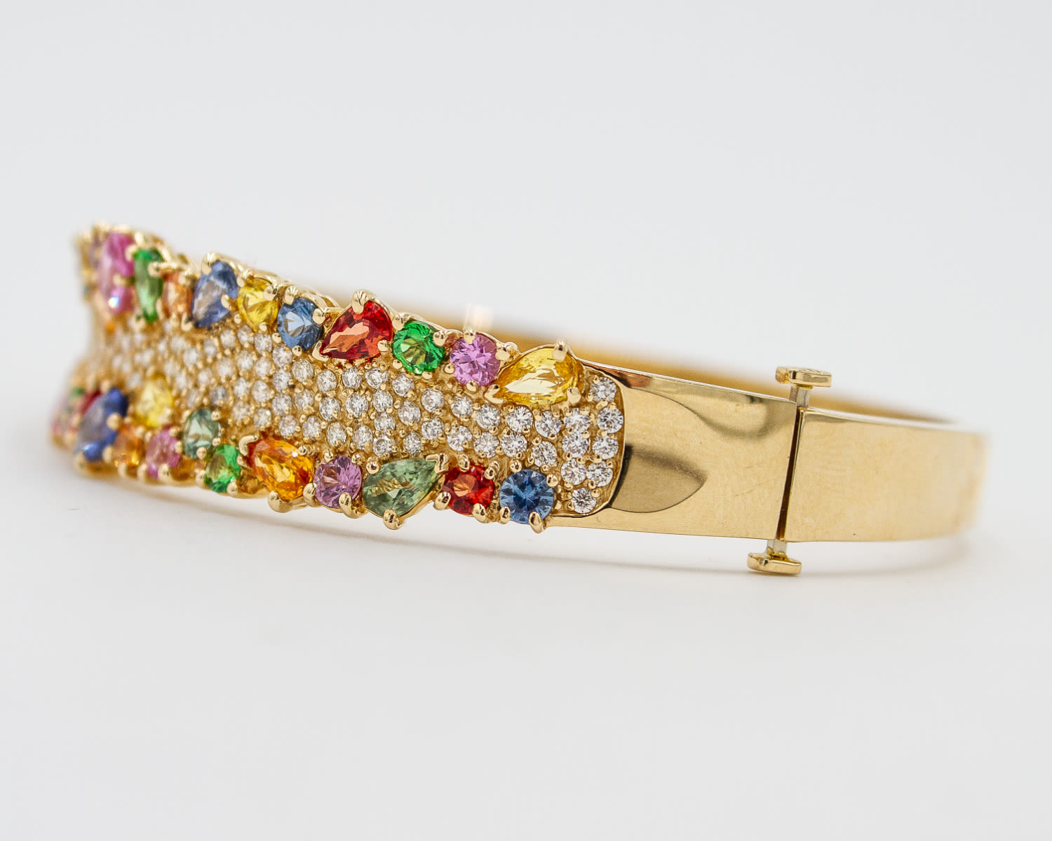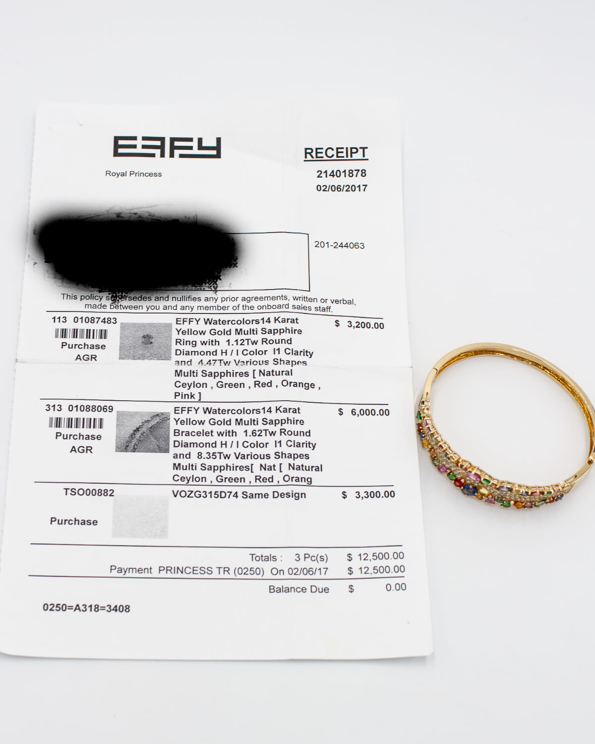 14k Gold Effy Watercolors Natural Diamonds Sapphires: 1.63 TCW Diamonds, H/I color, I1 clarity. 8.35 TCW Sapphires; Ceylon, Green, Orange, Red. Purchsed for $6000.