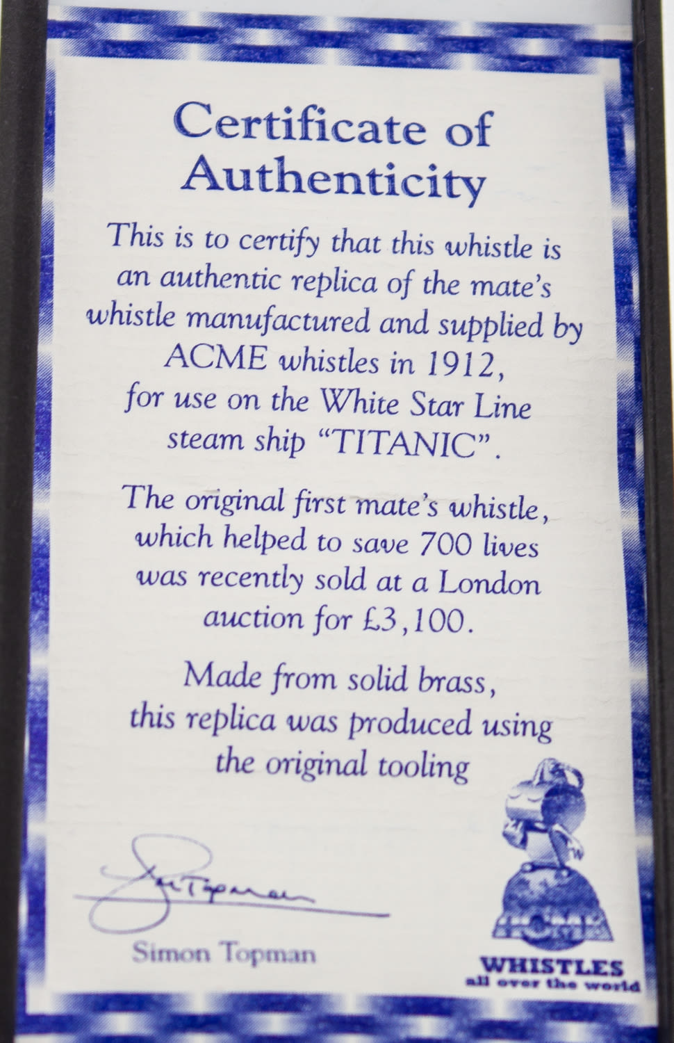 The Authentic Titanic Mates Whistle in original boxMade on the original tooling by the supplier in 1912