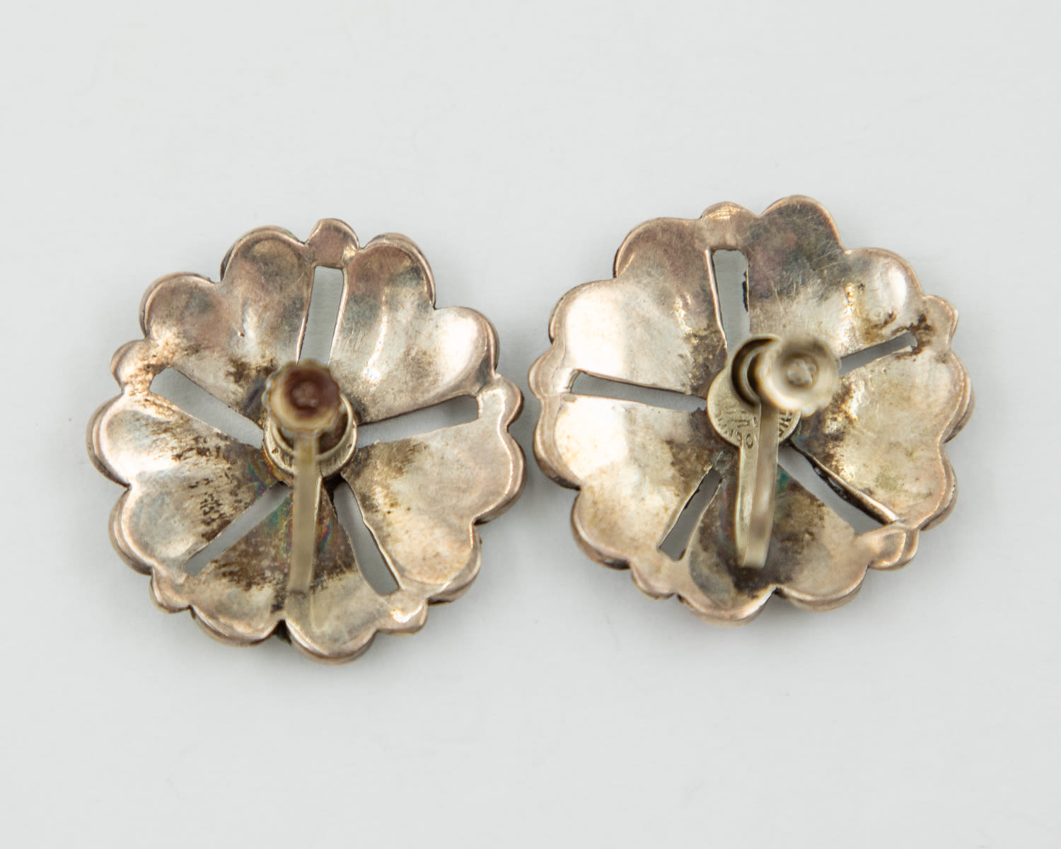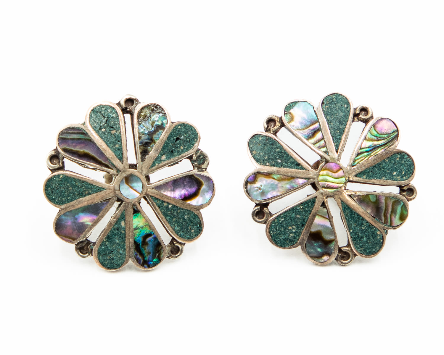 Signed Mexico Sterling Abalone Stone Inlay Screw Back Flower Earrings 10gJAR/GAS Signature Stamp