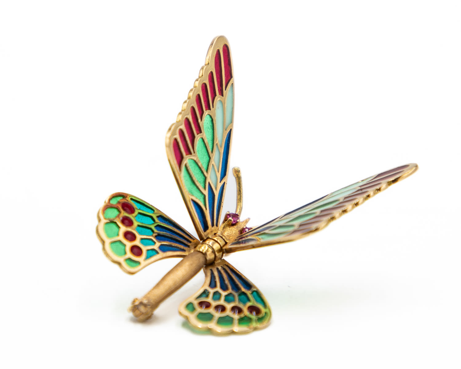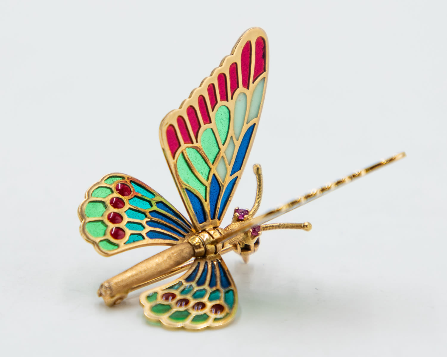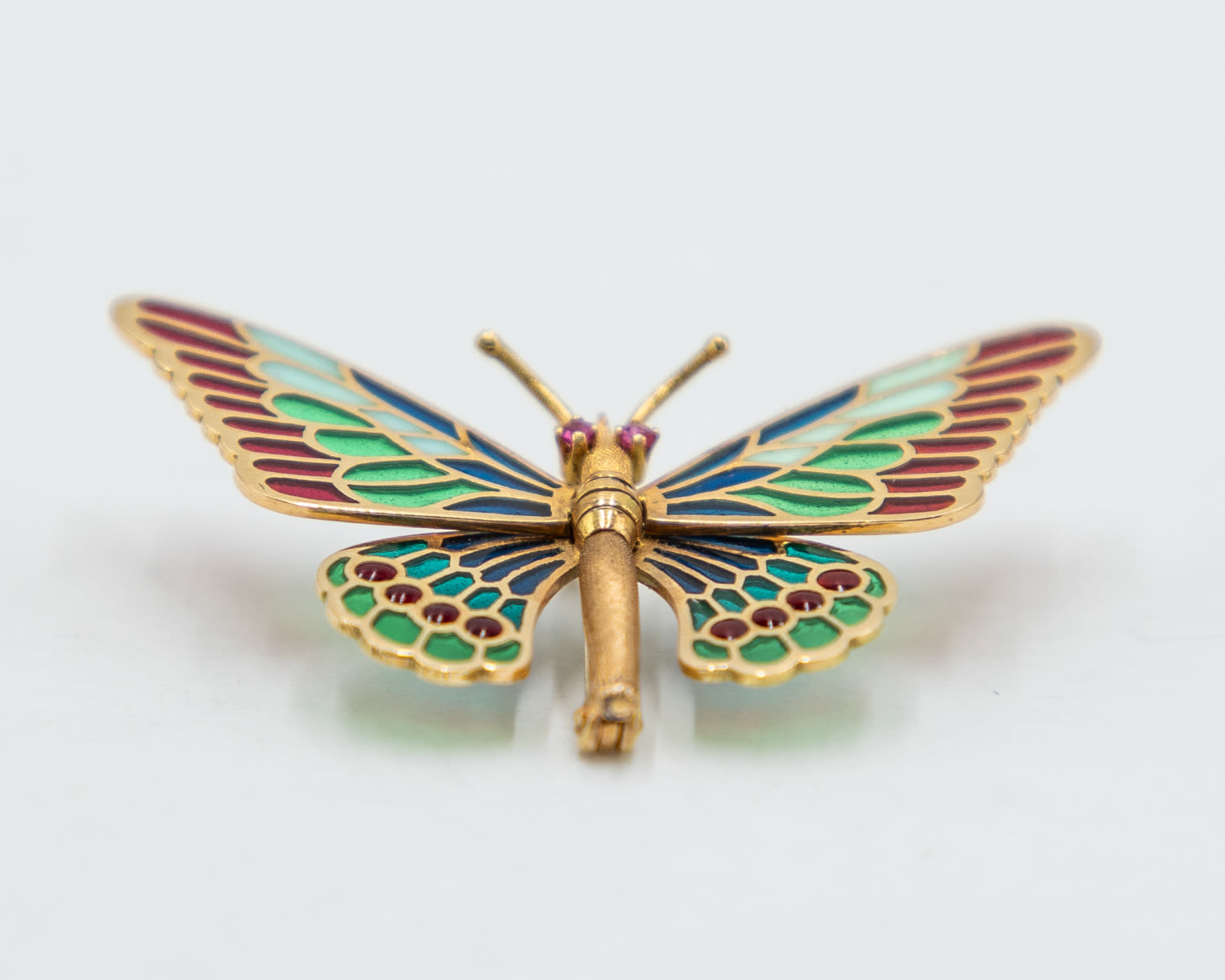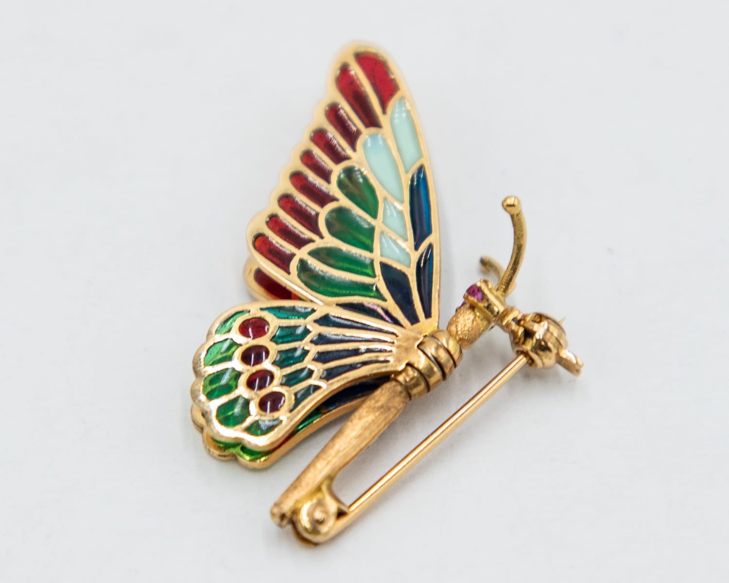 18k Mid Century Plique-a-Jour Butterfly Brooch