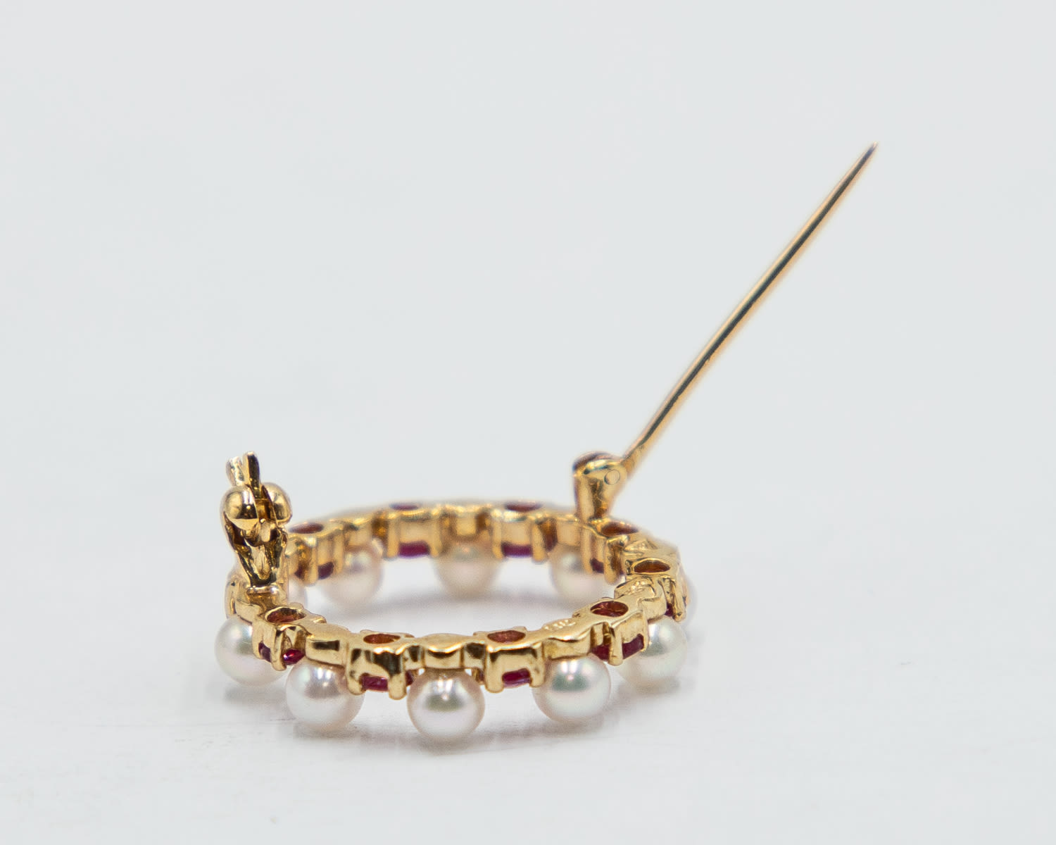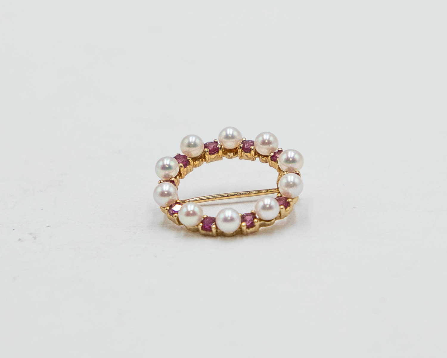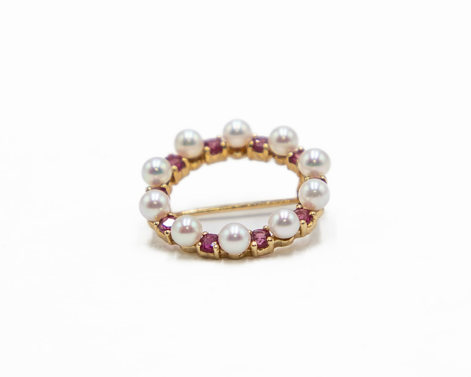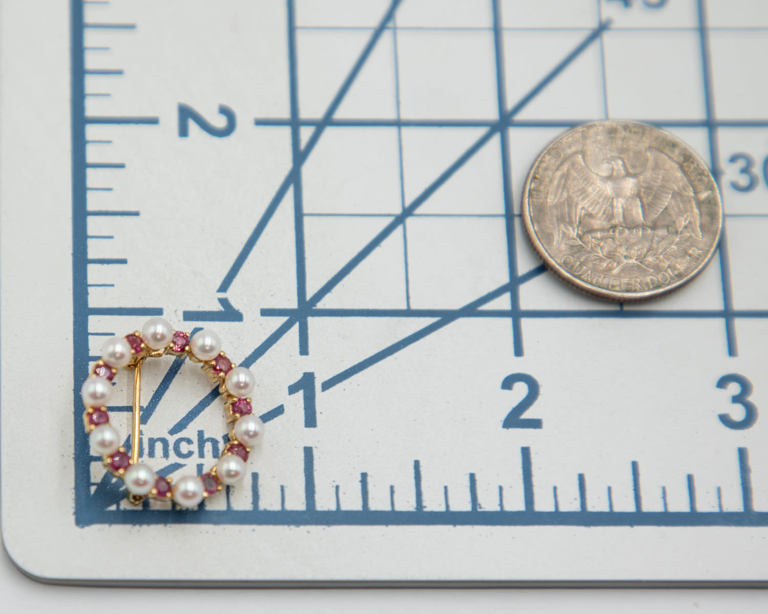 Ruby Pearl 14k Gold Wreath Brooch 2.8g