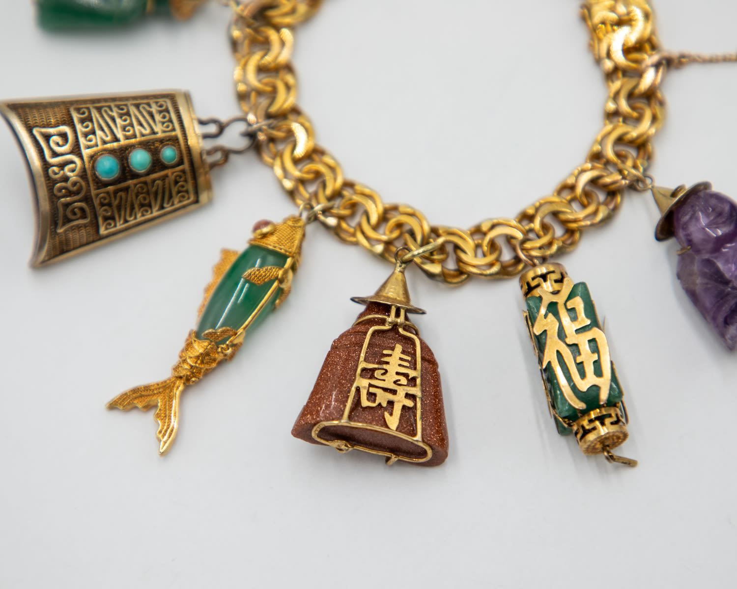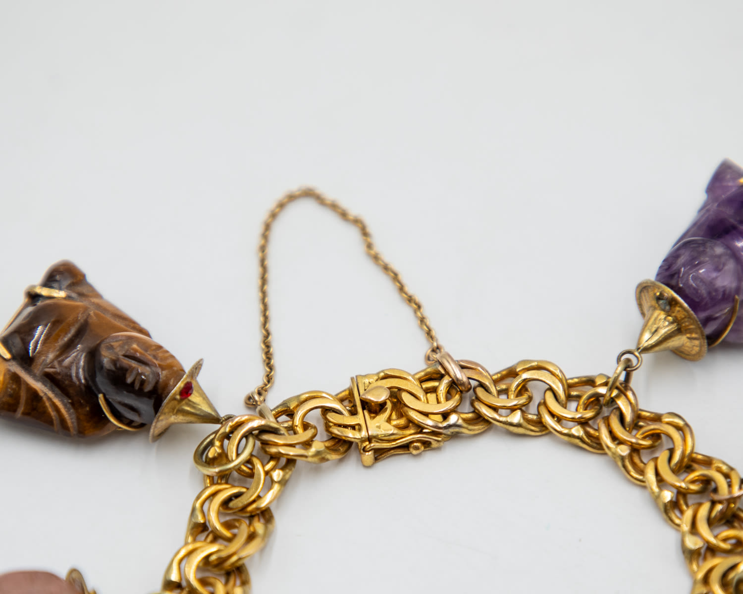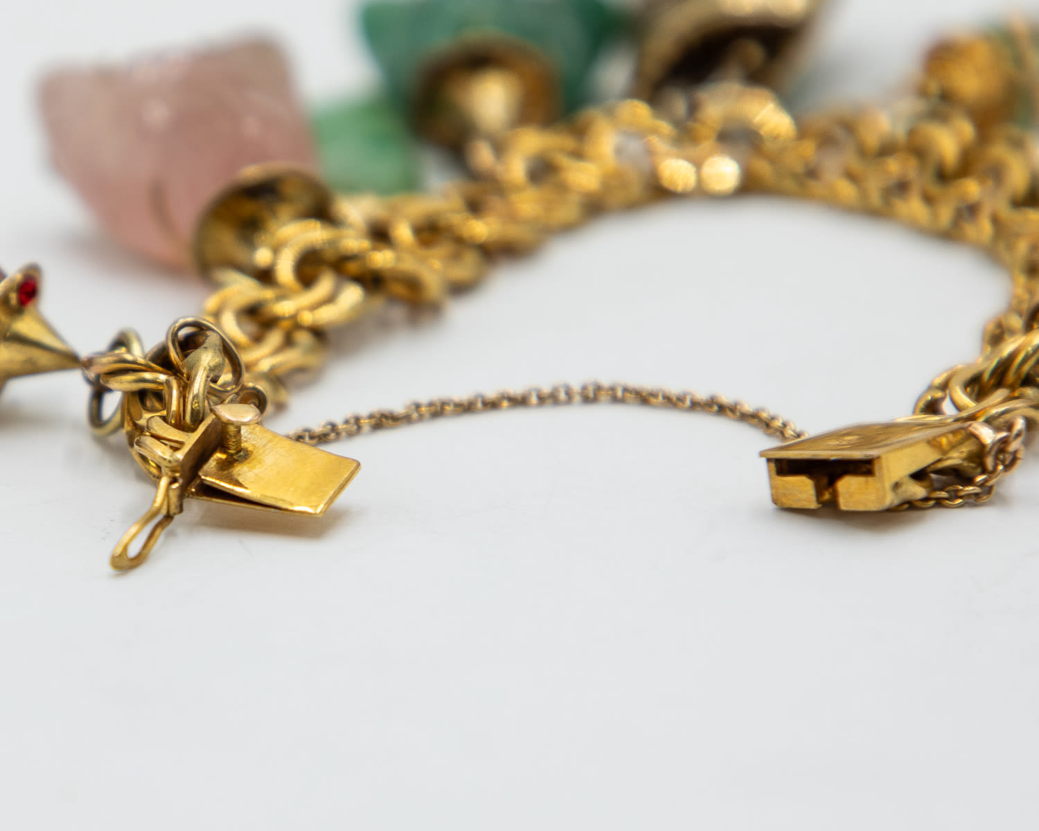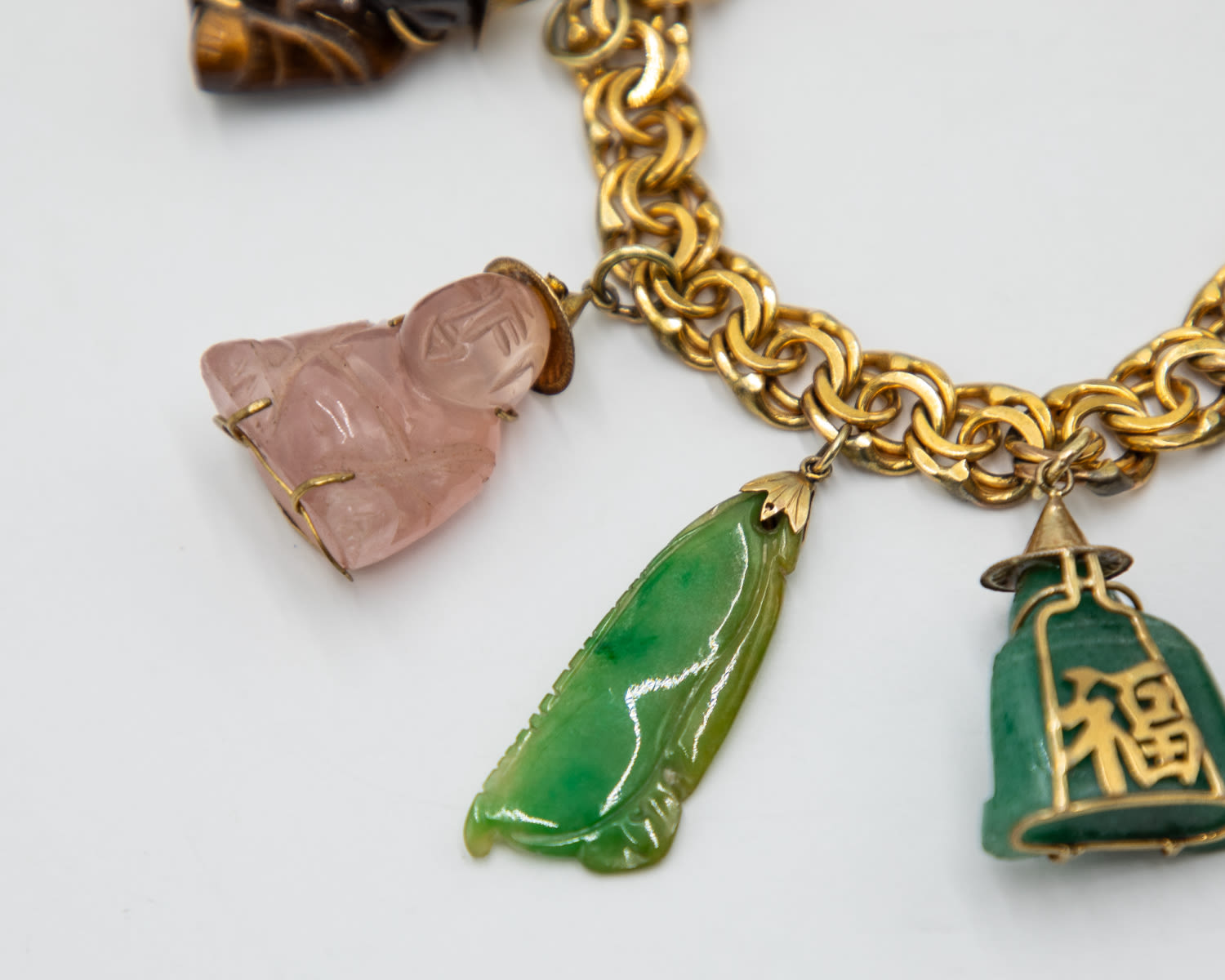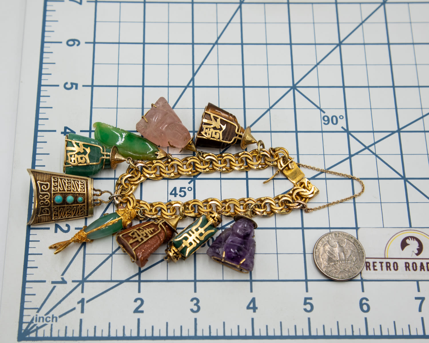 Gold Stone Amethyst Rose Quartz Tigers Eye Aventurine Jade Turquoise 14k Gold Charm Bracelet 95.2g