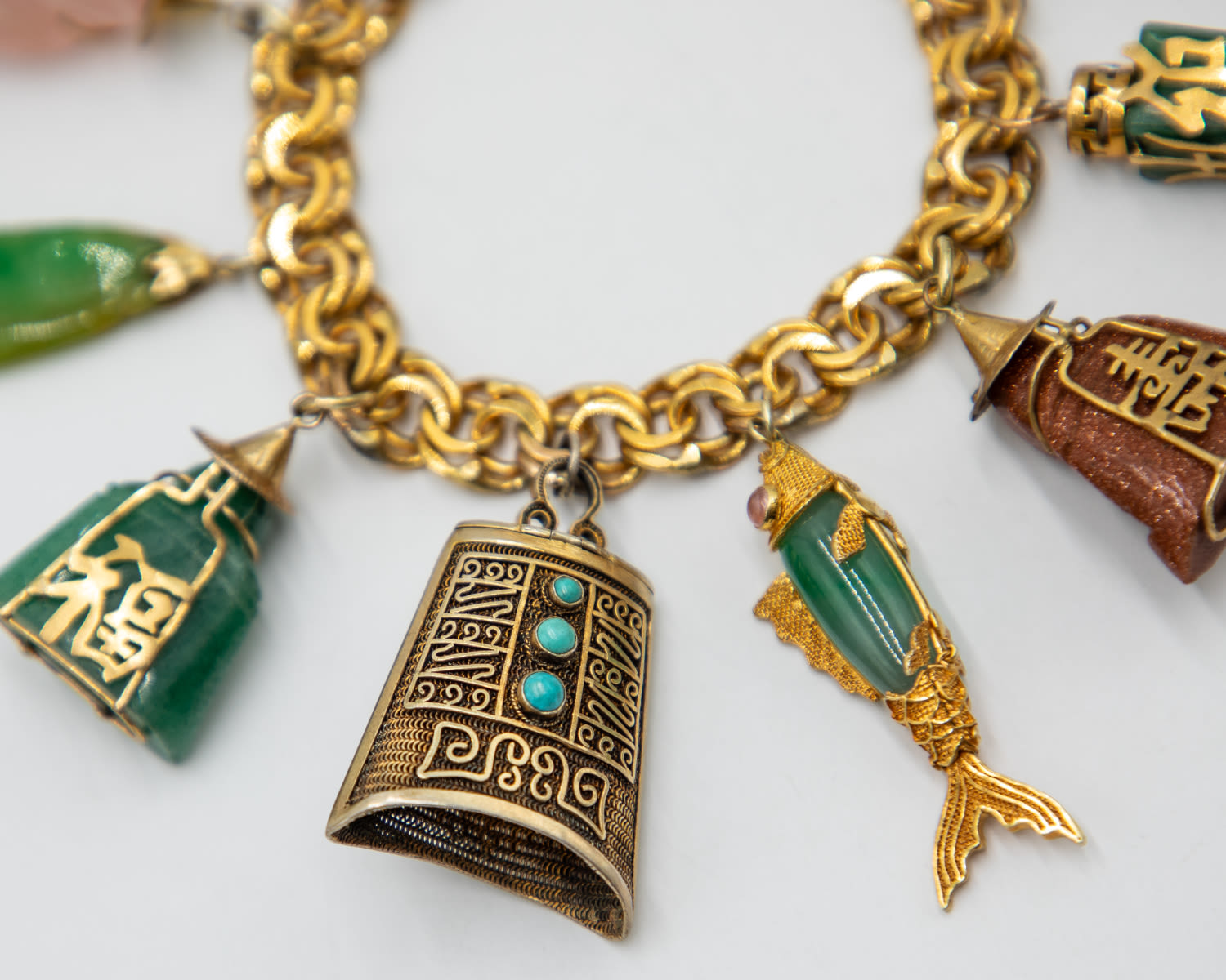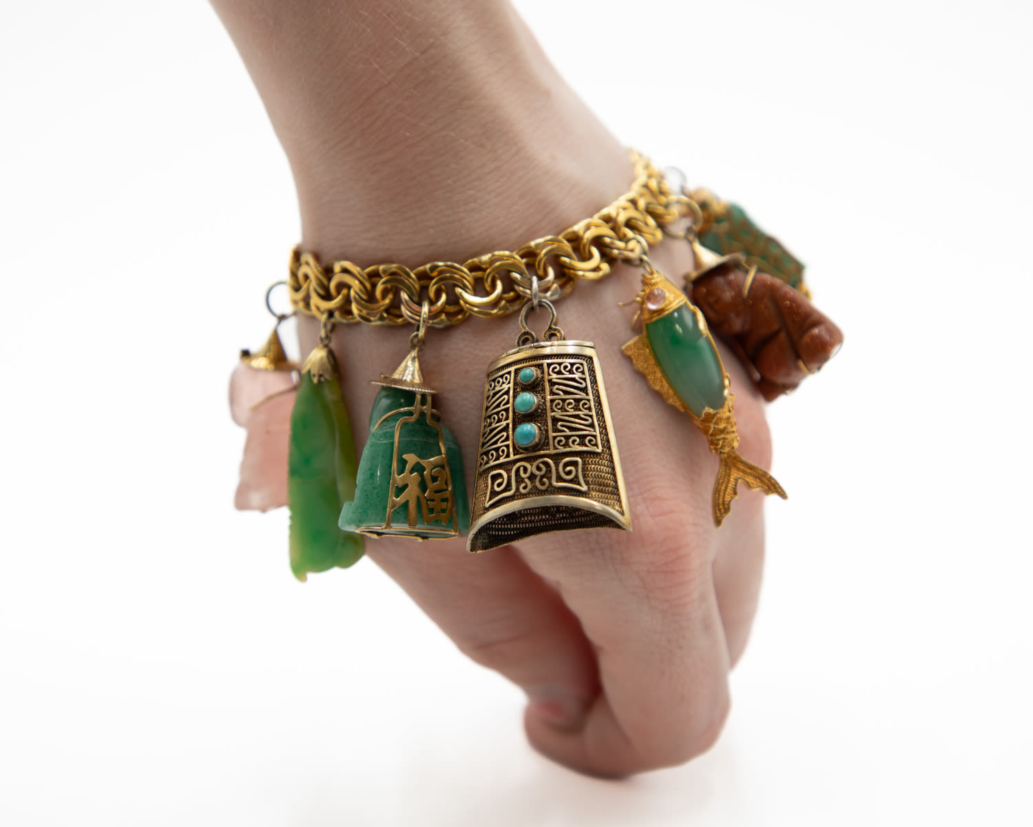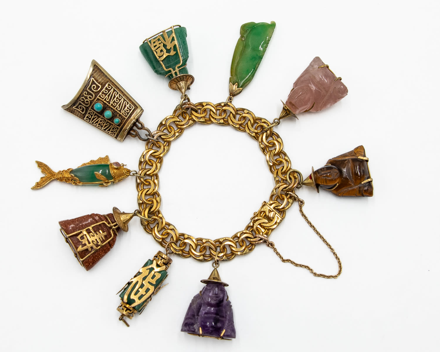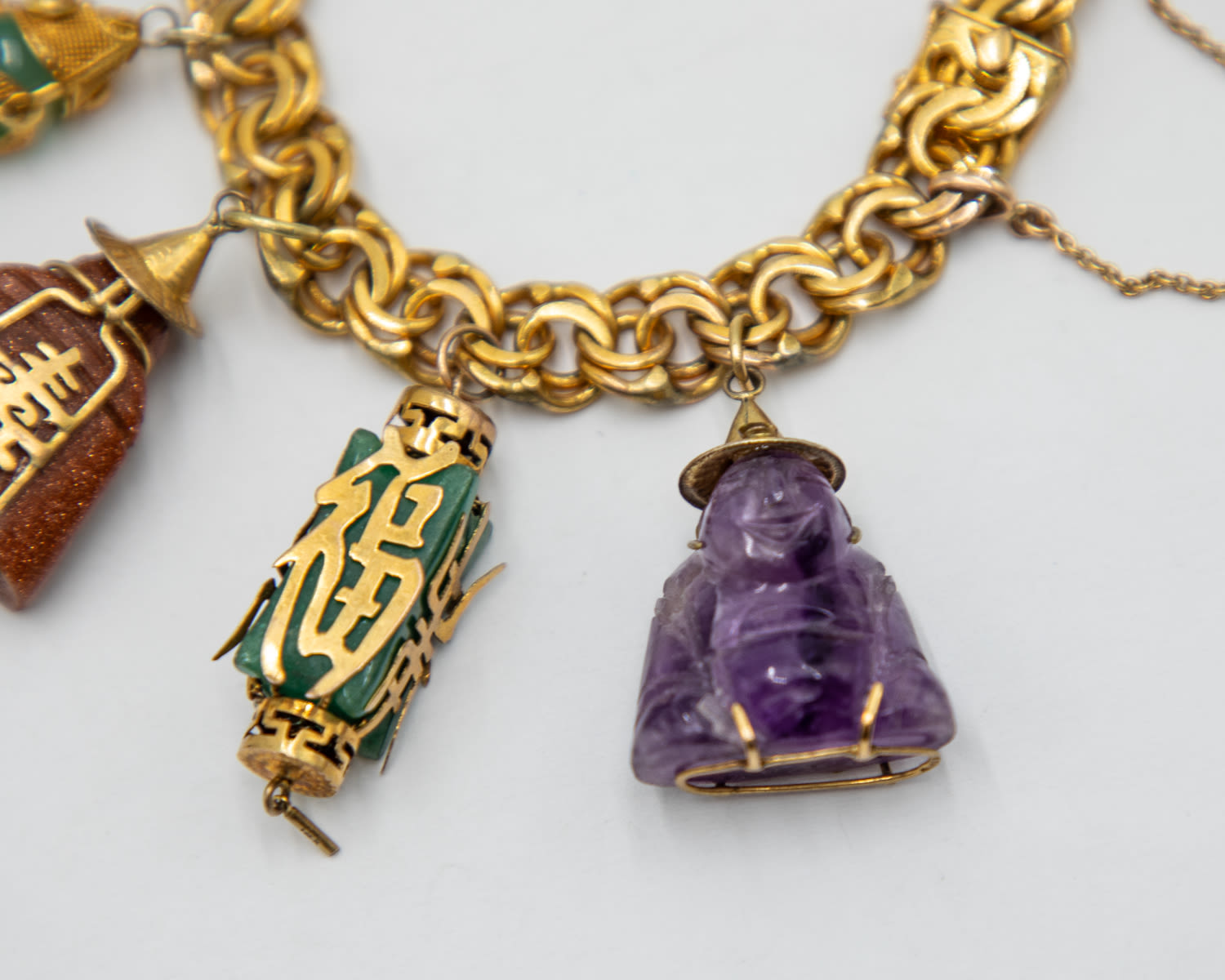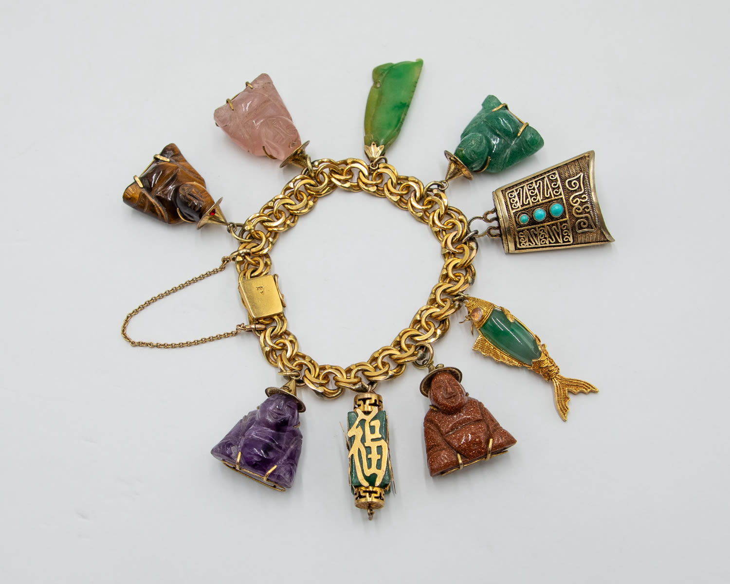 Gold Stone Amethyst Rose Quartz Tigers Eye Aventurine Jade Turquoise 14k Gold Charm Bracelet 95.2g