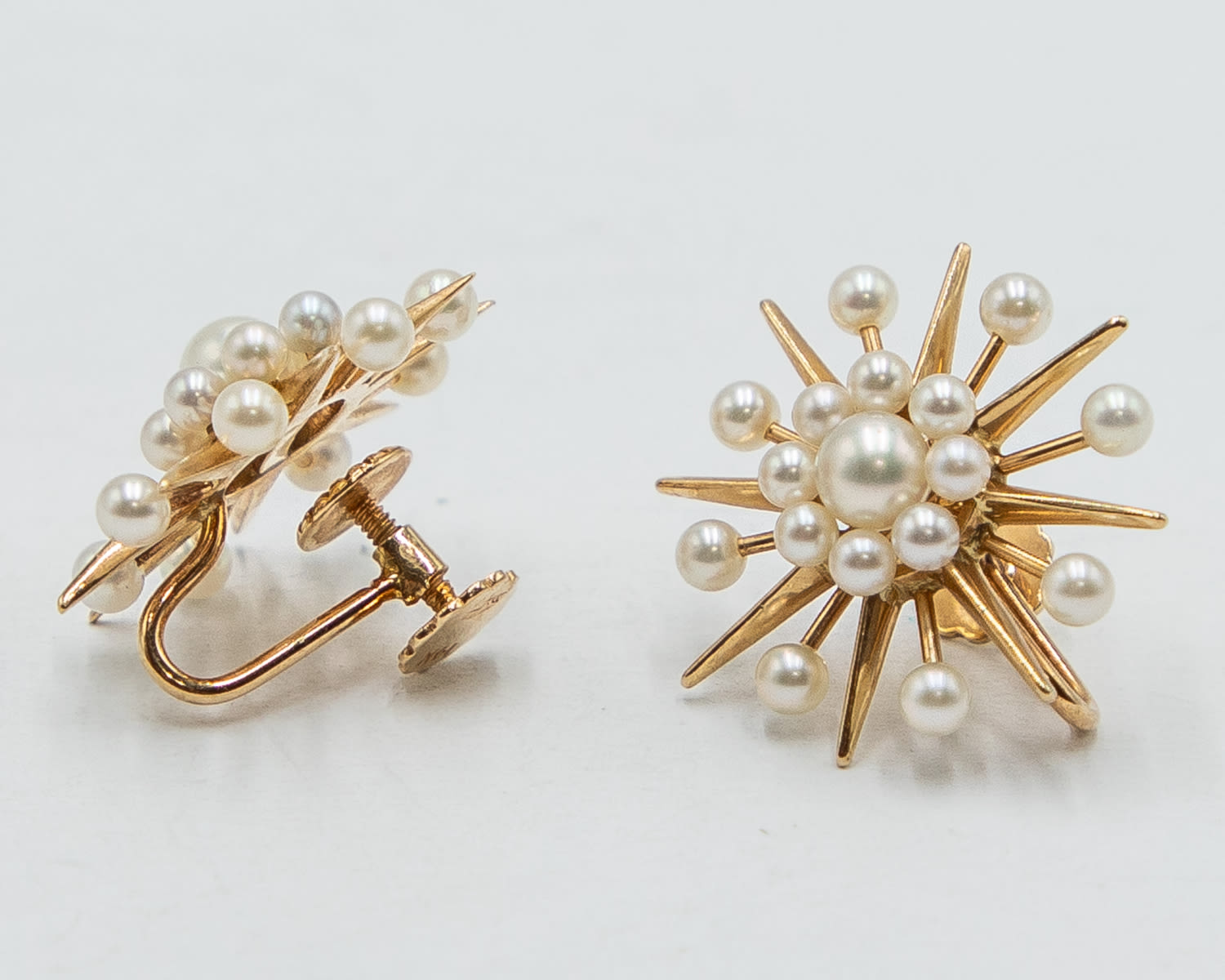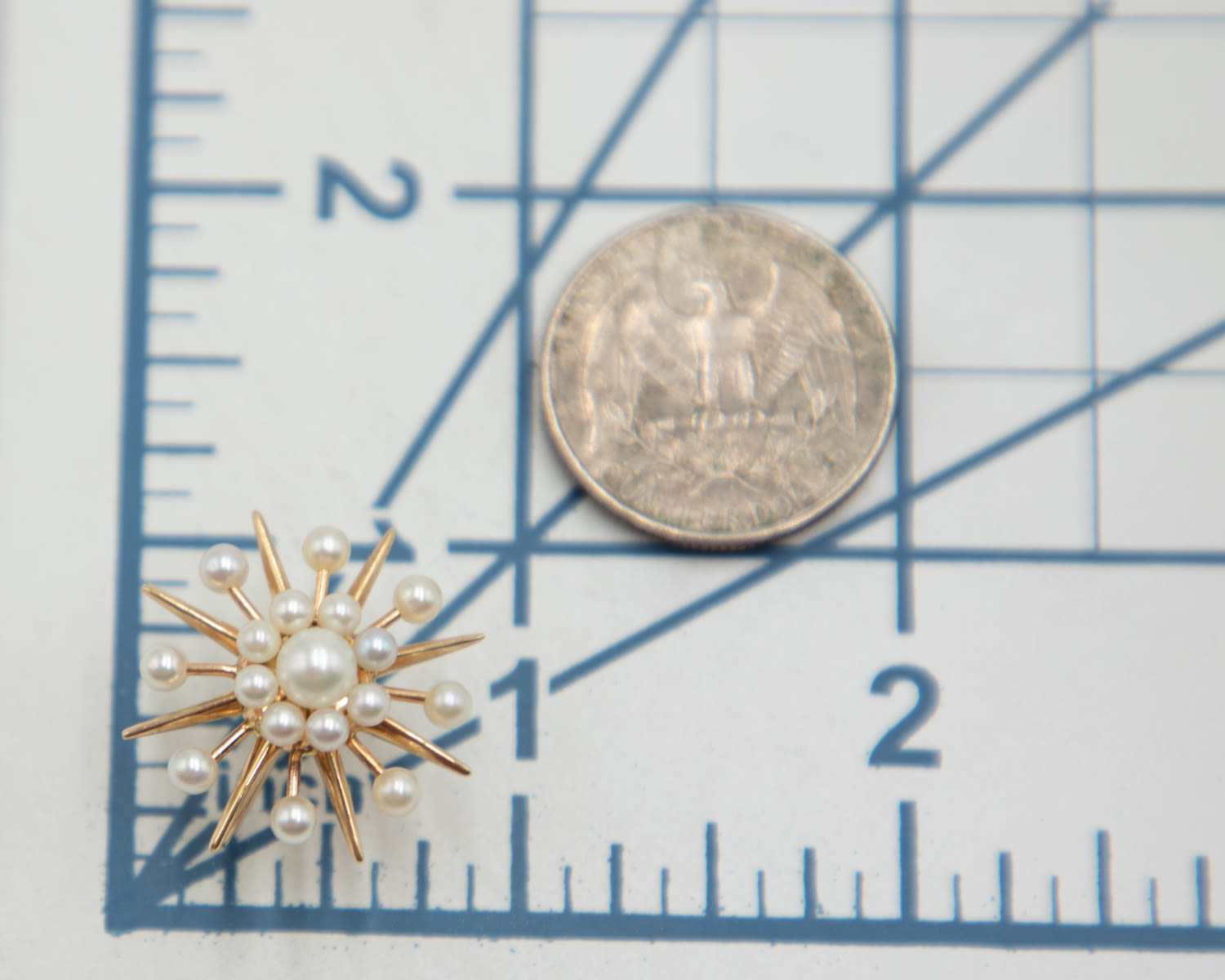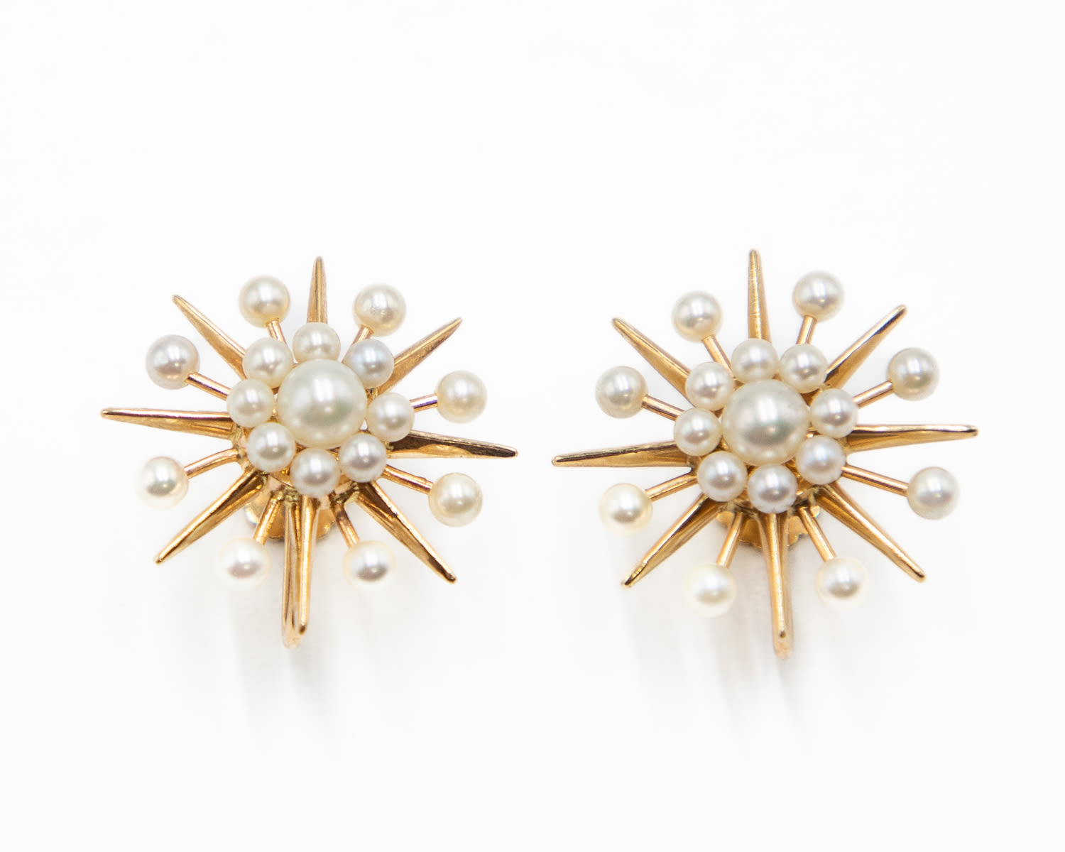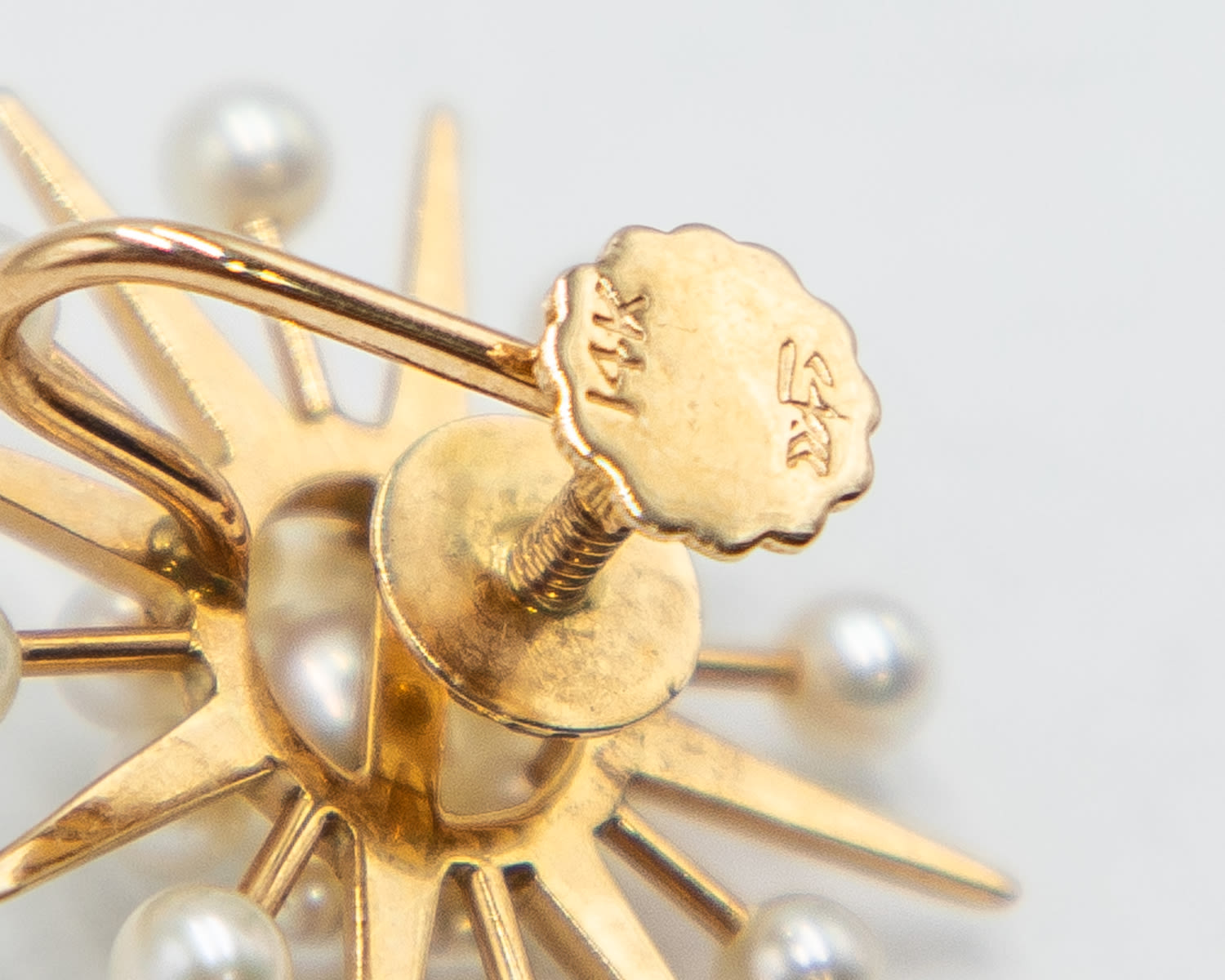Vintage Fisher & Co. 14k Cultured Pearl Starburst Screw Back Earrings 7.6g, Pictograph Signature Stamp