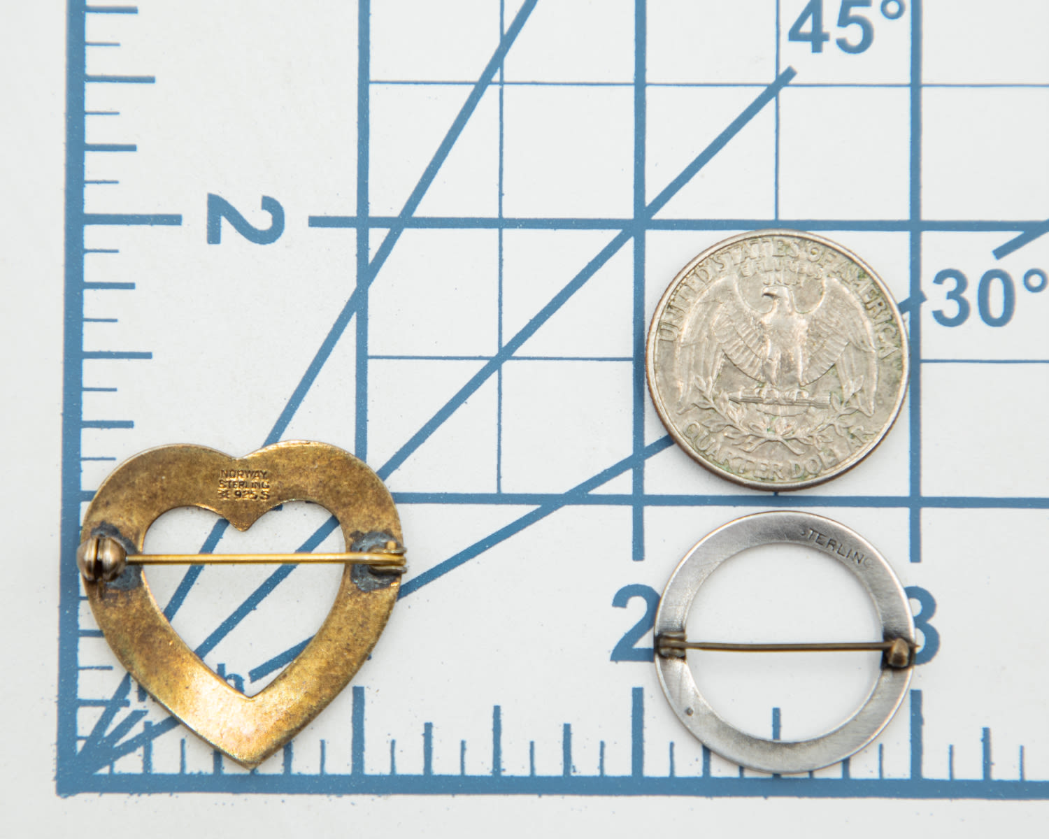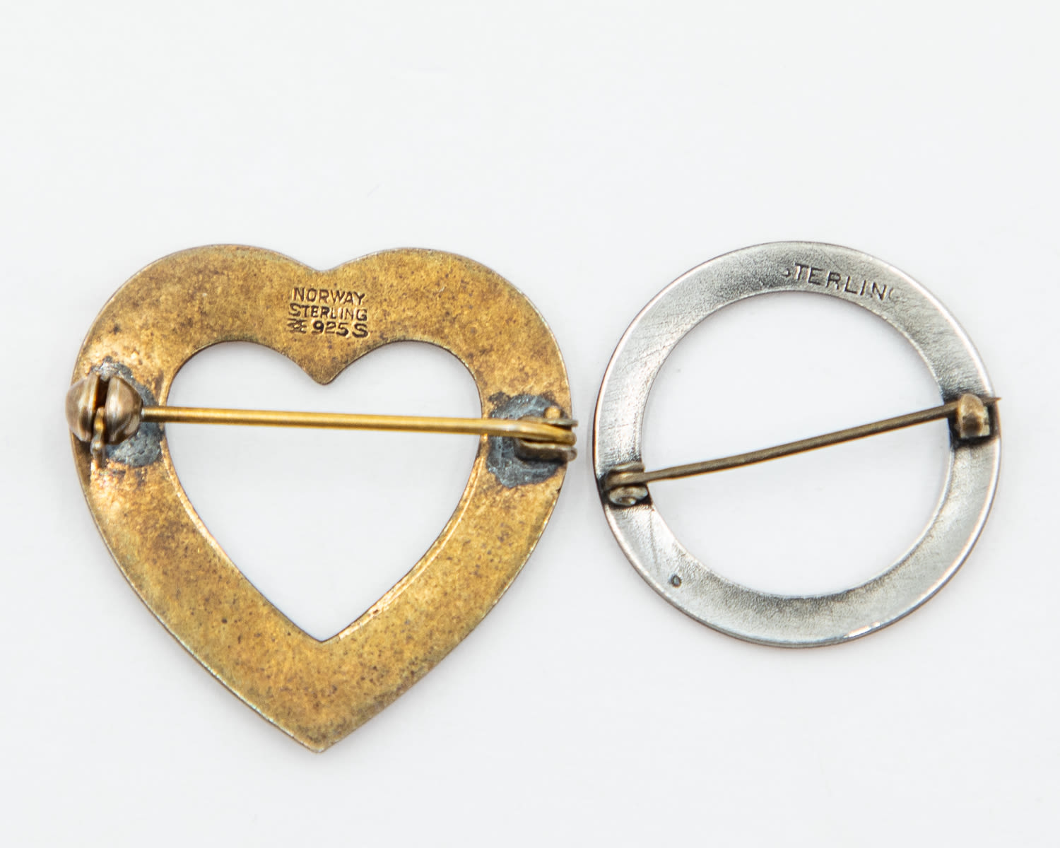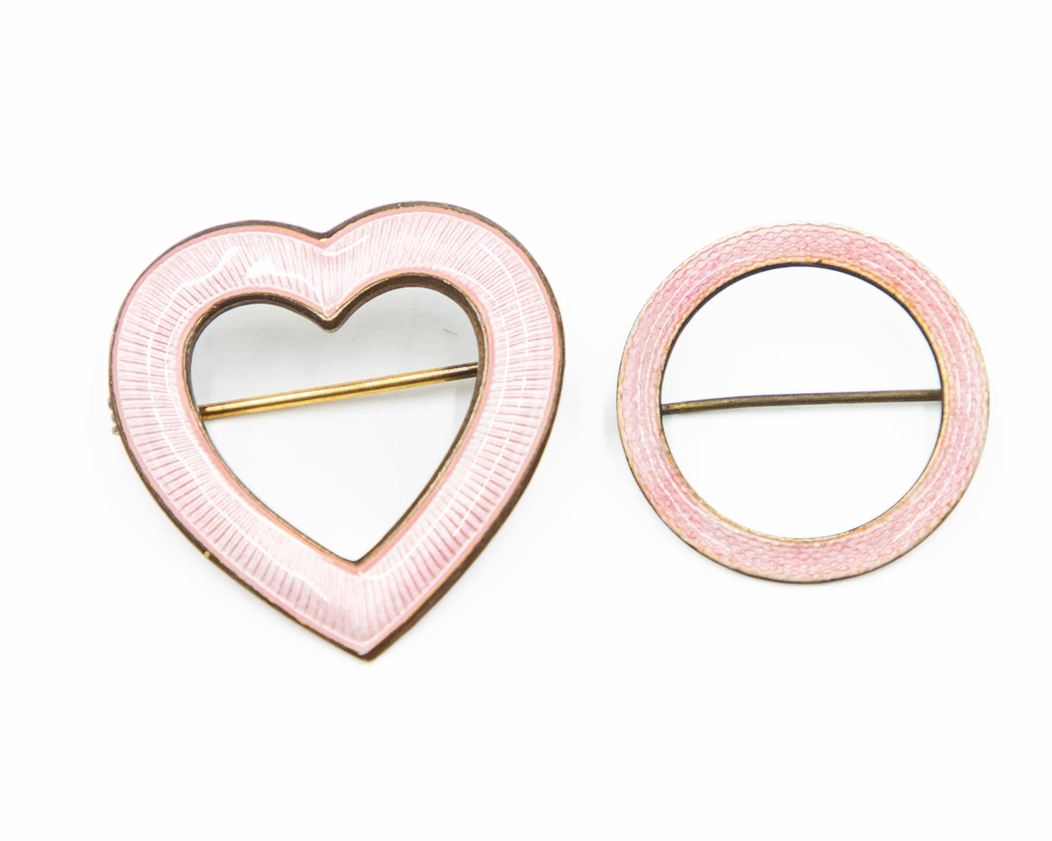 Aksel Holmsen Sterling Norway Pink Enamel Lot 2 Brooches 8g, Circle & Heart, Circle Unsigned