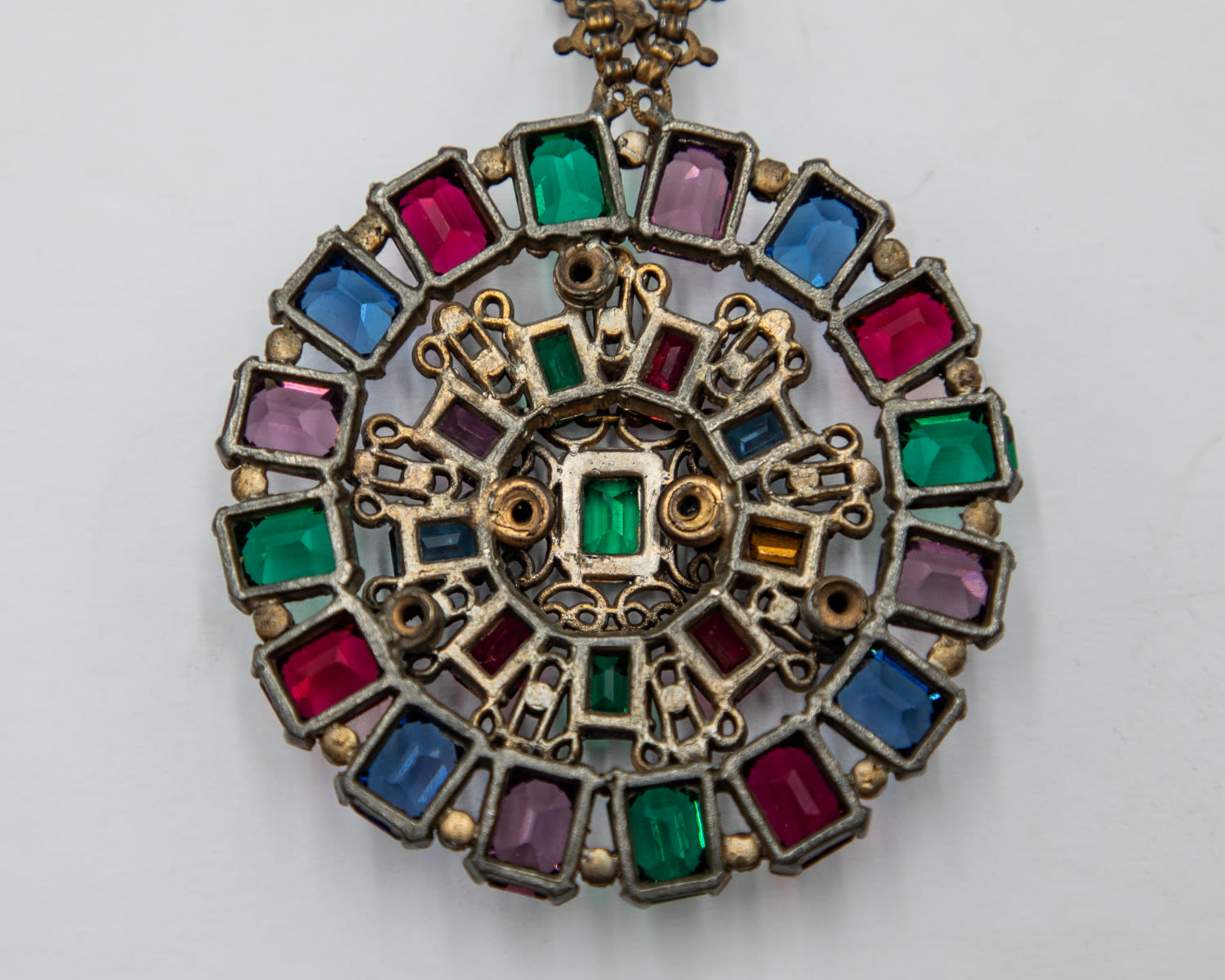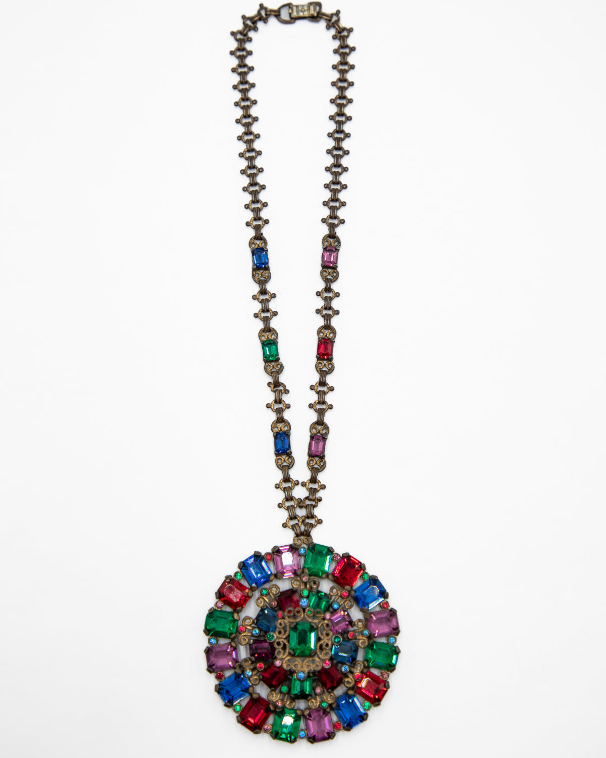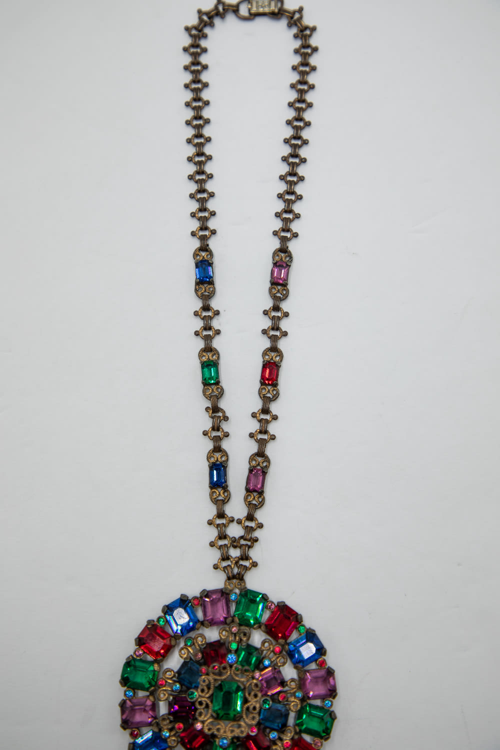 1920’s Czech Rhinestone Medallion NecklaceBeautiful floral stamping on original chain