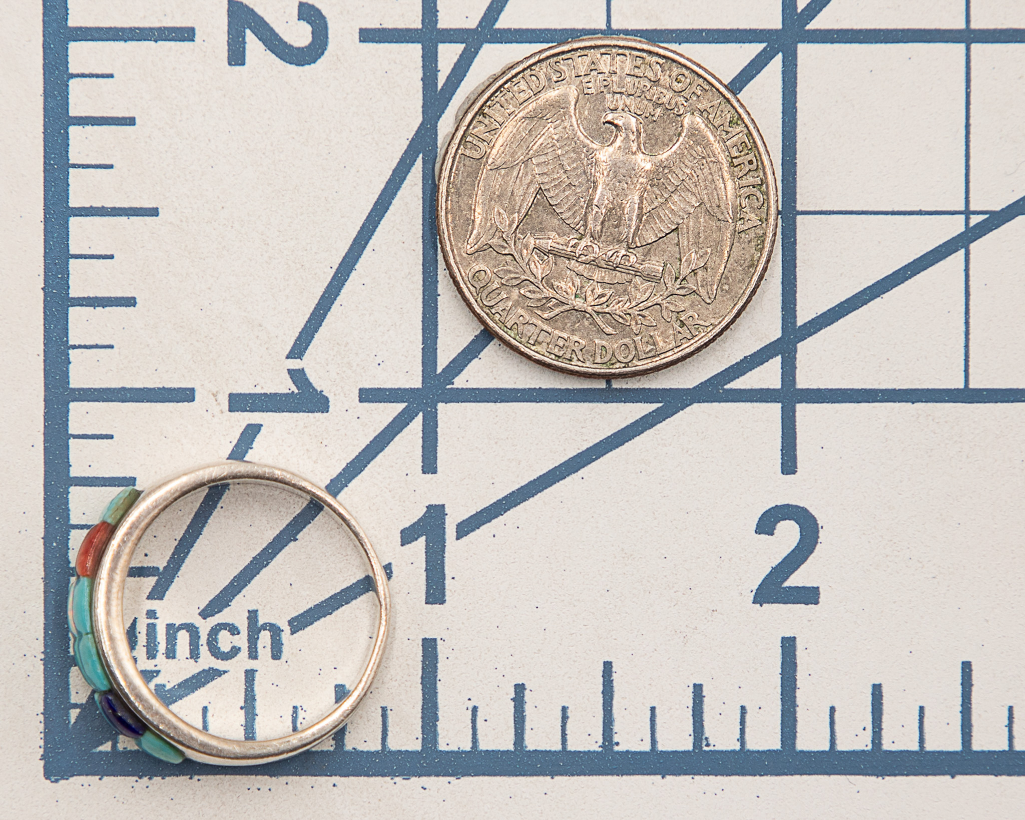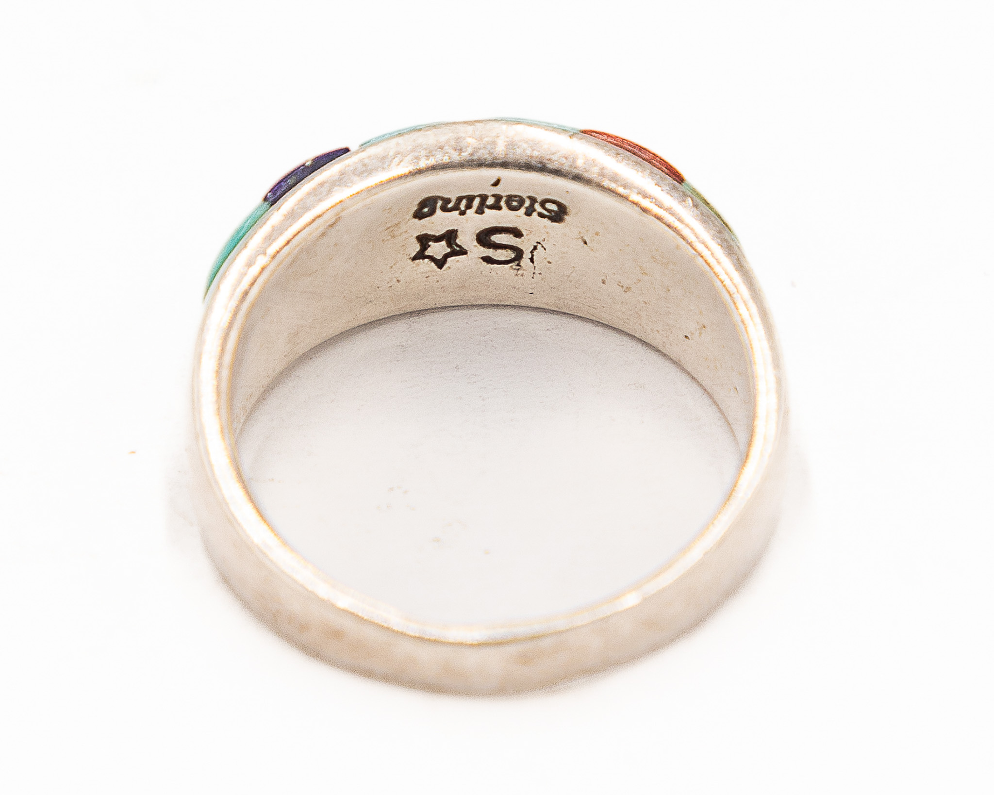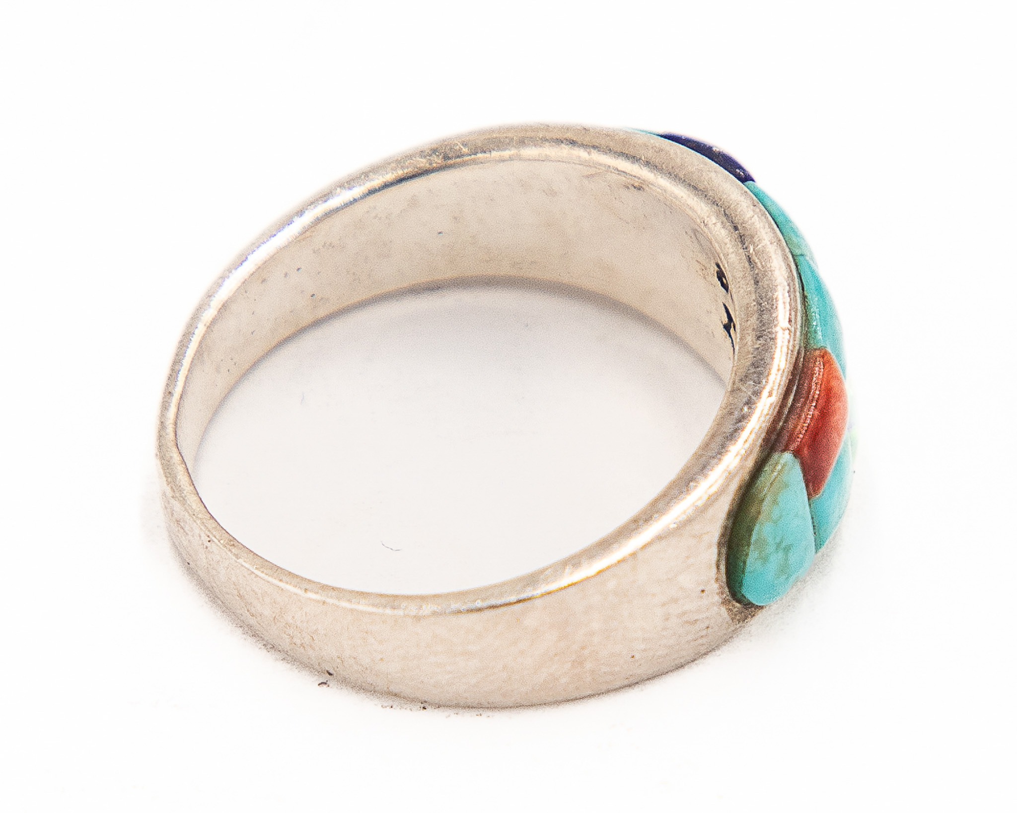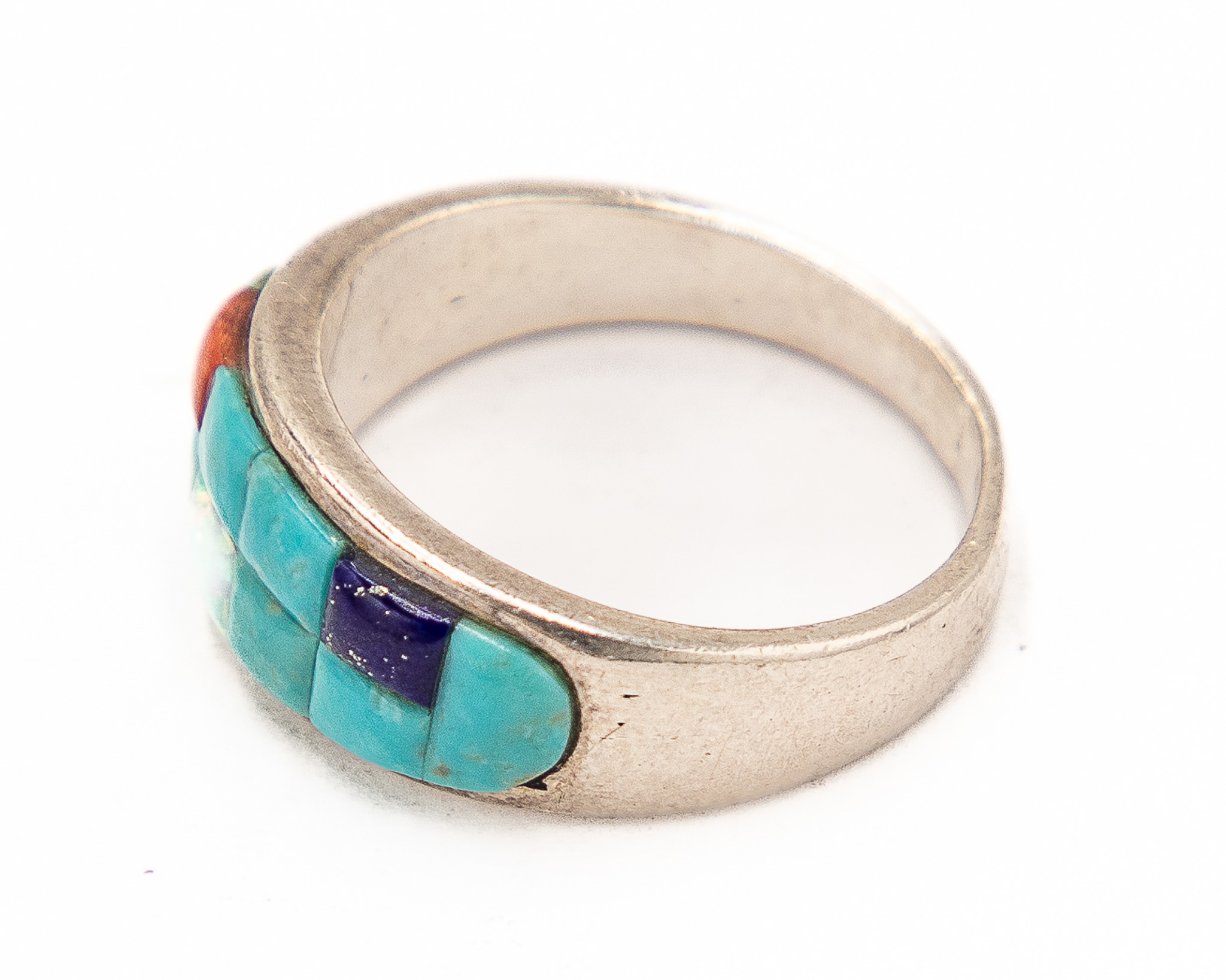 Zuni Style Sterling Cobblestone Inlay Ring Sz. 8, 5g-Pictograph Signature-Turquoise, Lapis, Synthetic Opal, Coral Stones