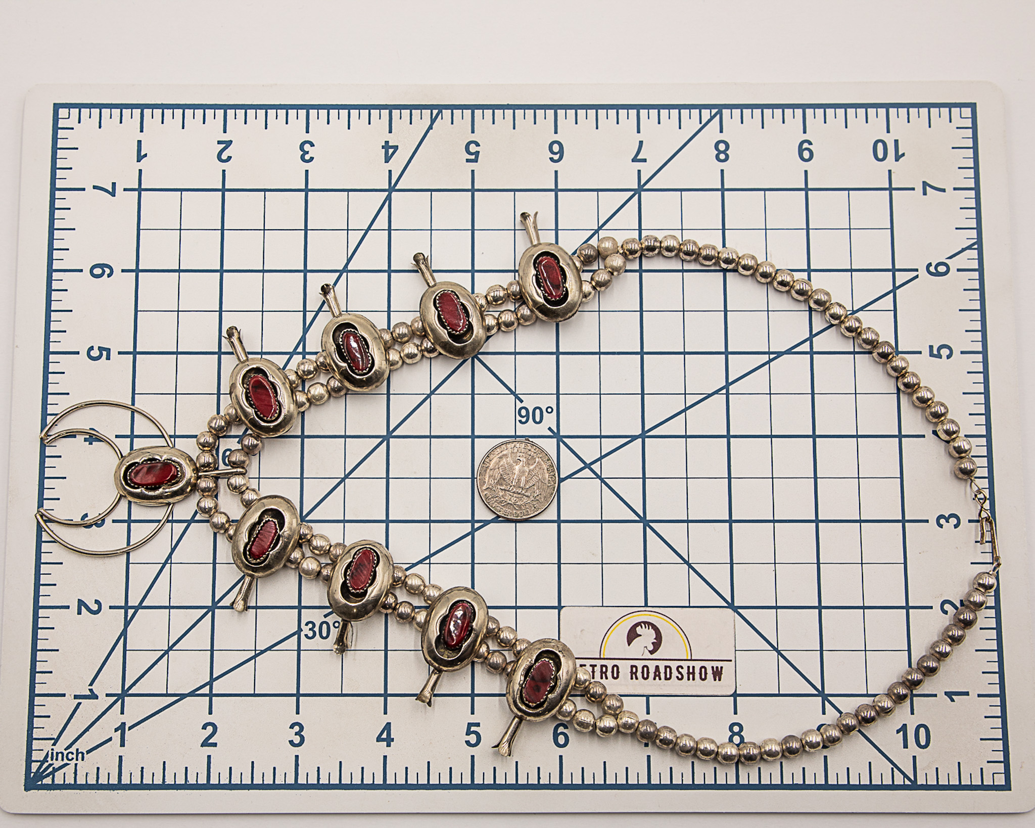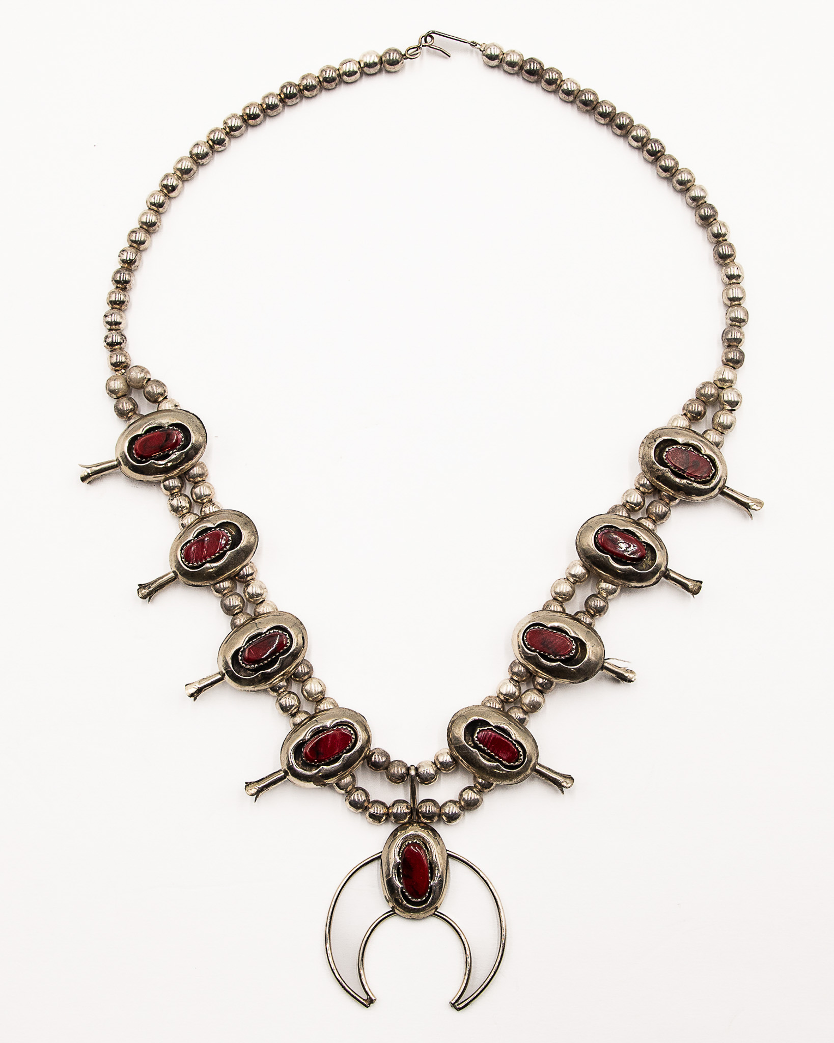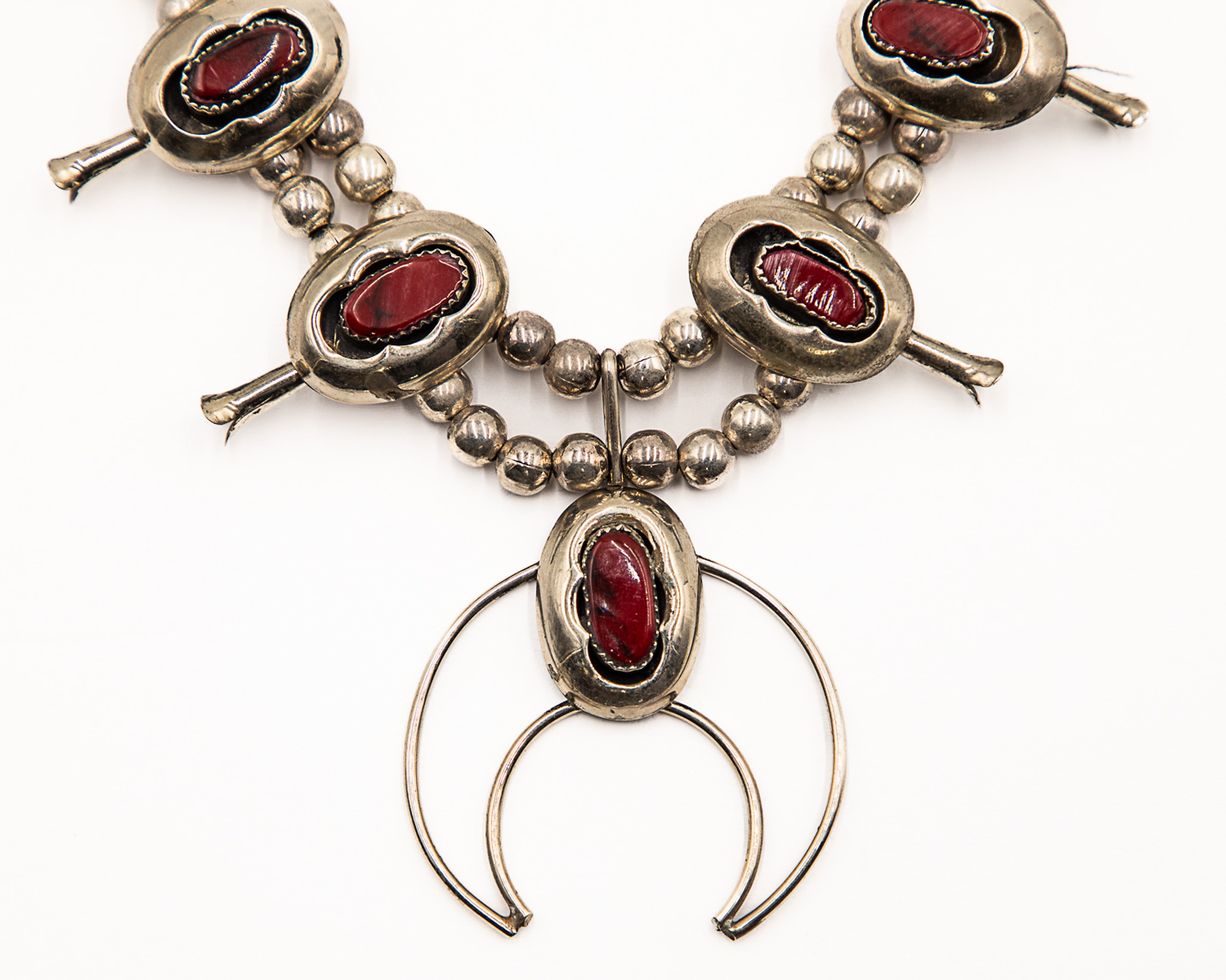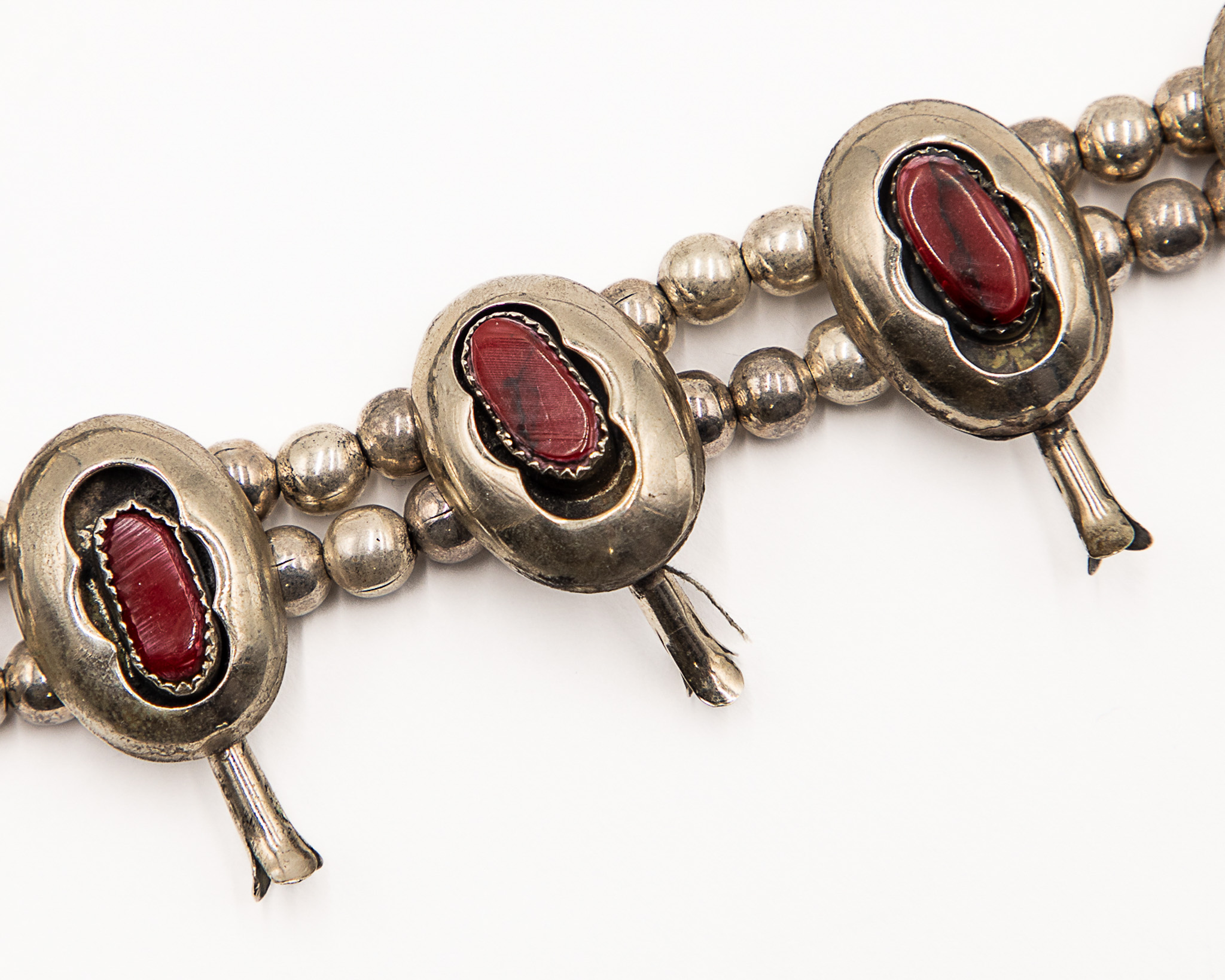 Signed DM Navajo Sterling Red Stone Black Veins Squash Blossom Necklace 91g