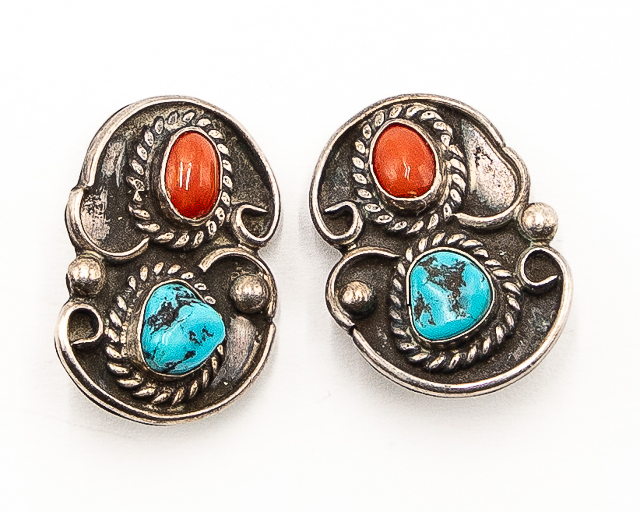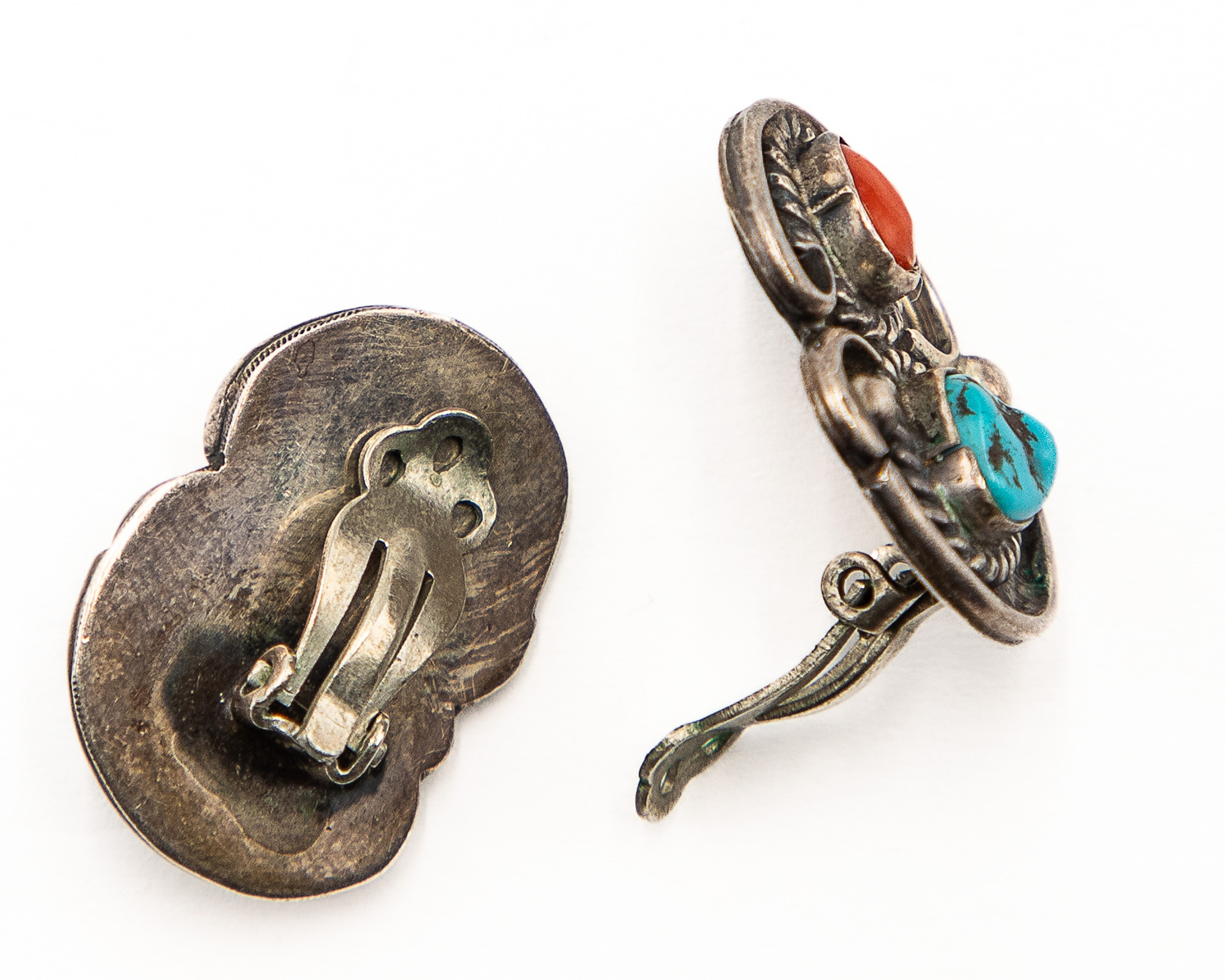 Vintage Navajo Sterling Turquoise Coral Clip On Earrings 10.5g