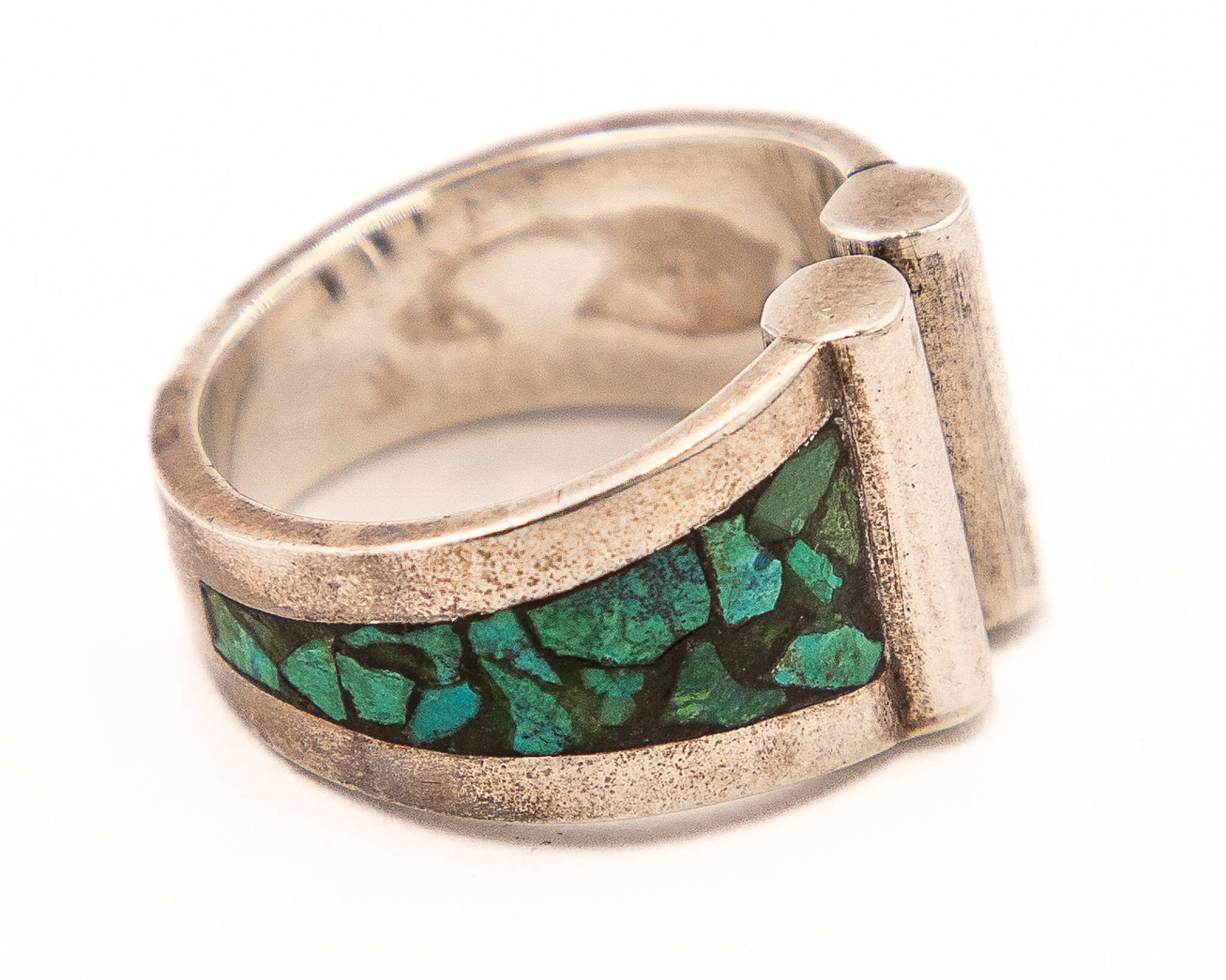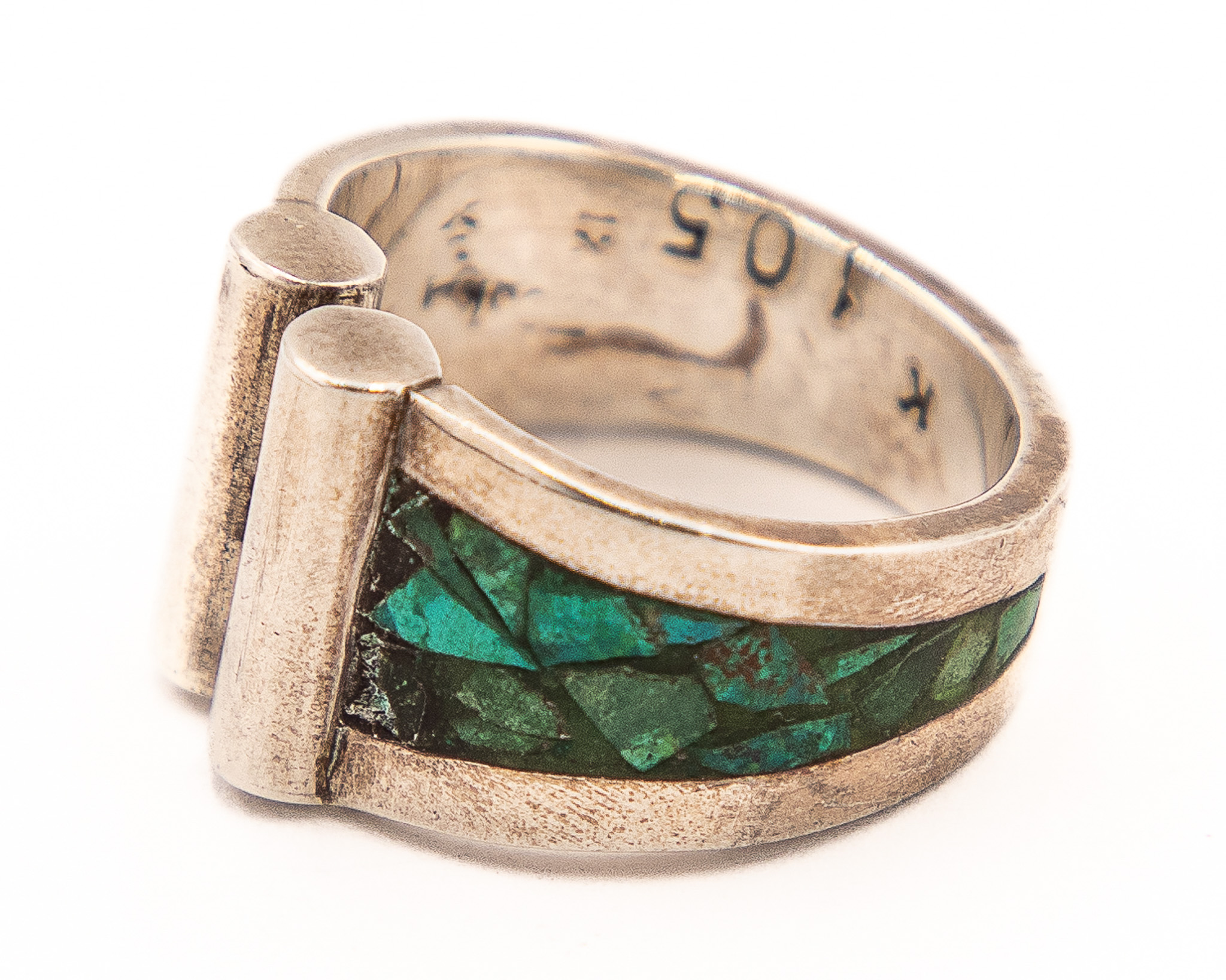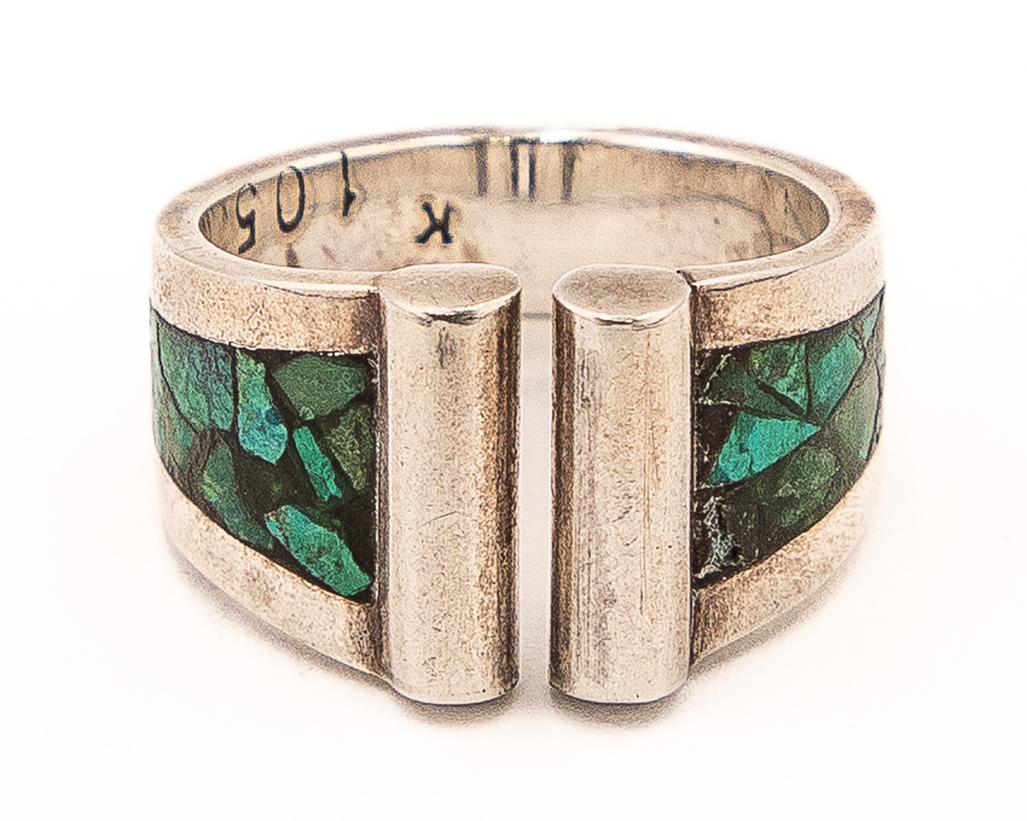 Signed K maybe Kathy Secataro Crushed Green Turquoise Sterling Ring As Is Sz. 9, 8.5g-105 stamped-Chips in stone As is
