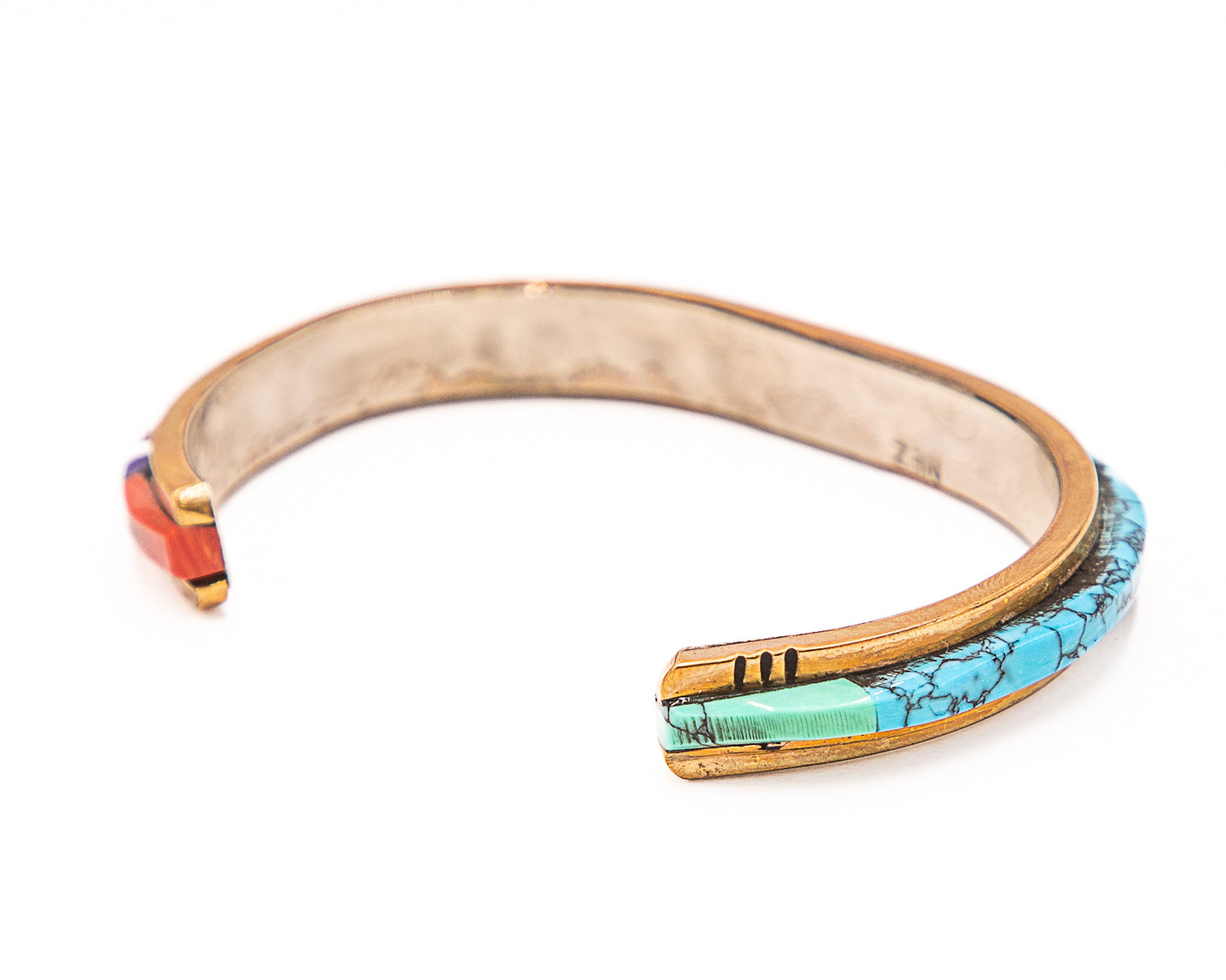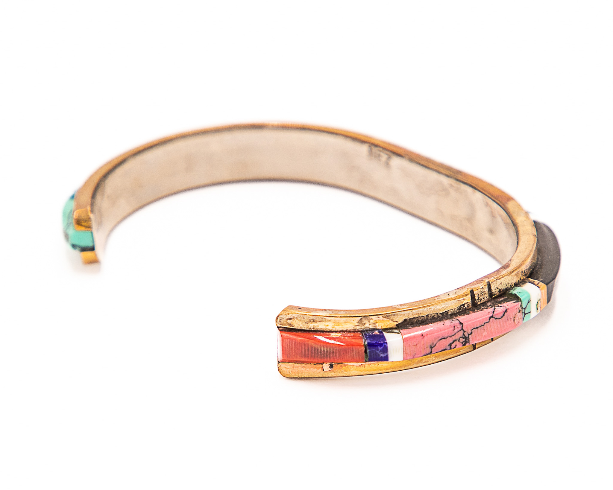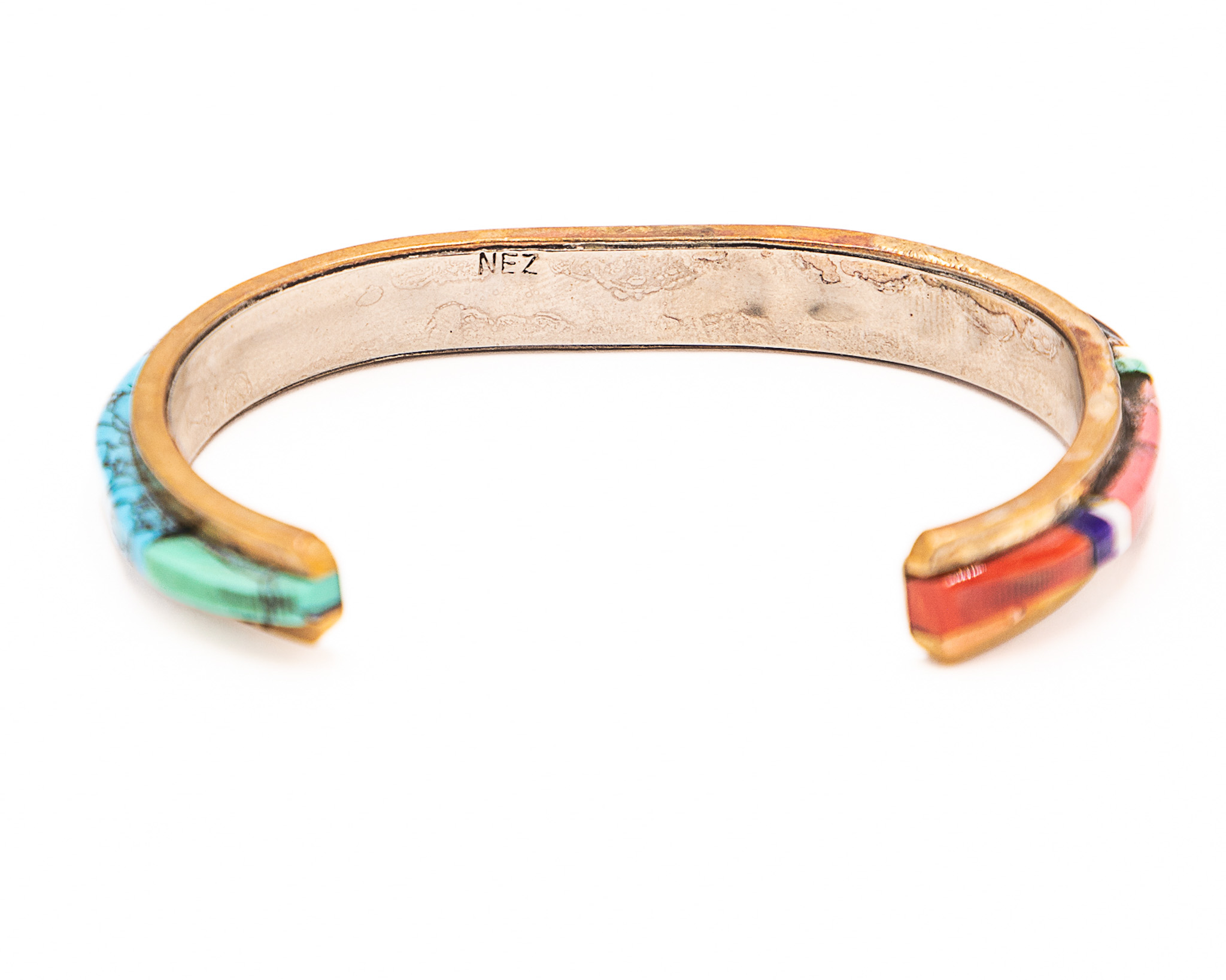 NEZ Jewelry Multi Stone Raised Inlay Sterling Cuff Bracelet 25g-Coral, azurite, white buffalo, turquoise, spiny oyster, jet, rhodonite