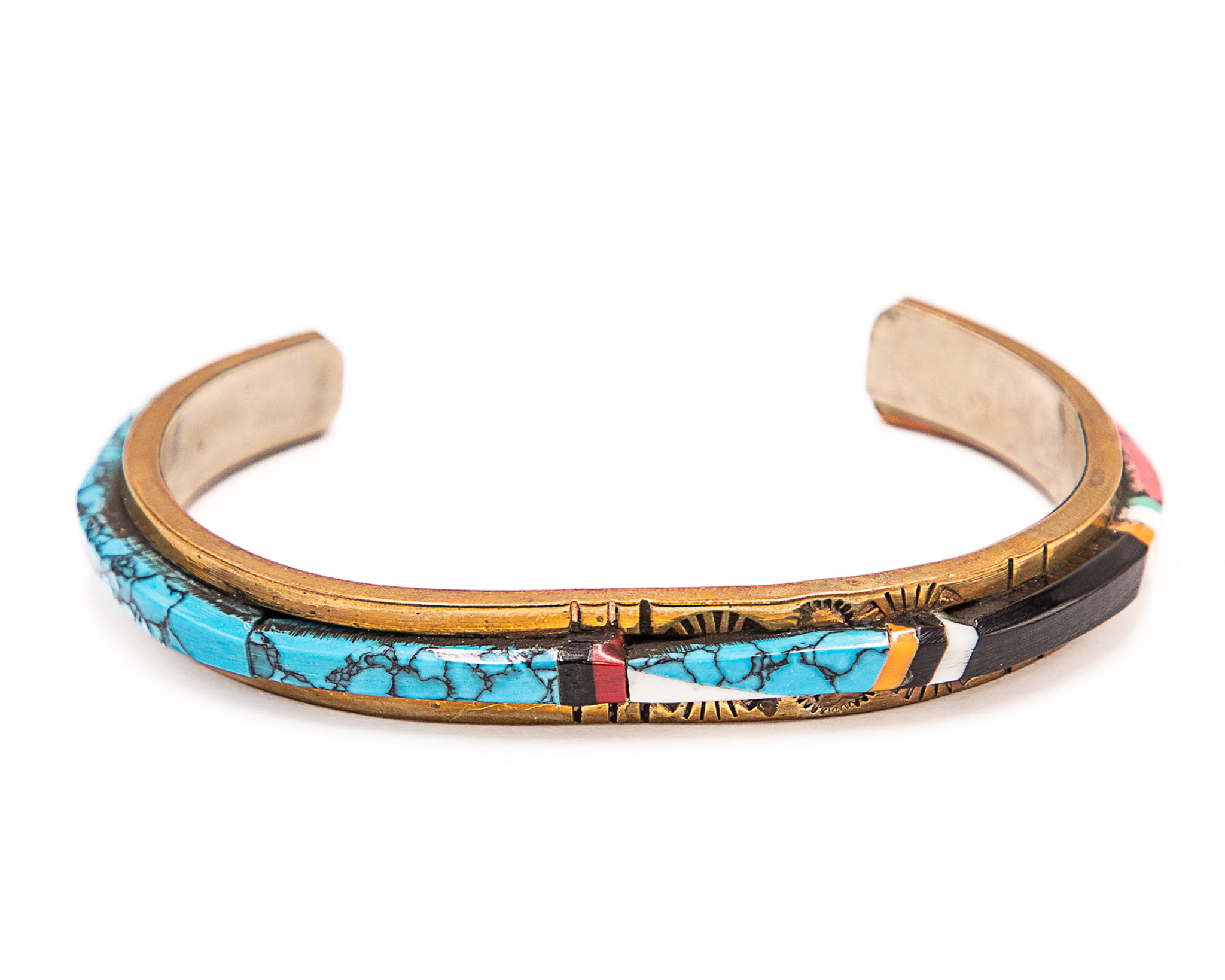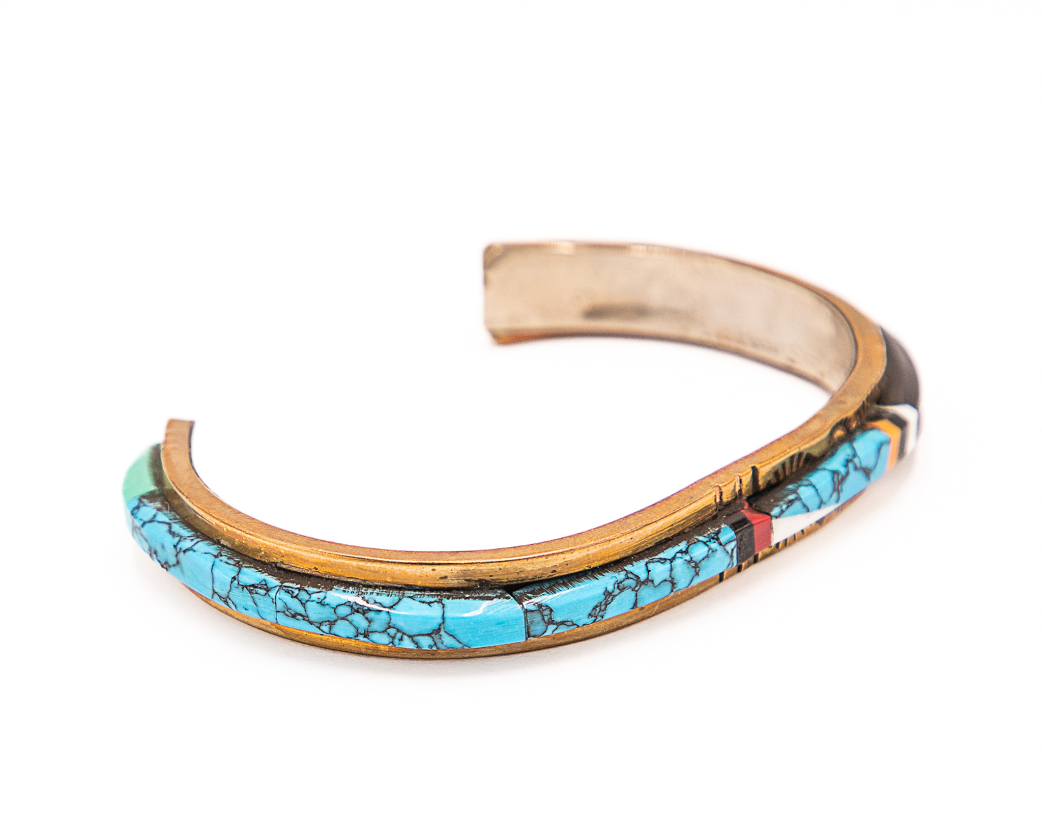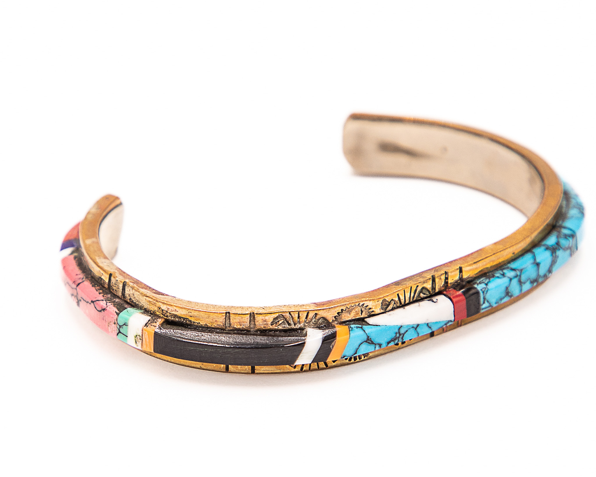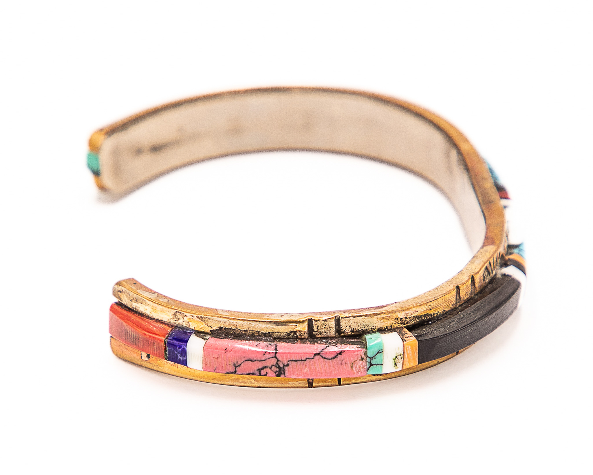 NEZ Jewelry Multi Stone Raised Inlay Sterling Cuff Bracelet 25g-Coral, azurite, white buffalo, turquoise, spiny oyster, jet, rhodonite