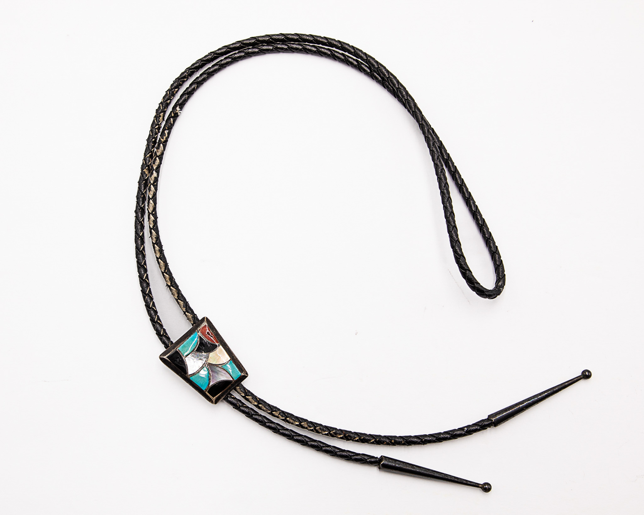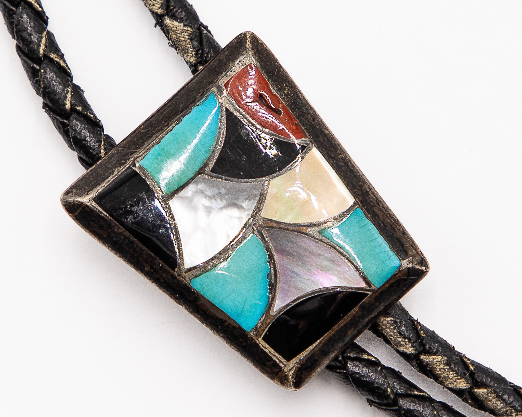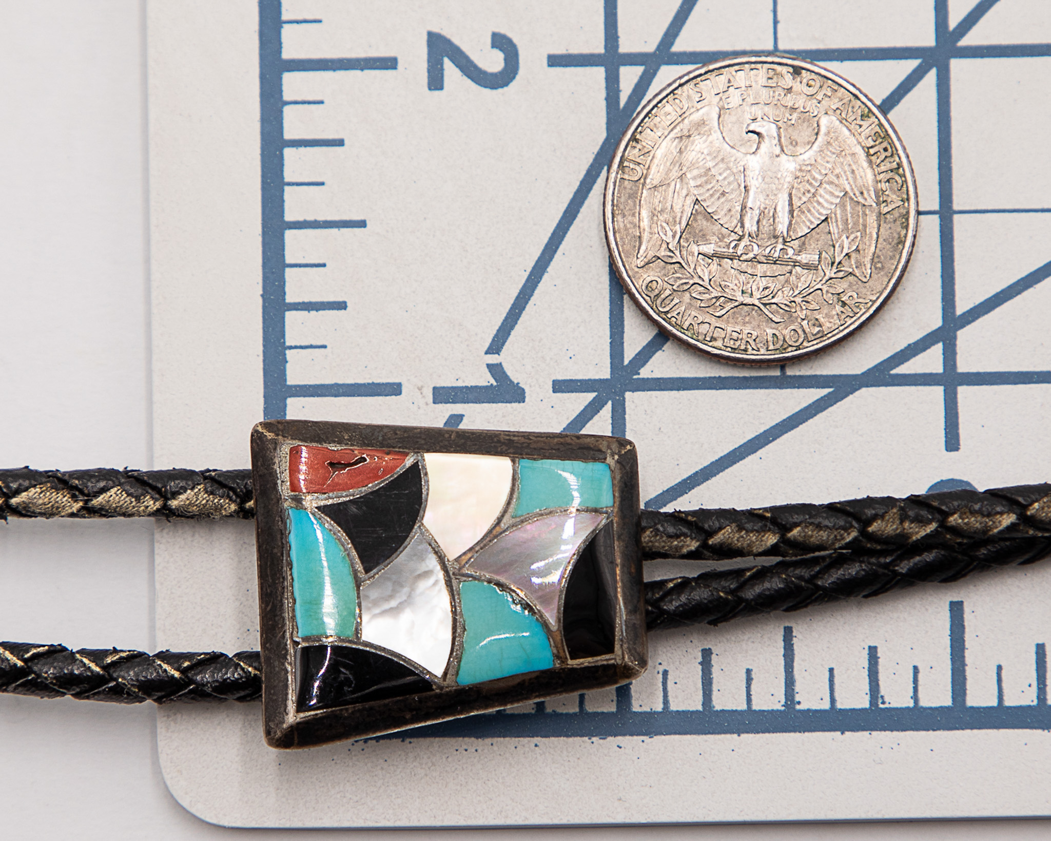 Signed Zuni Sterling Jet Mother Of Pearl Turquoise Coral Bolo Tie 21g