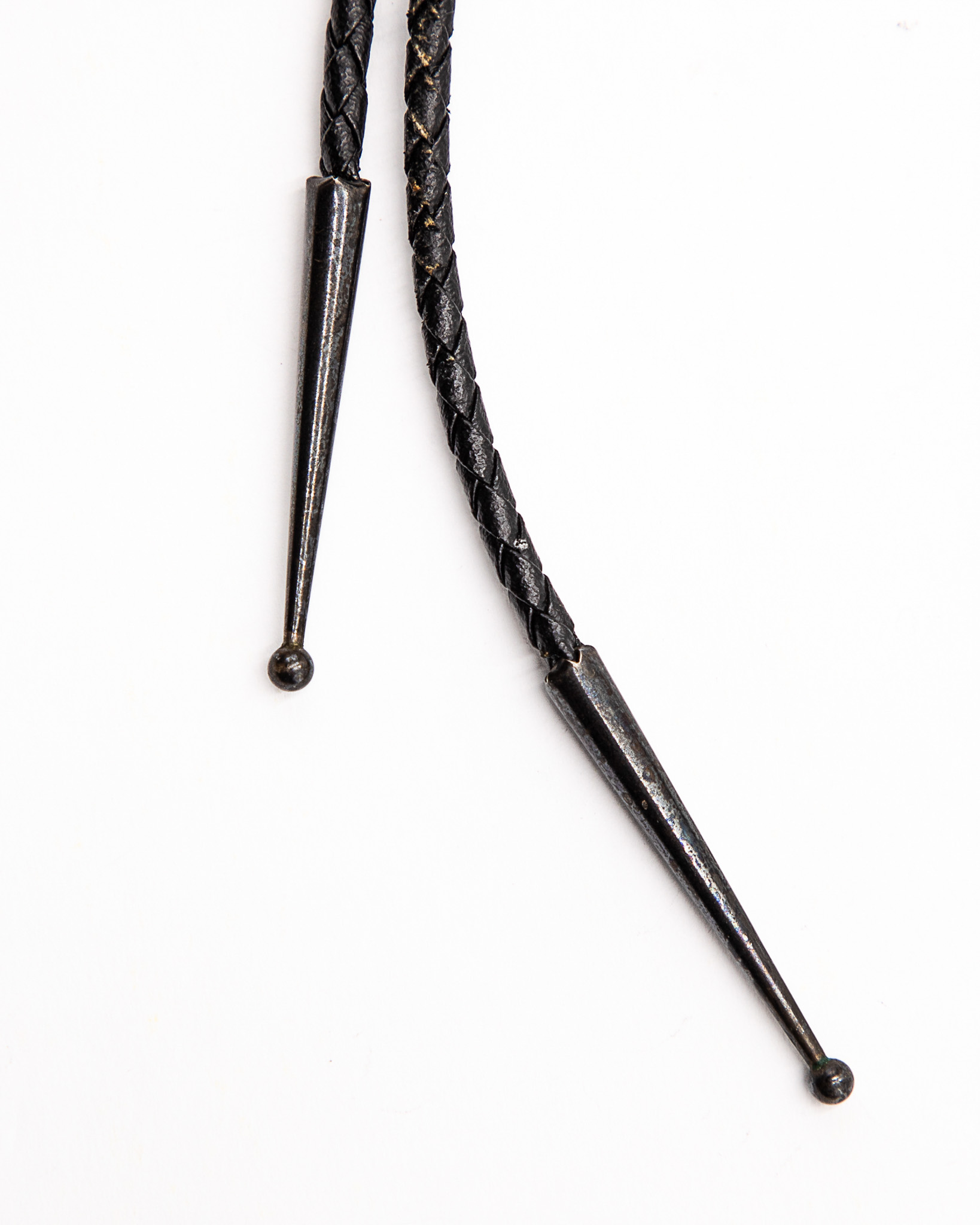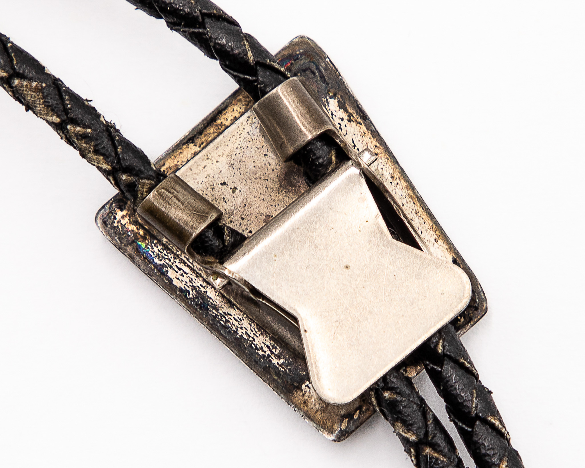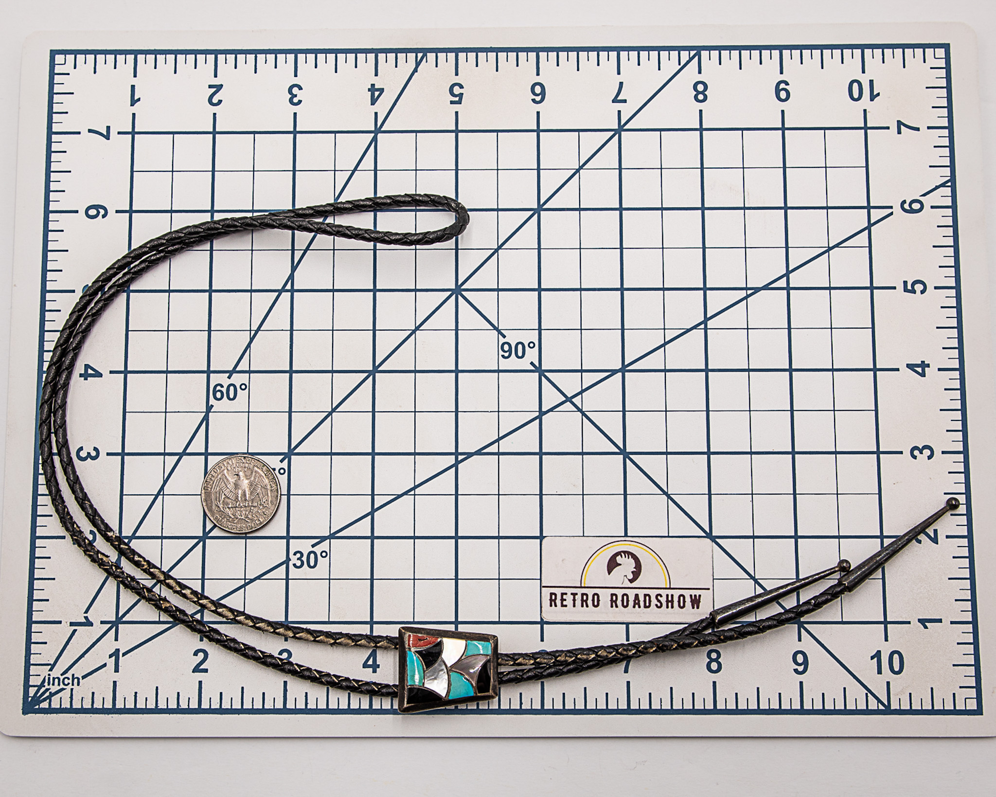 Signed Zuni Sterling Jet Mother Of Pearl Turquoise Coral Bolo Tie 21g