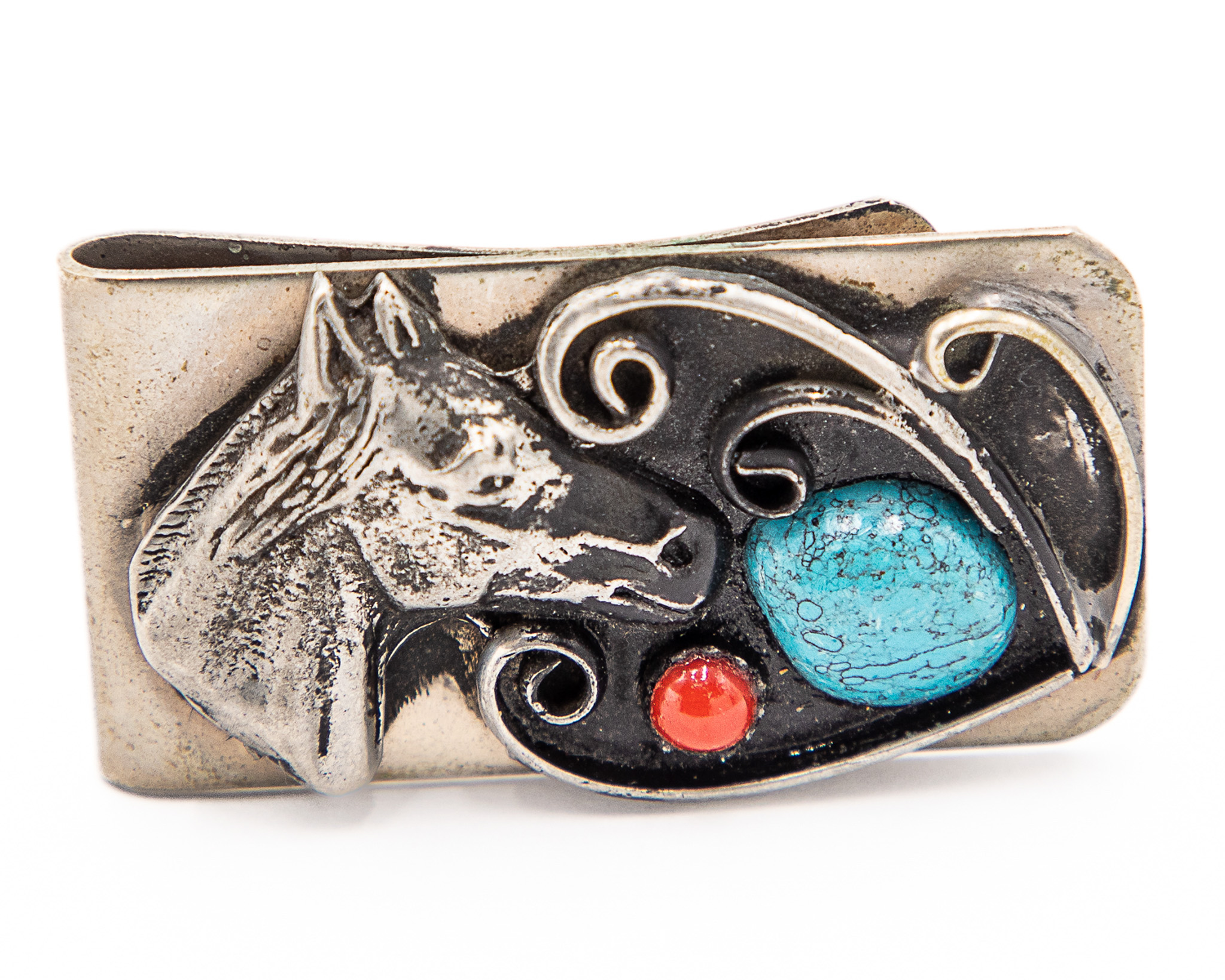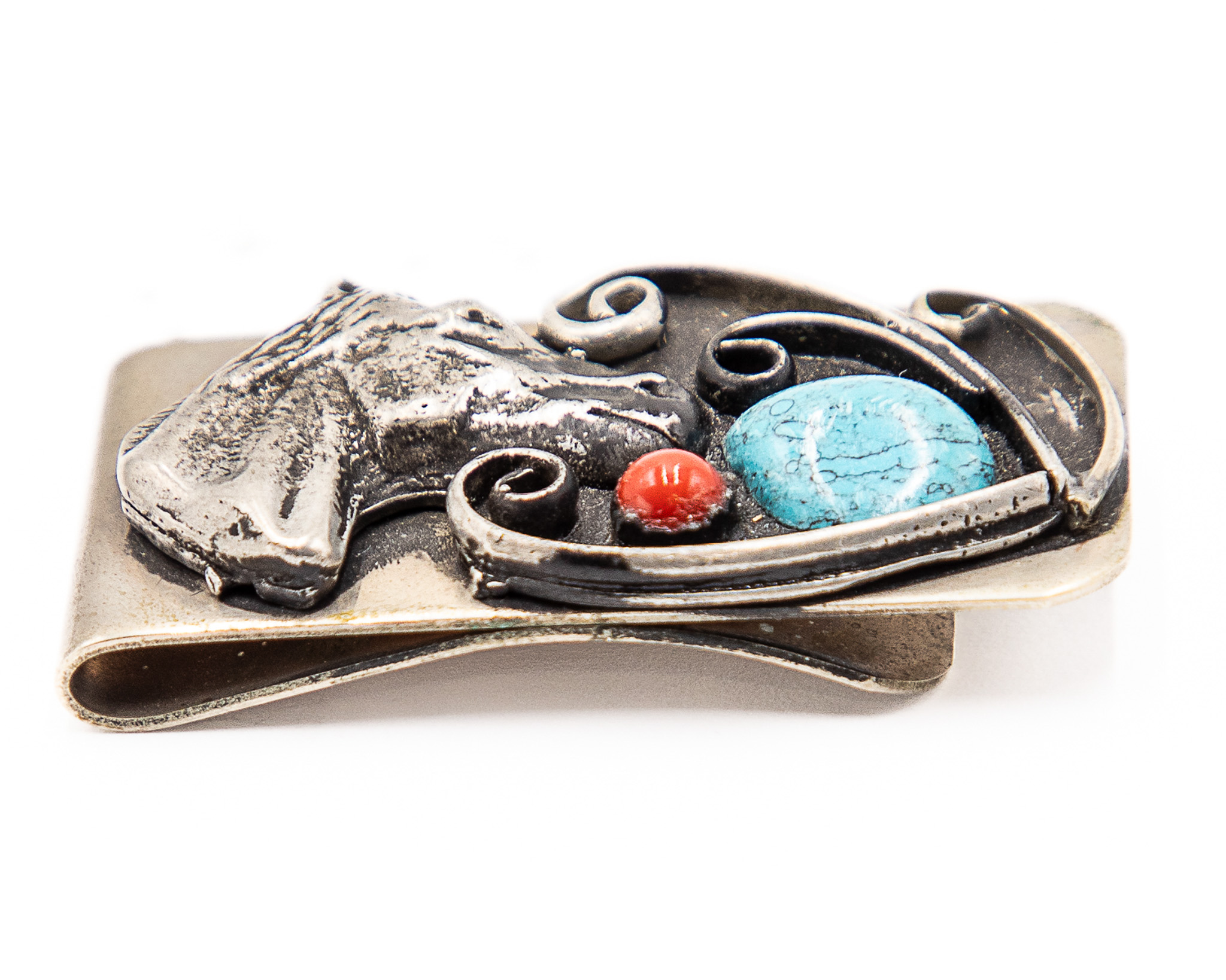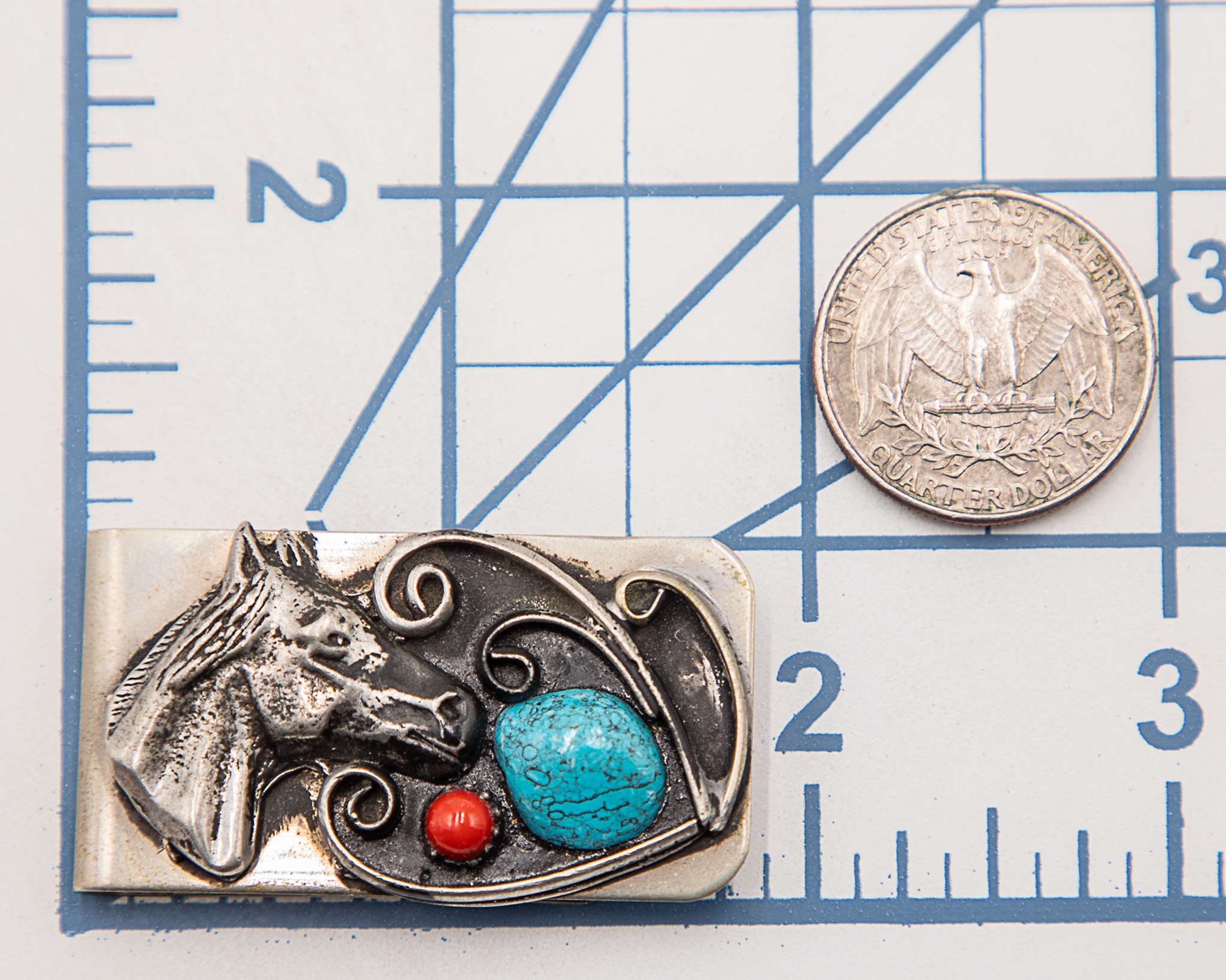 Vintage Navajo Turquoise Snake Eye Coral Sterling Money Clip 29g
