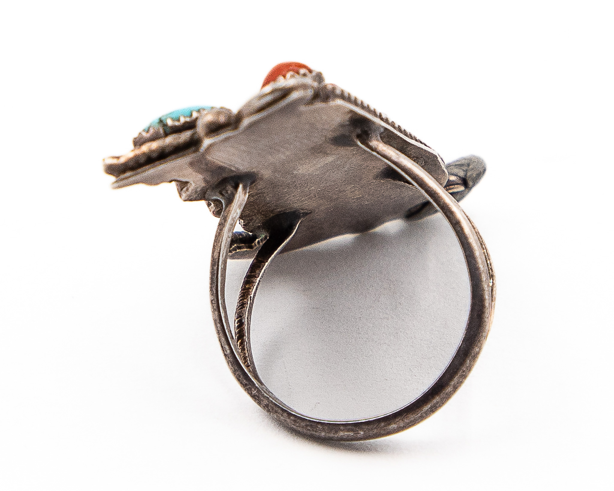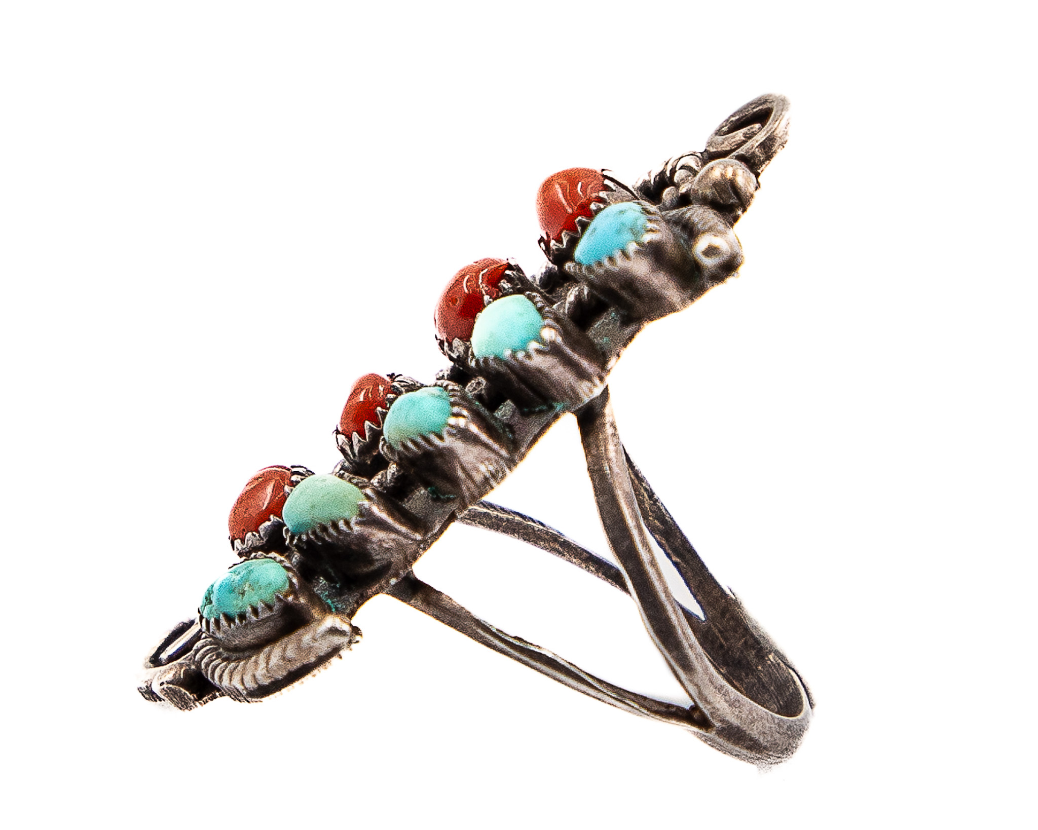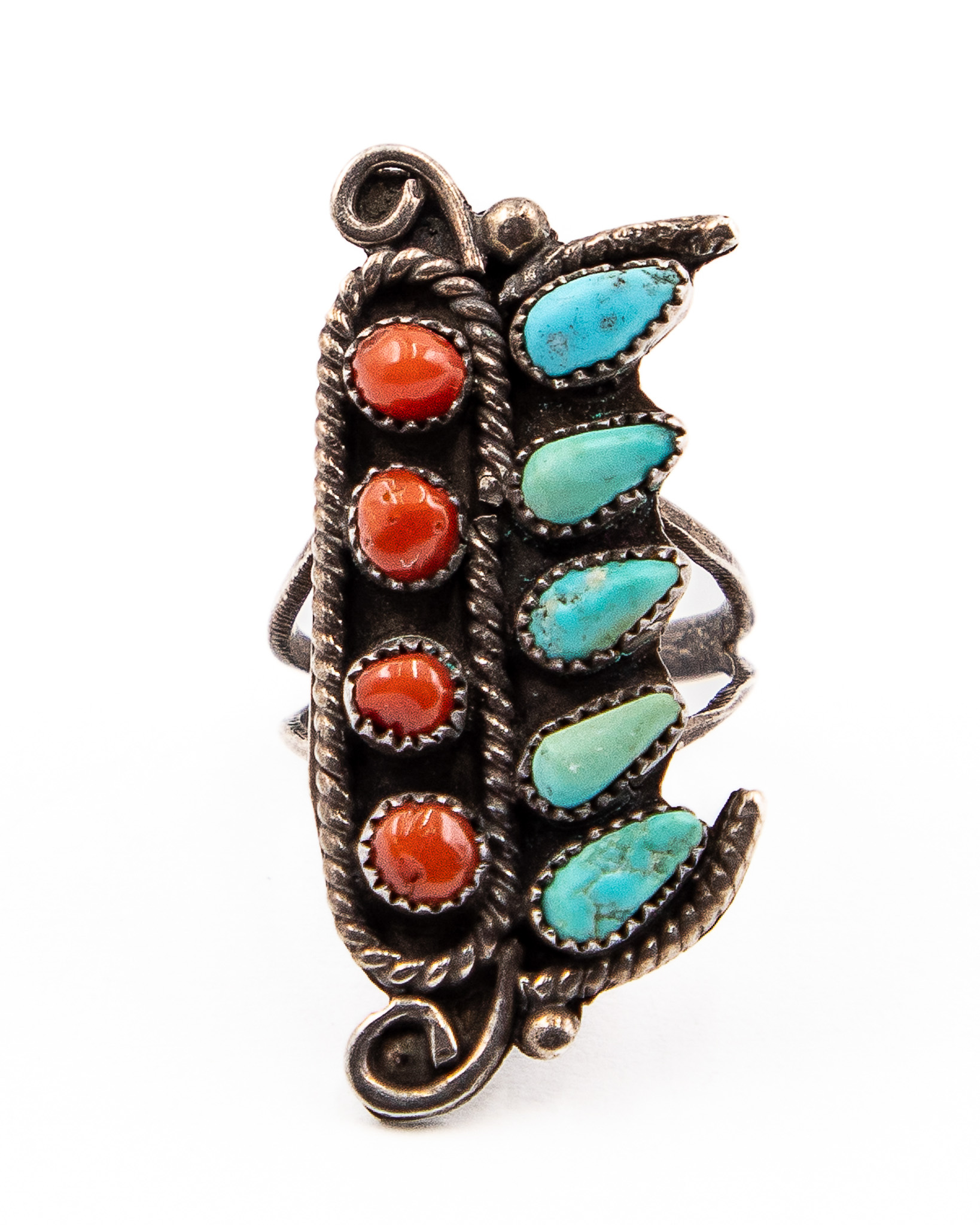 Signed M Or W Vintage Navajo Sterling Petit Point Turquoise Snake Eye Coral Ring Sz. 7, 7g