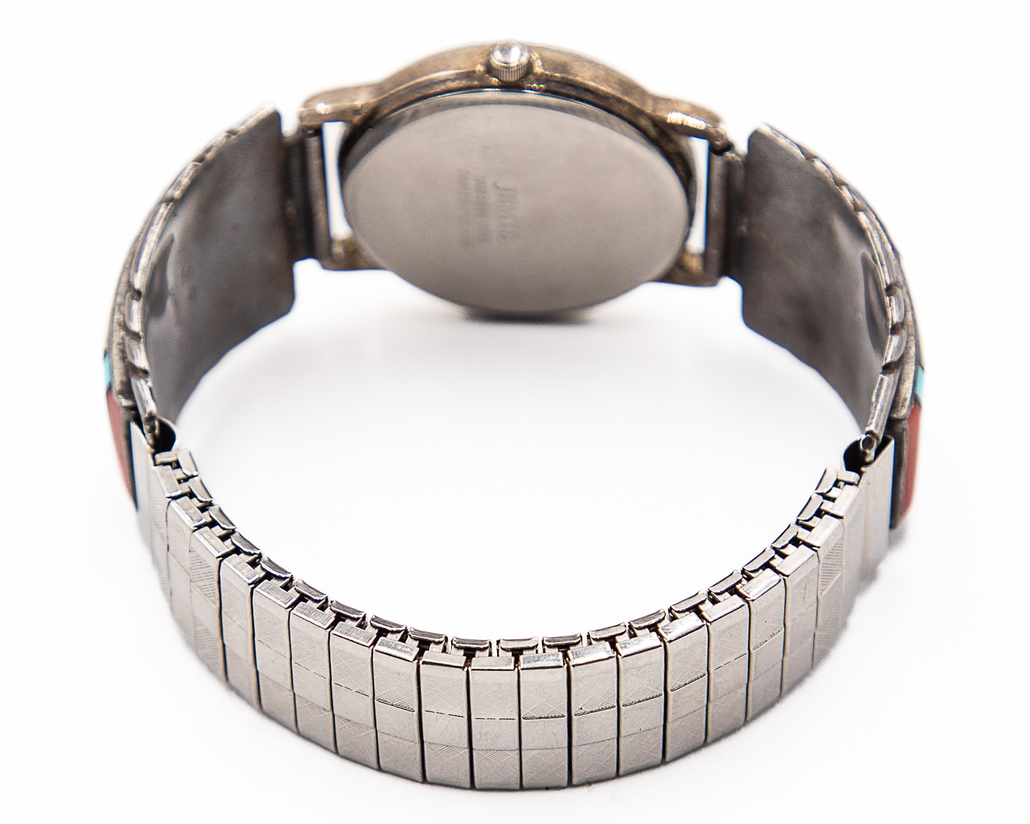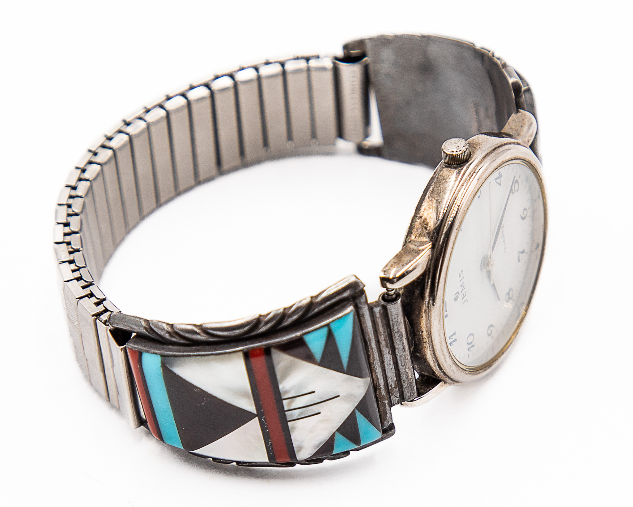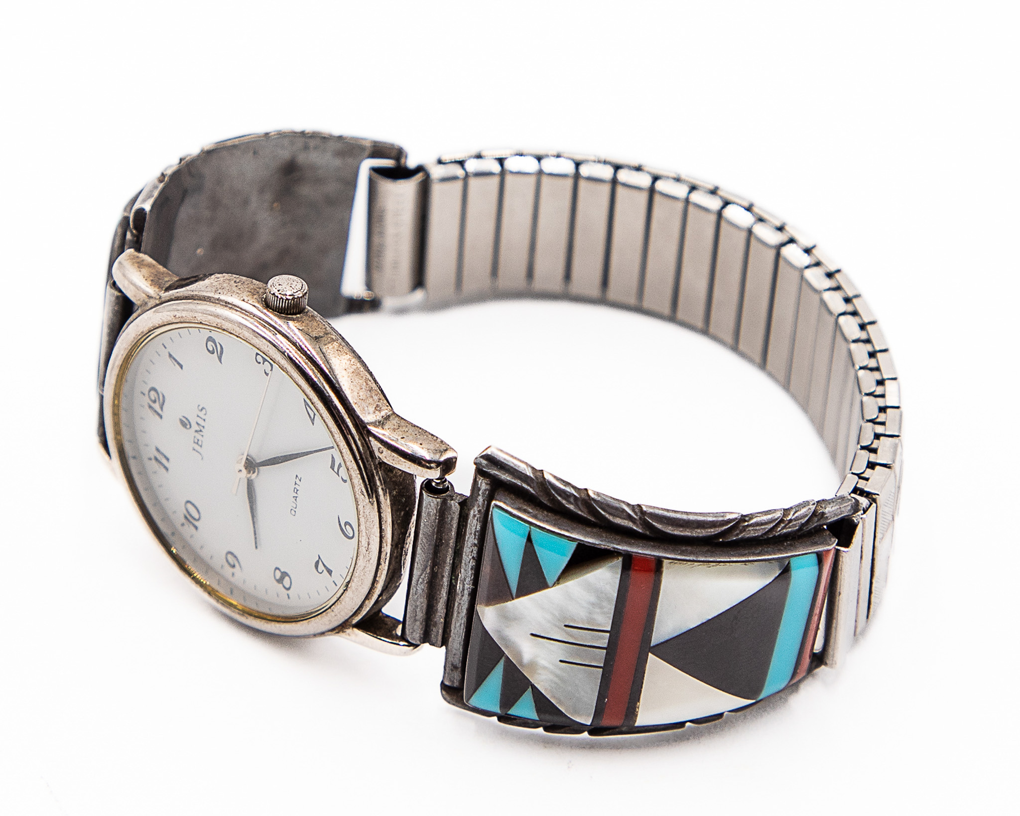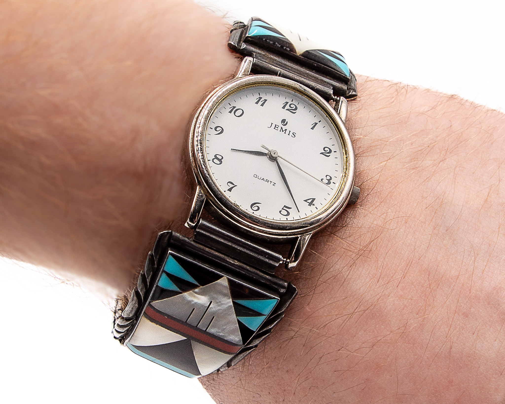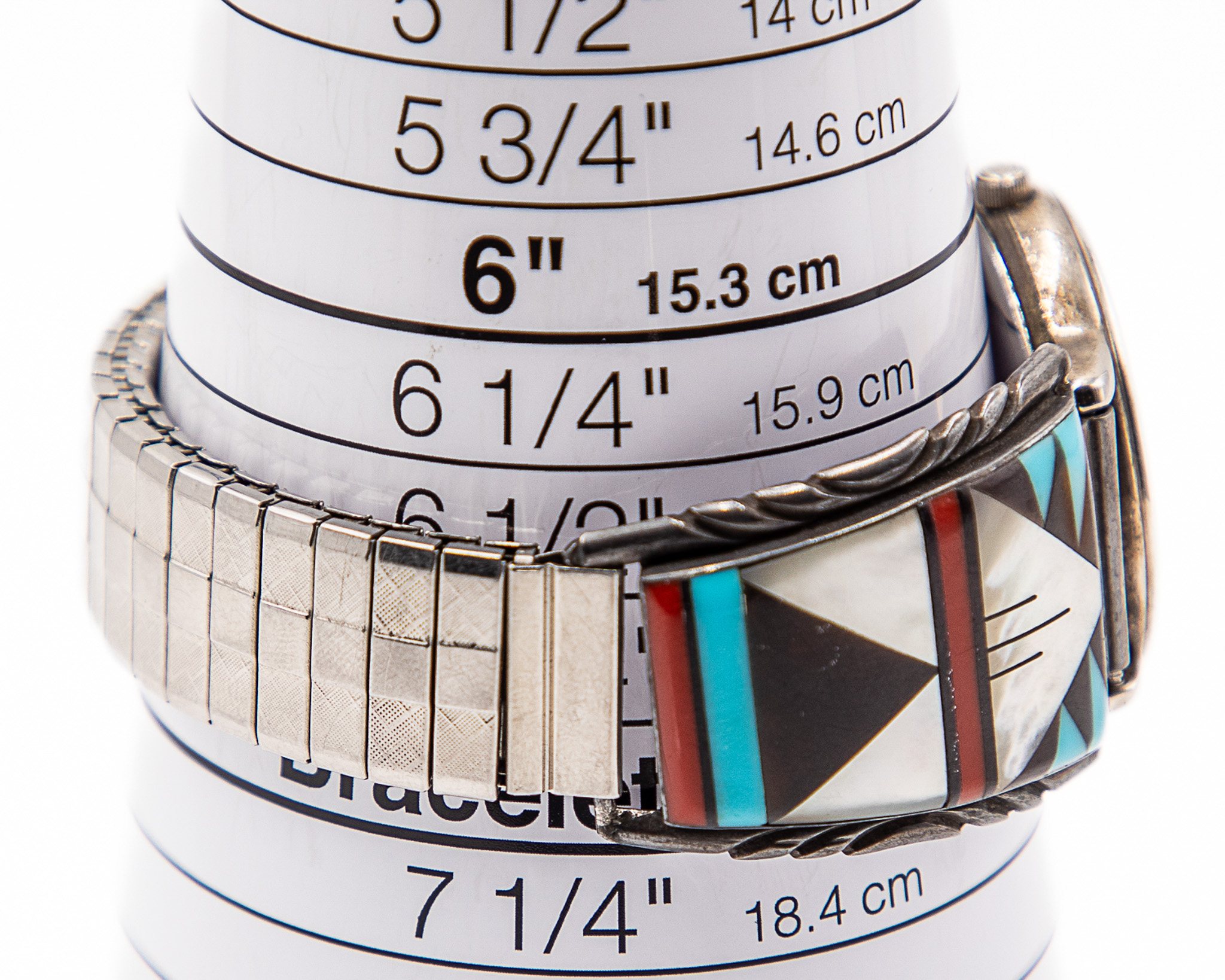 Signed Zuni Sterling Jet Mother Of Pearl Coral Turquoise Inlay Watch Cuffs And Watch Nibs 55.5g