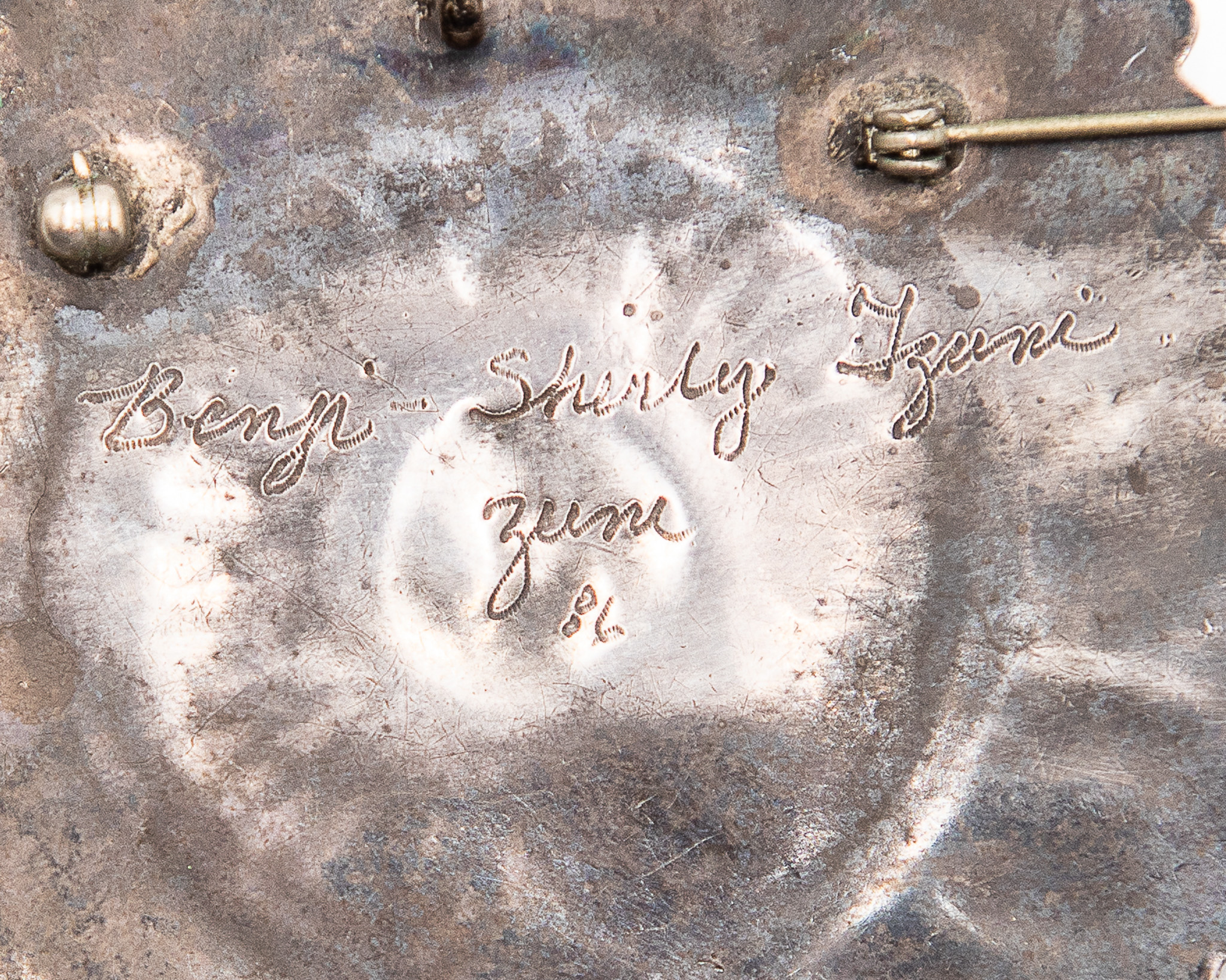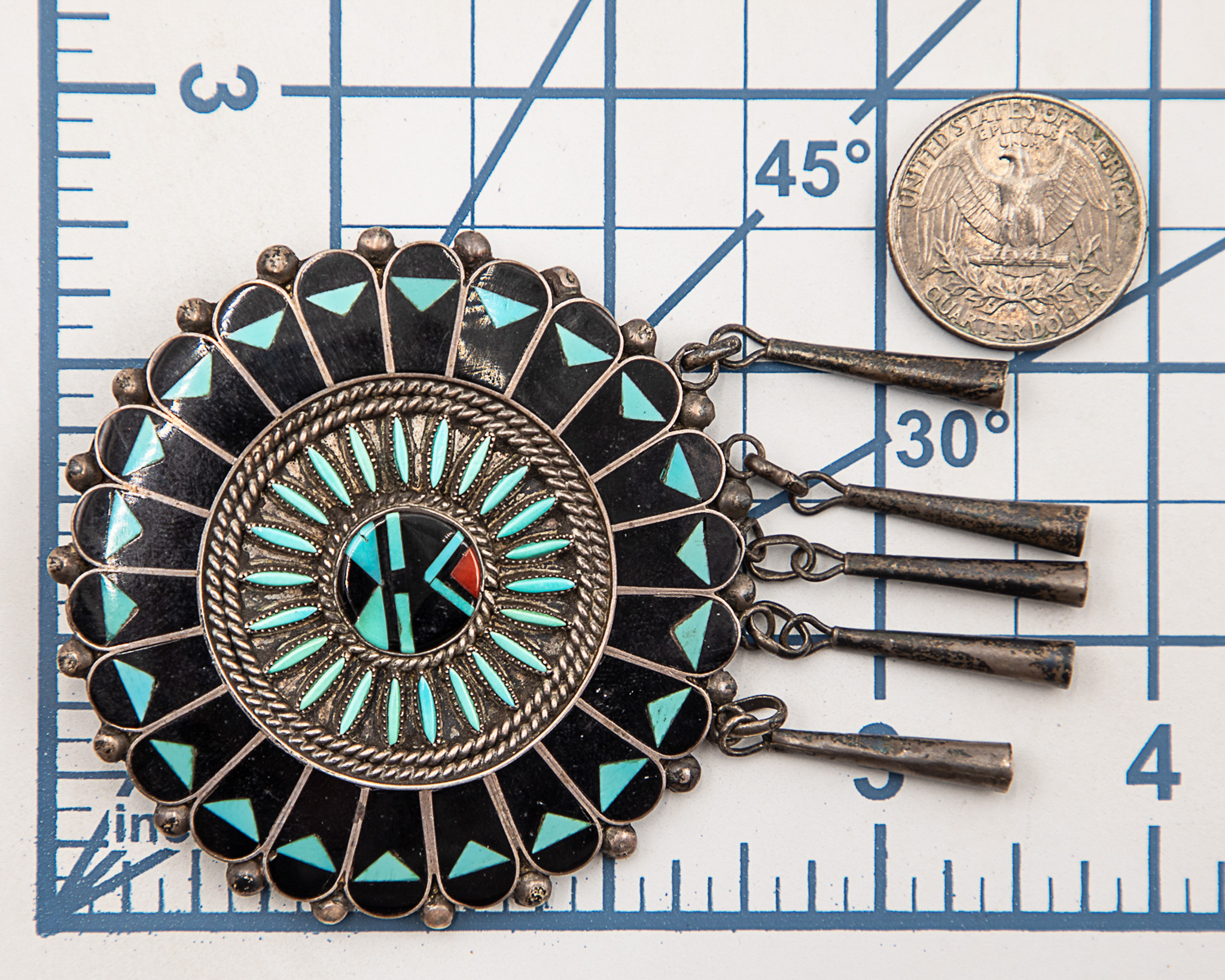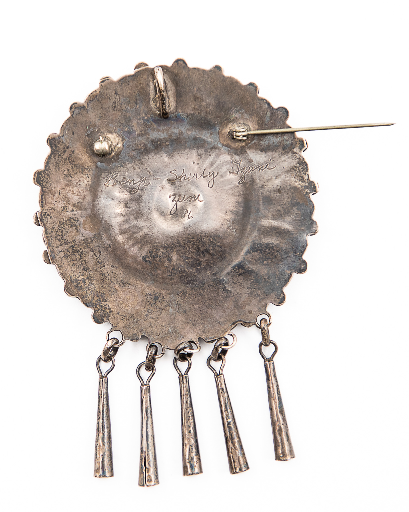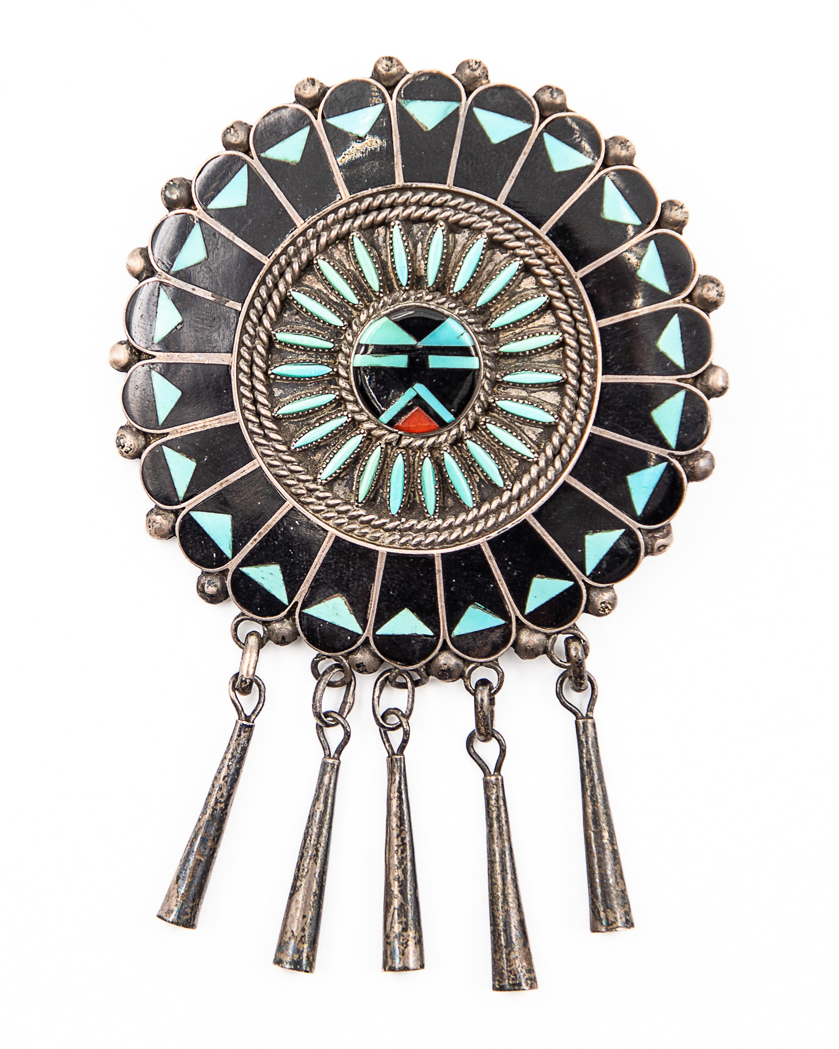 Benji & Shirley Tzuni Zuni Sunface Sterling Jet Turquoise Spiny Oyster Inlay Brooch Pendant 32g-’86 stamp