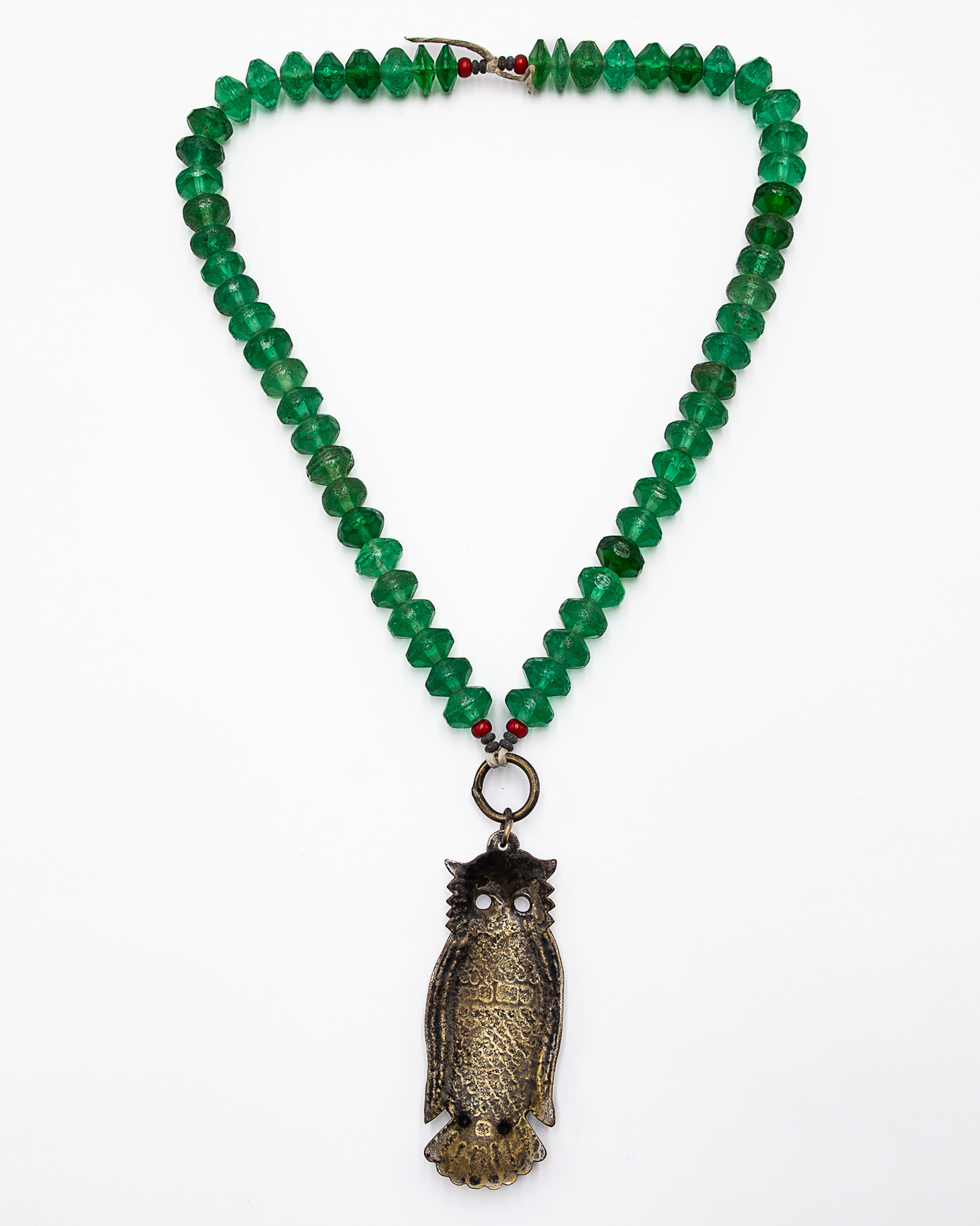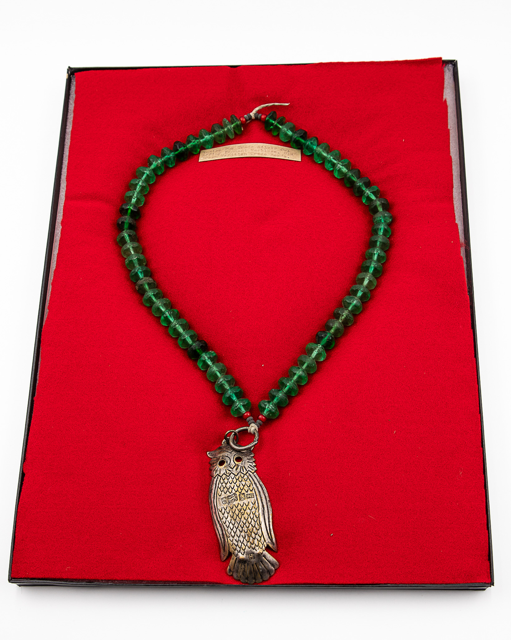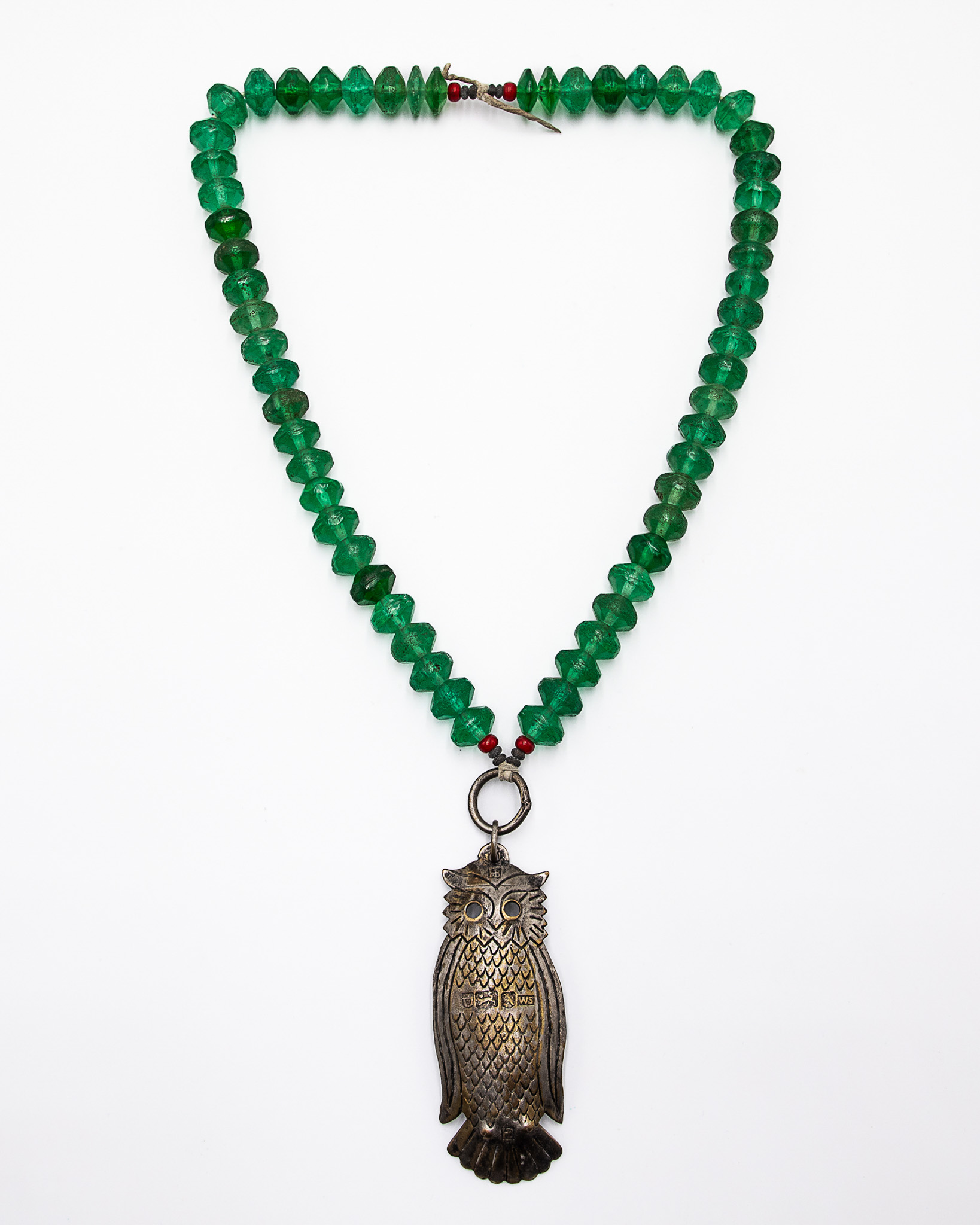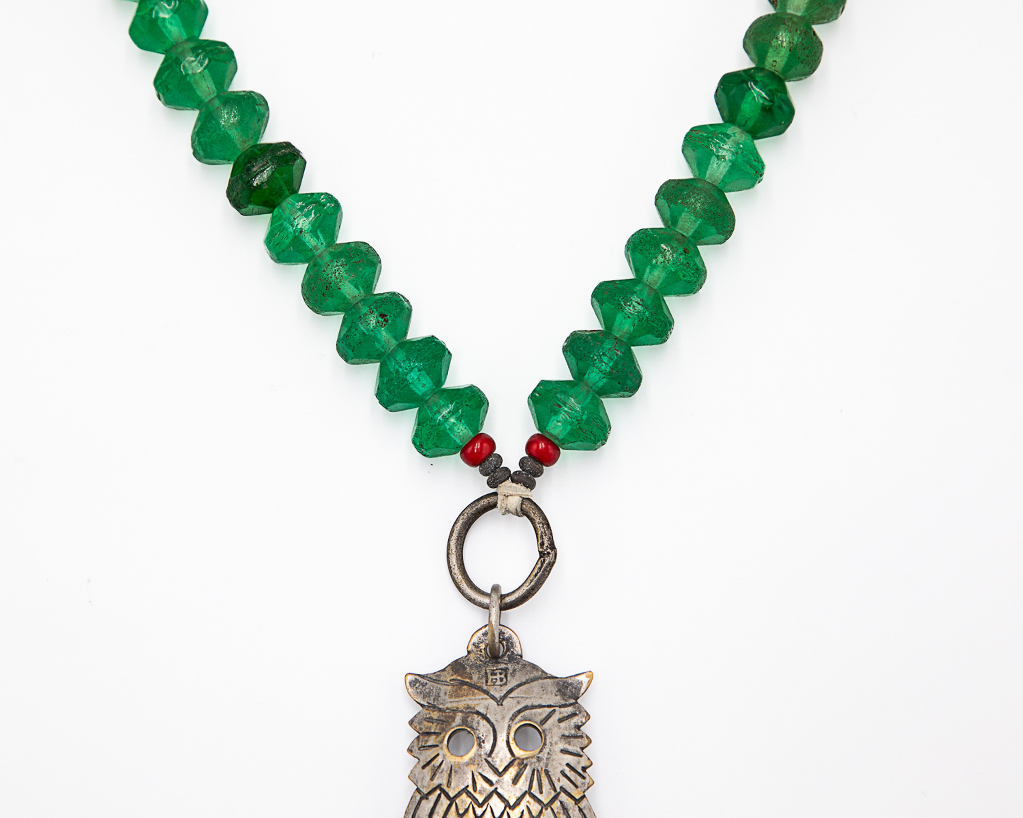 Antique Indian Fur Trade Sterling Owl Effigy Pendant Old Green Venetian Trade Beads