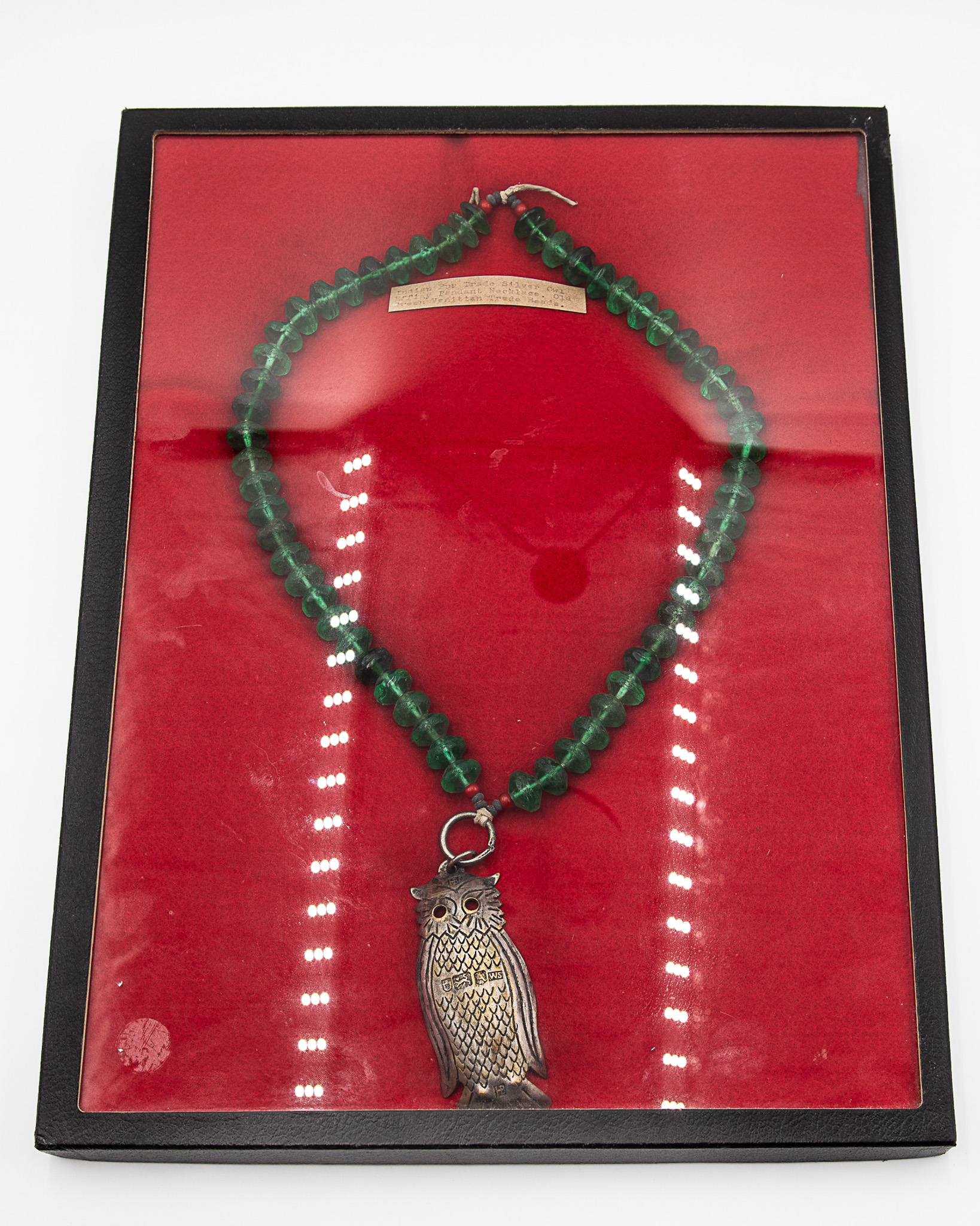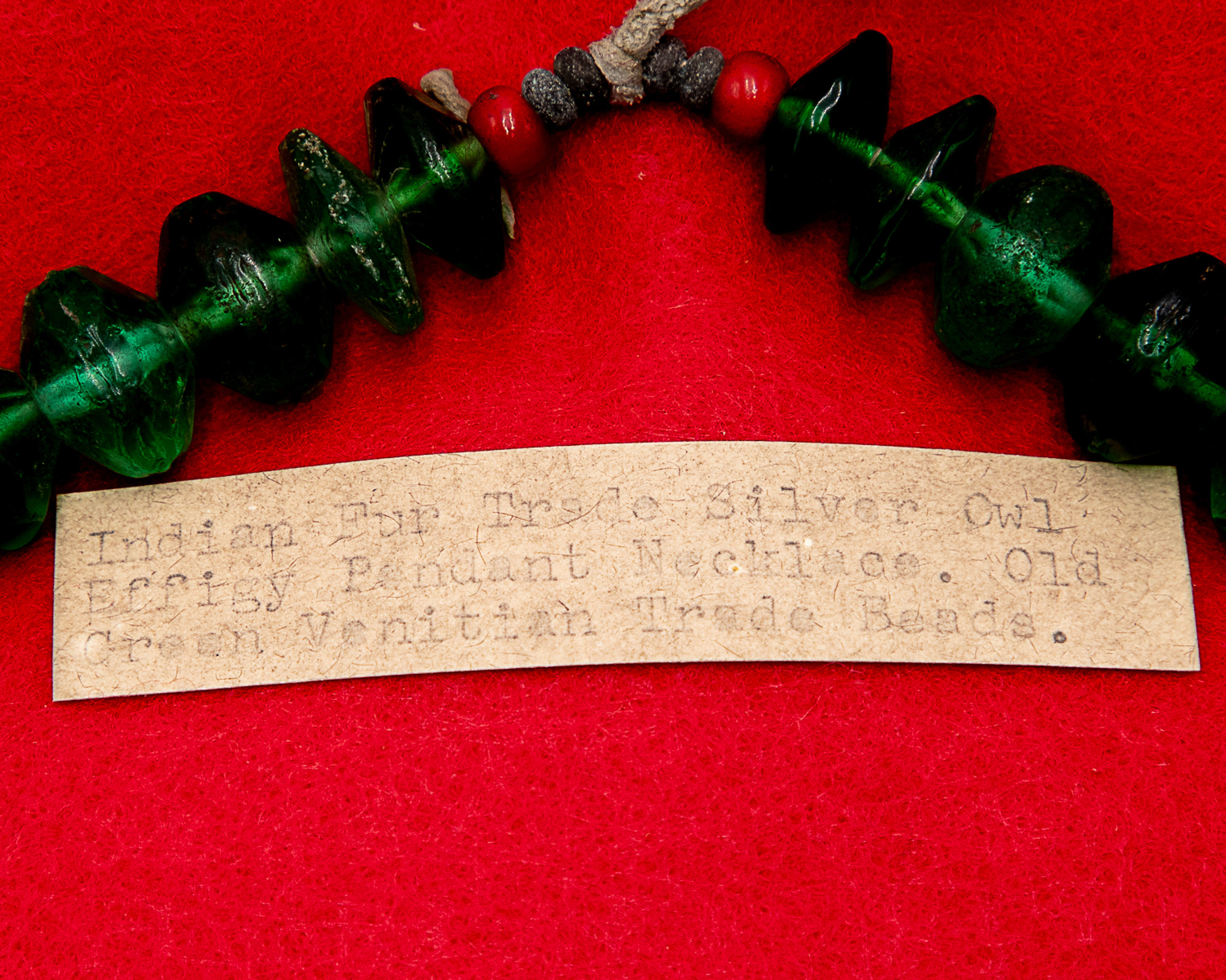 Antique Indian Fur Trade Sterling Owl Effigy Pendant Old Green Venetian Trade Beads In Shadow Box 216g