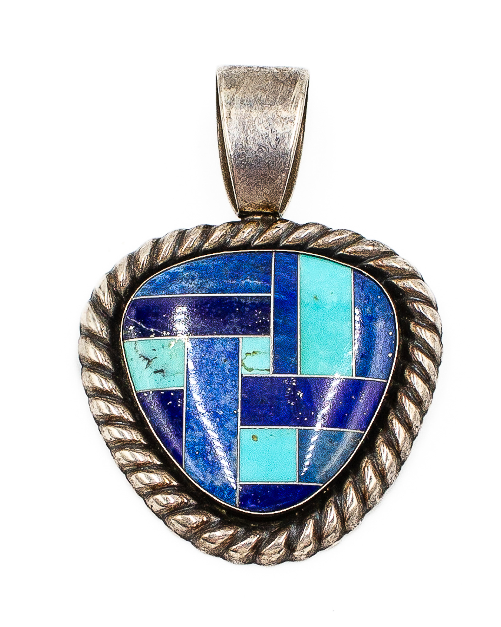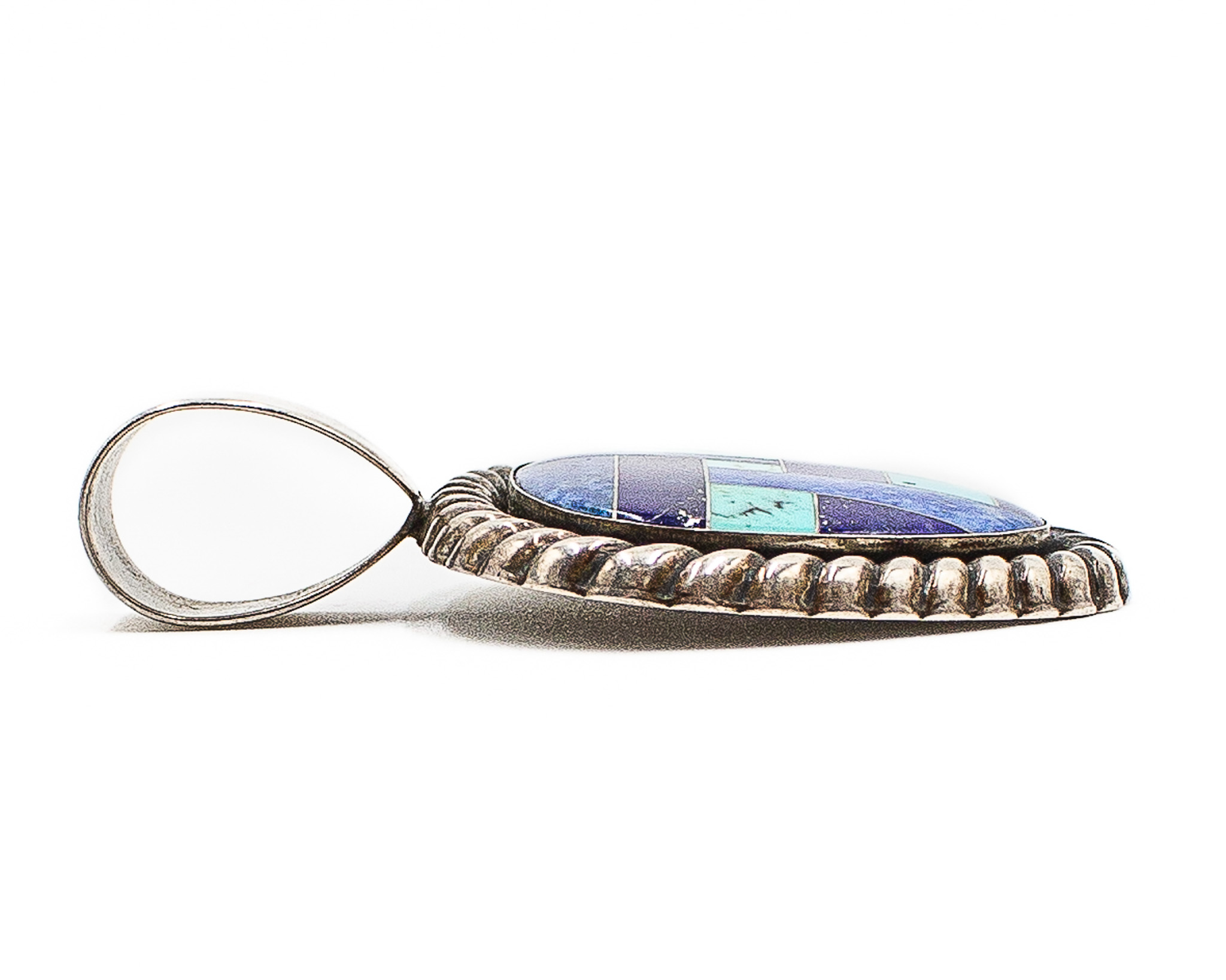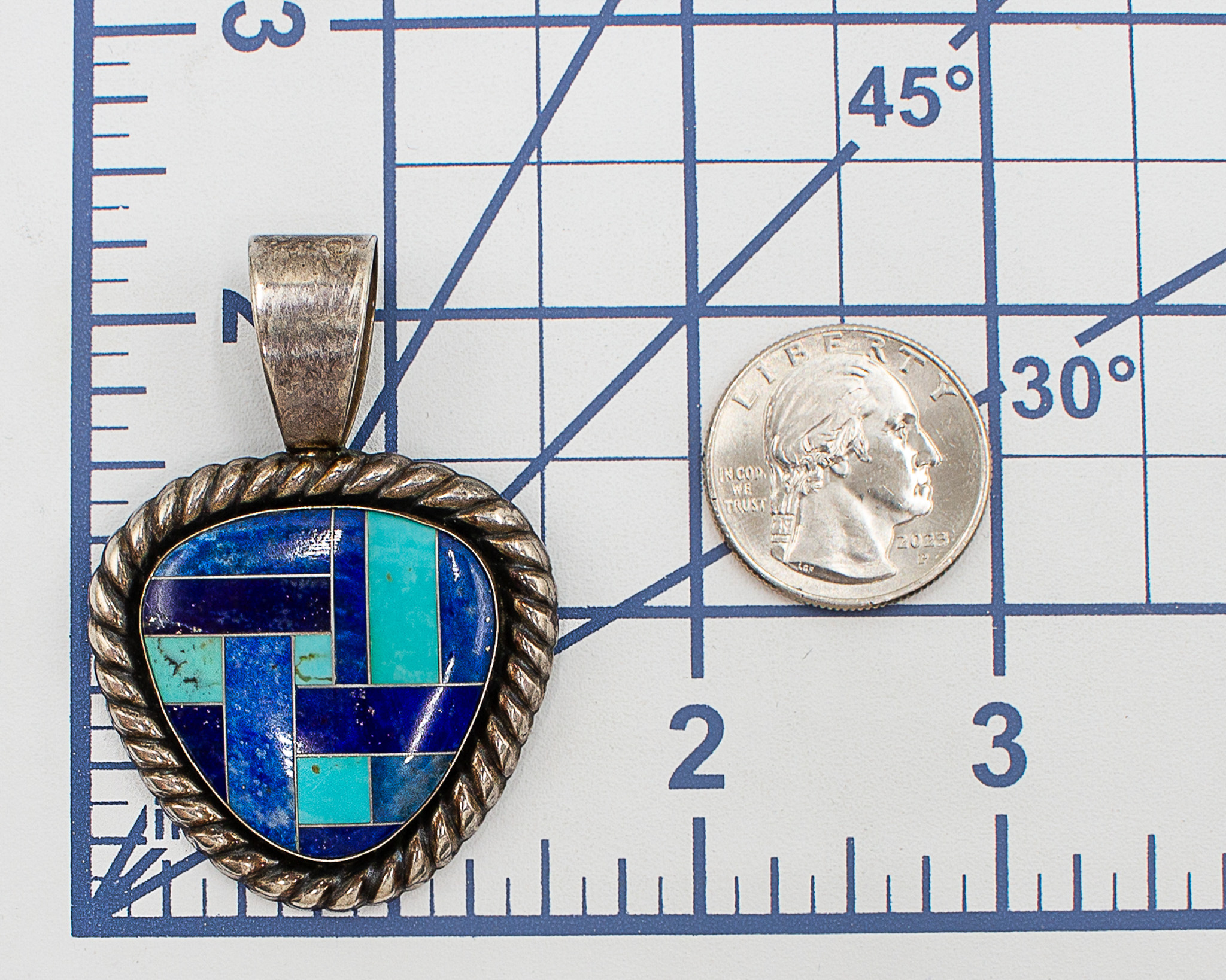 Relios Jewelry Sterling Turquoise and Lapis Stone Inlay Pendant, R Moon Stamp, 925 13.7g