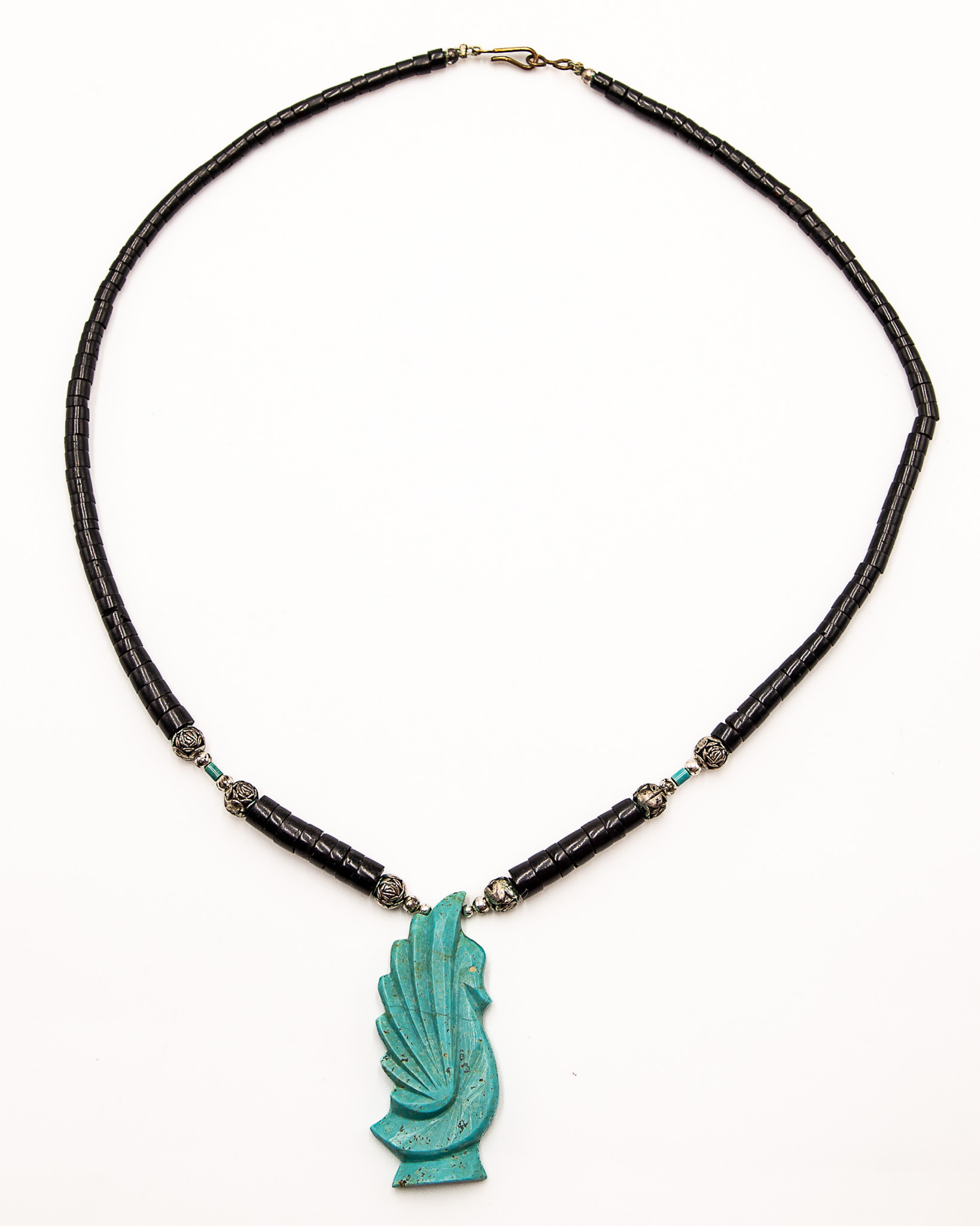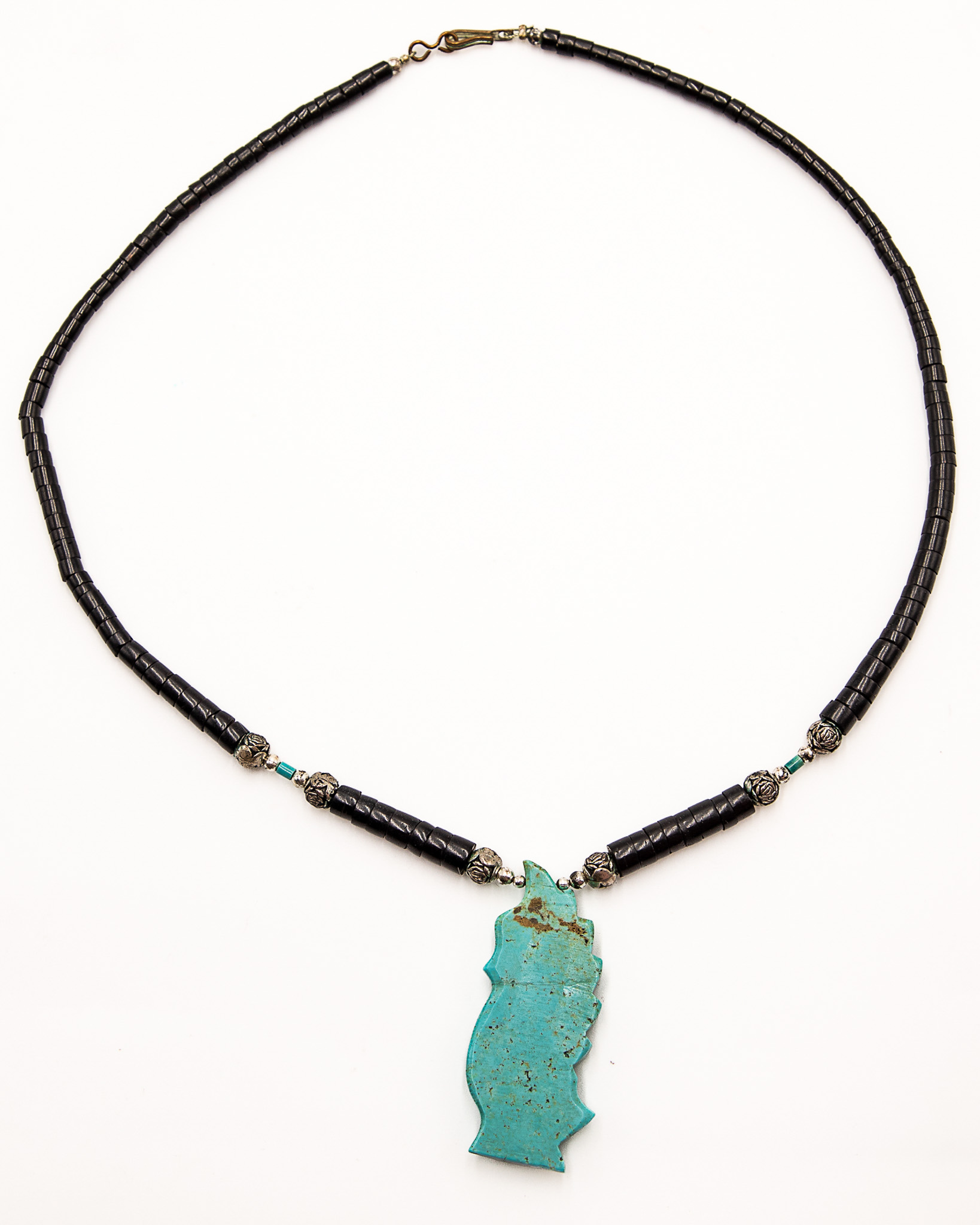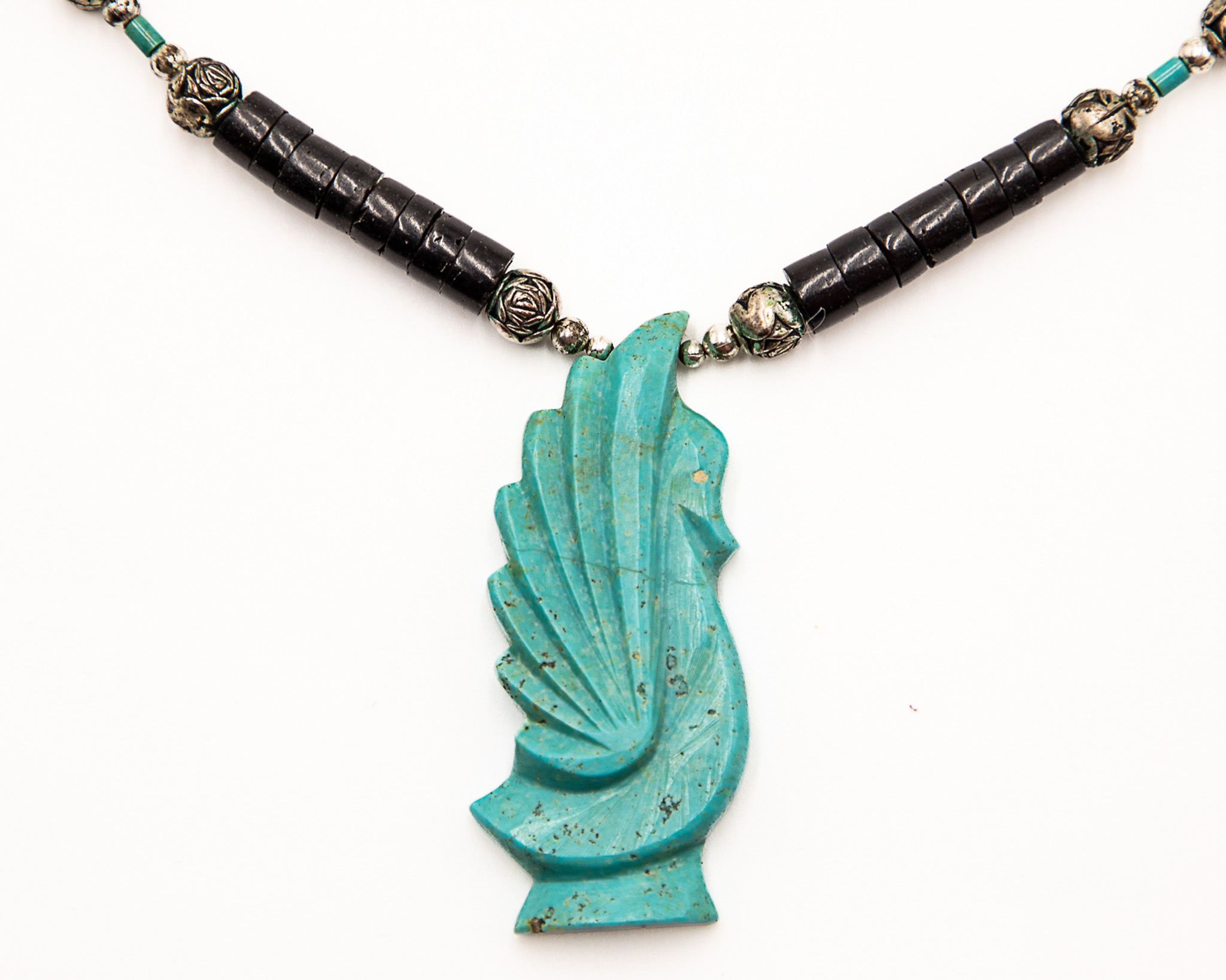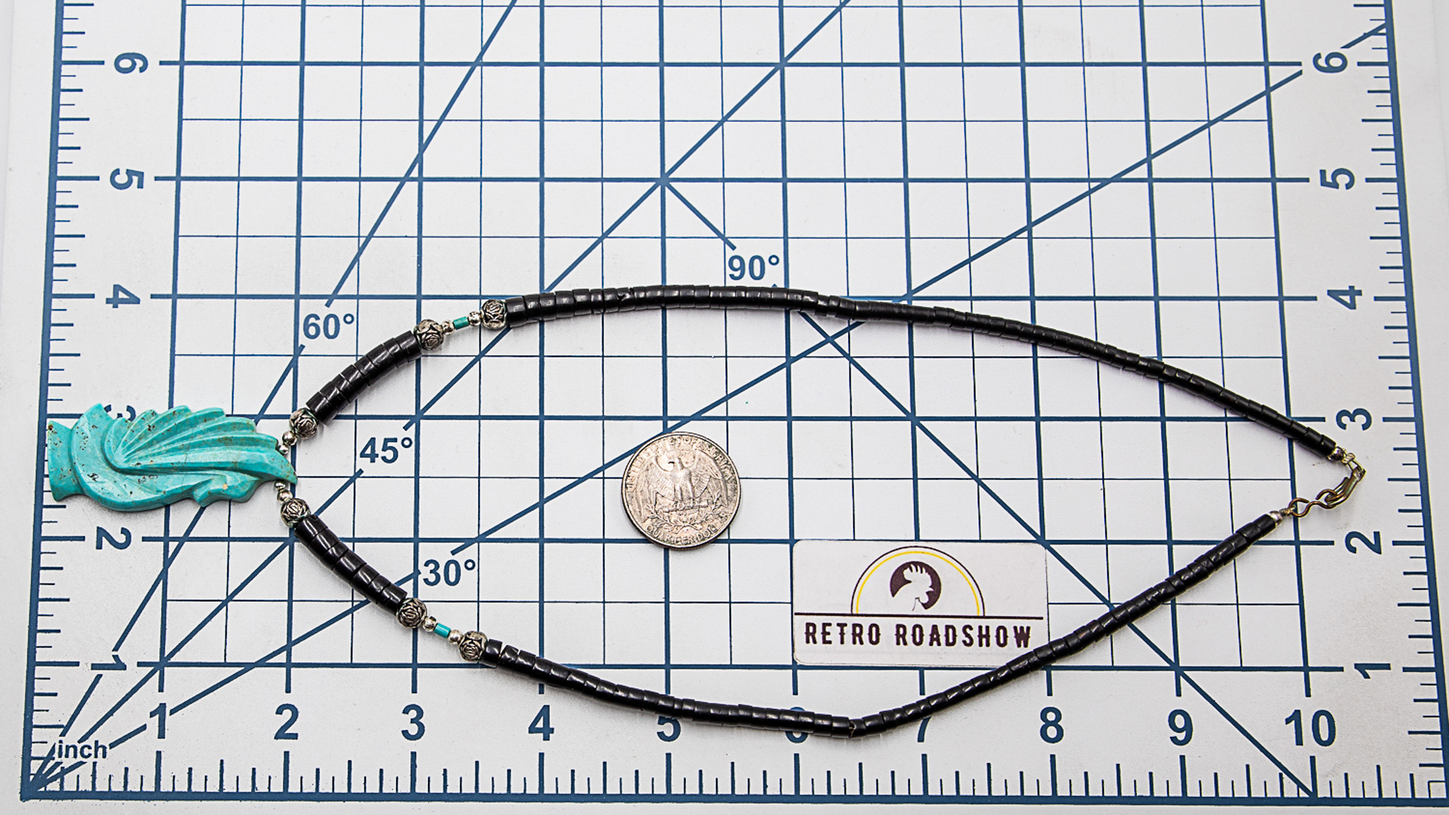 Carved Swan Jet Turquoise Sterling Heishi Necklace 18.5g