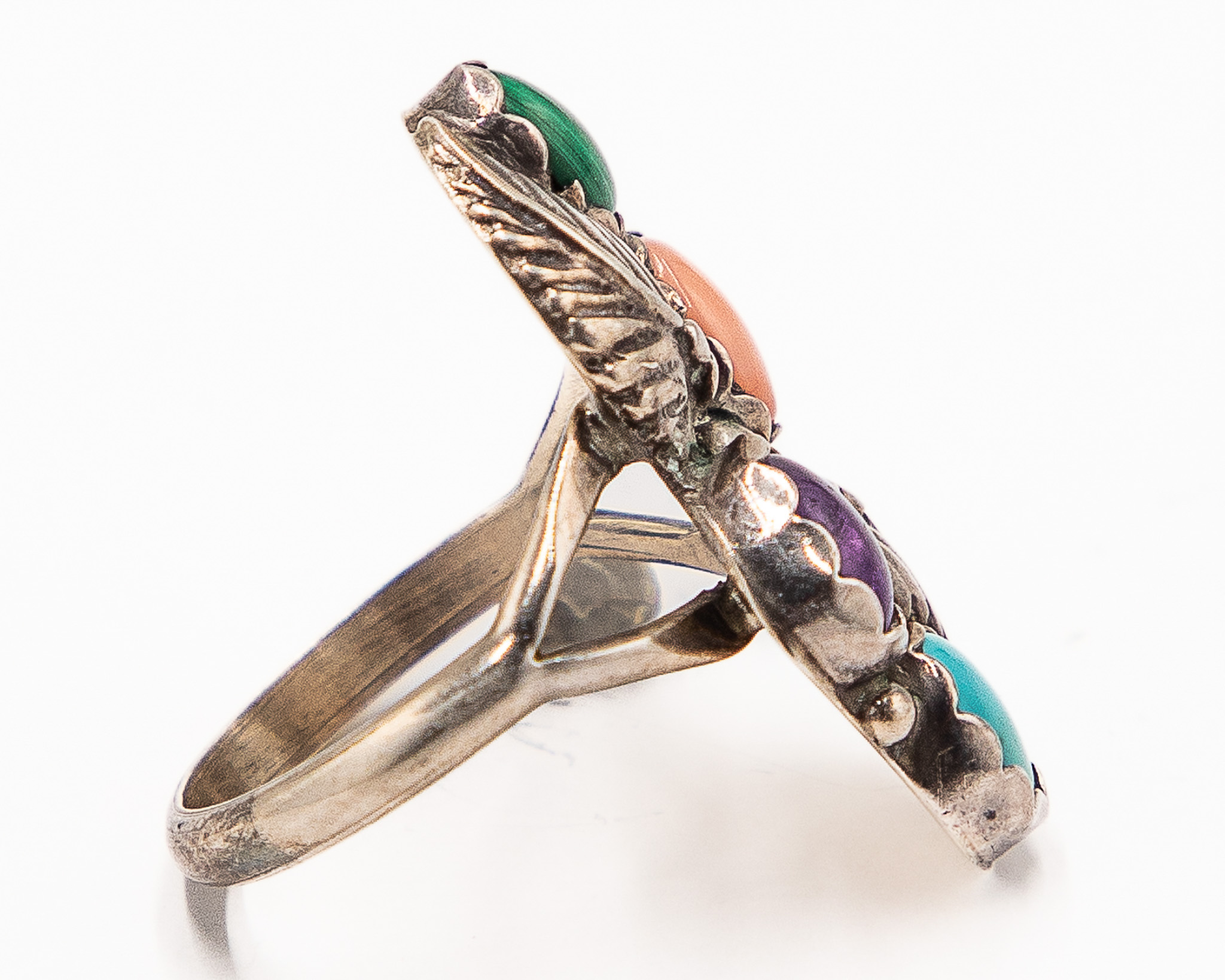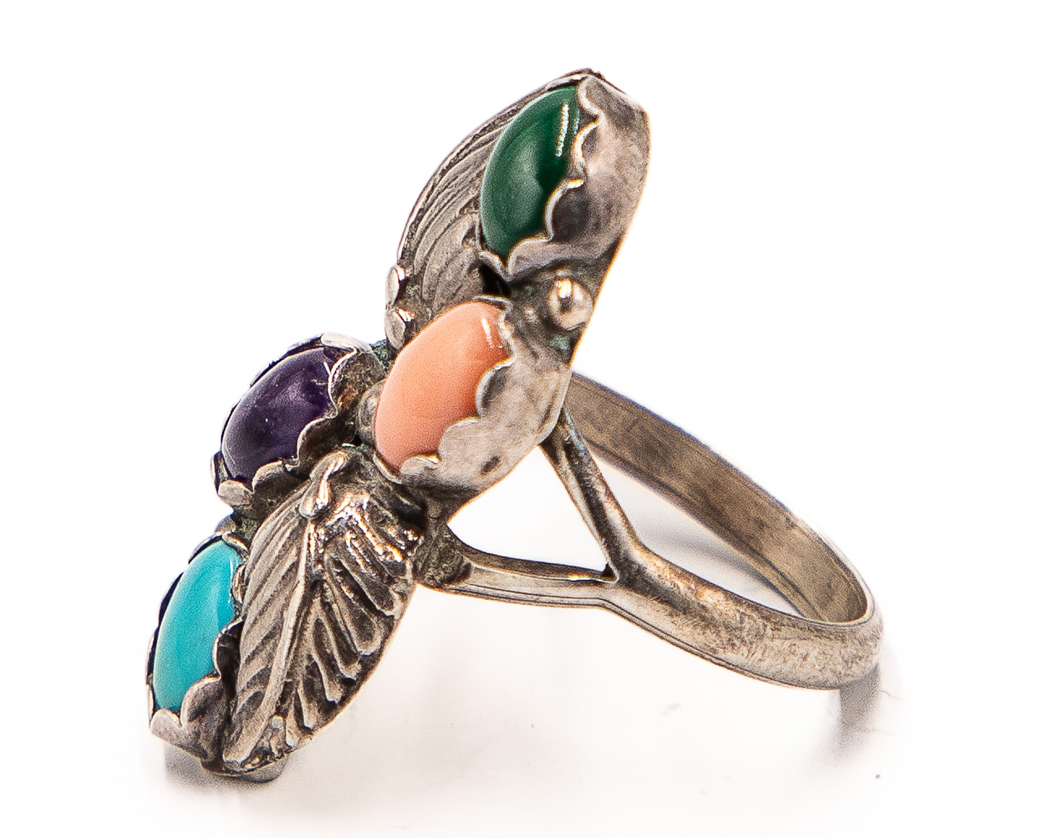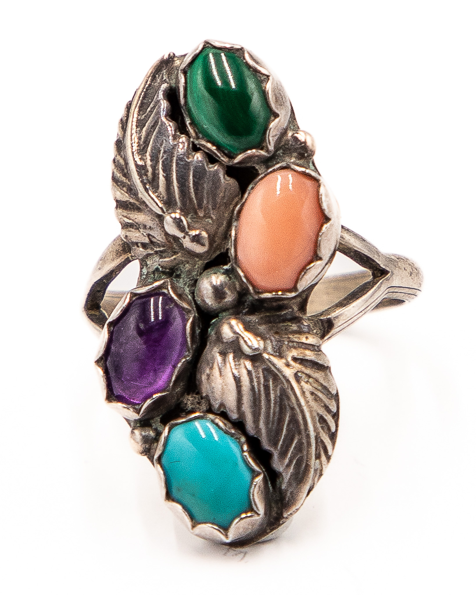 Running Bear Coral Turquoise Spiny Oyster Malachite Ring Sz. 6.5, 5g