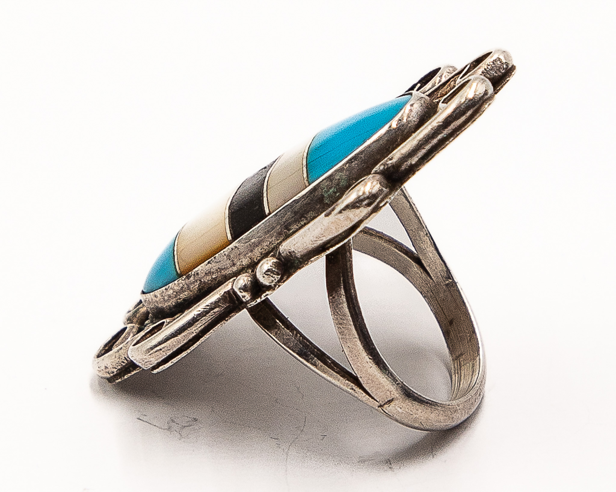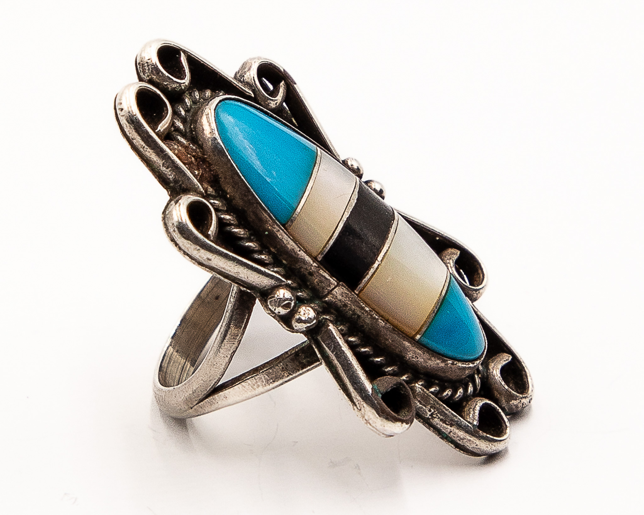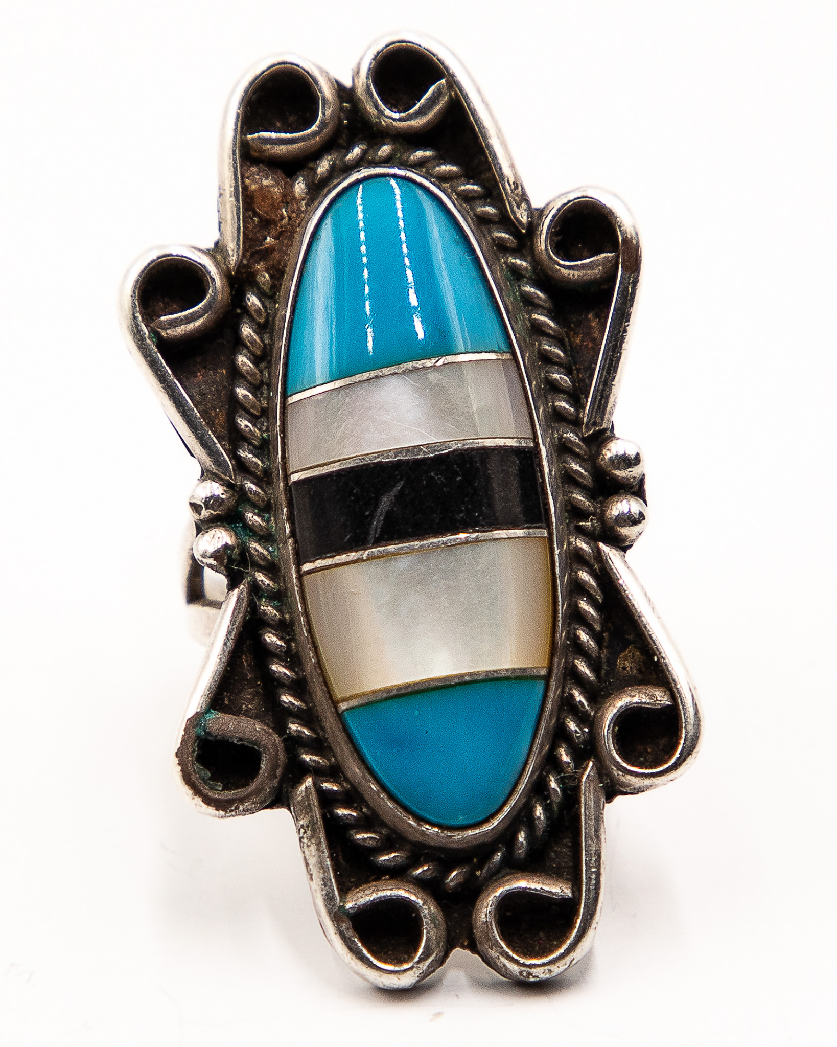 Vintage Navajo Turquoise Mother Of Pearl Jet Inlay Ring Sz. 7.5, 12g