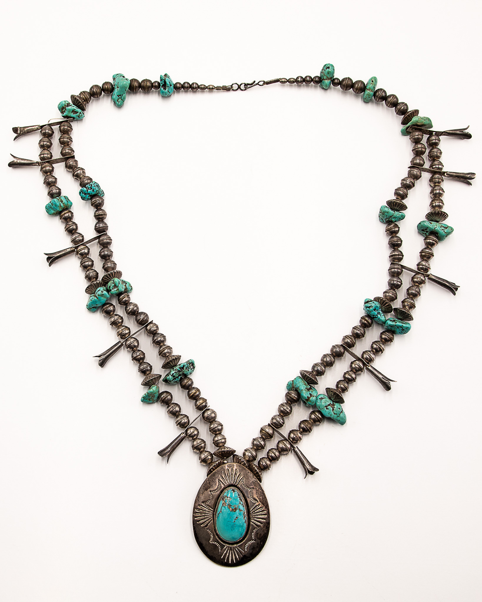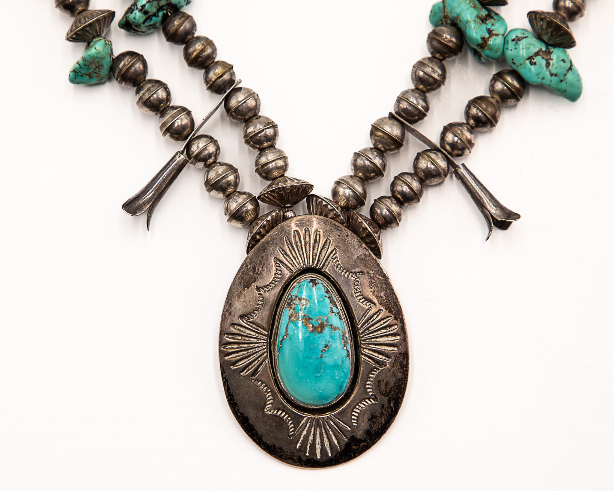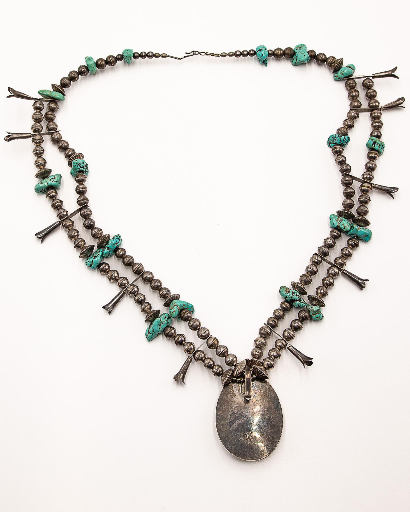 Signed GK Navajo Sterling Chunk Turquoise Squash Blossom Necklace 100g
