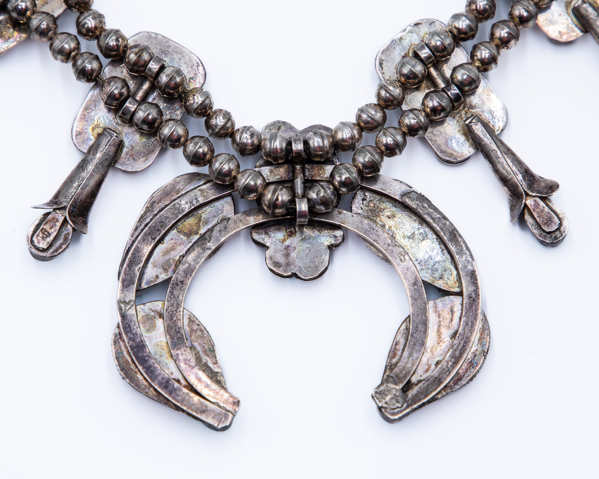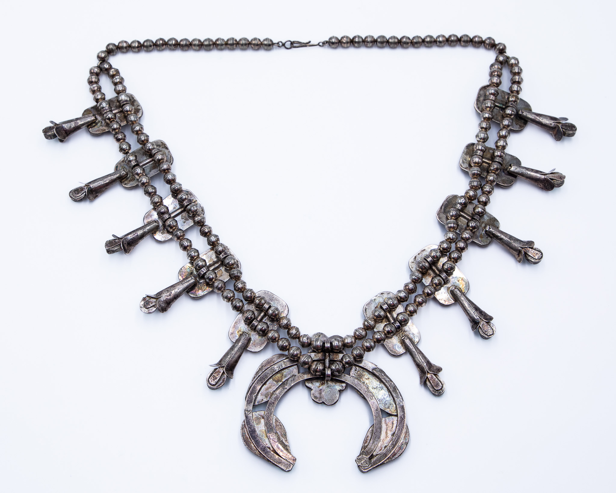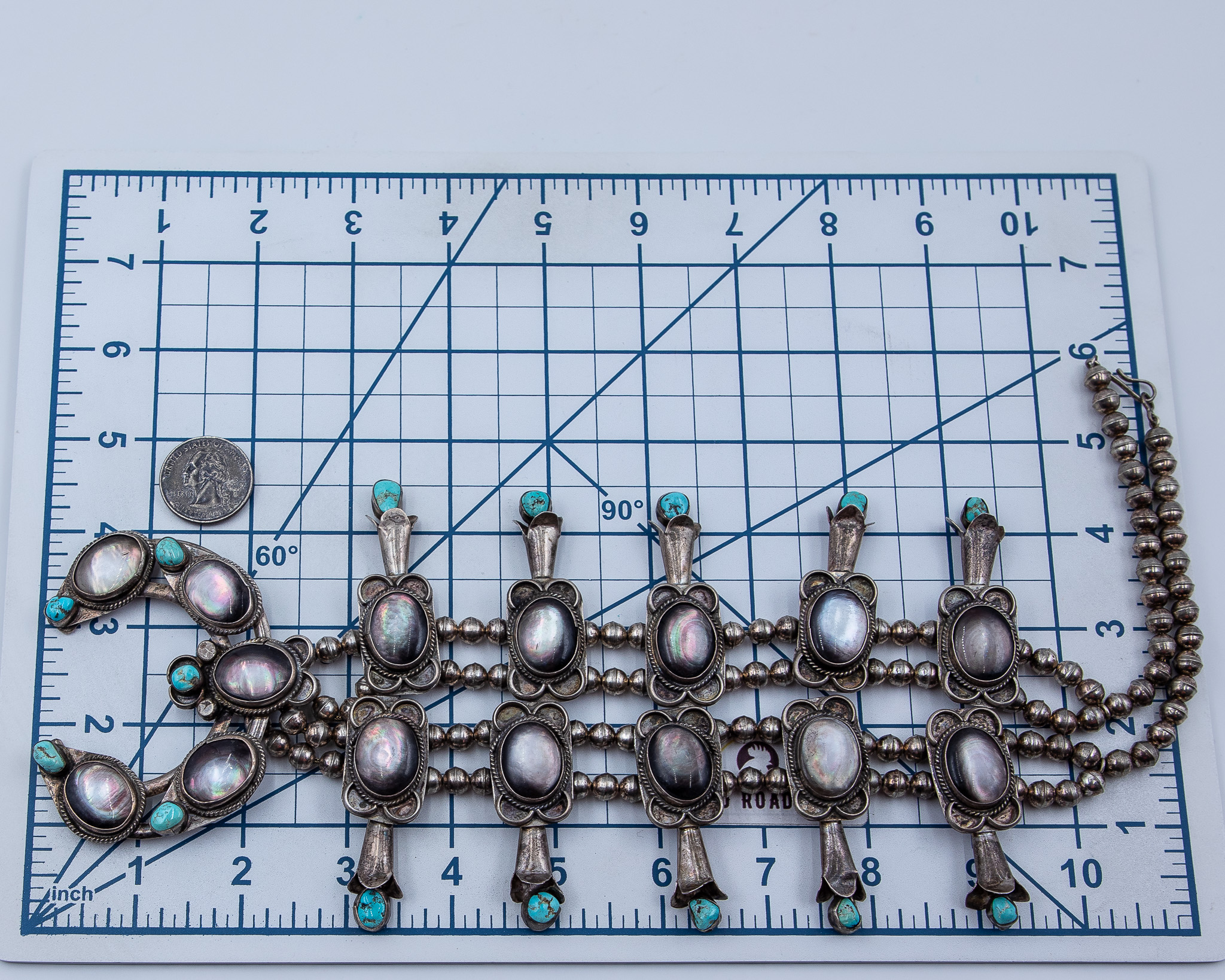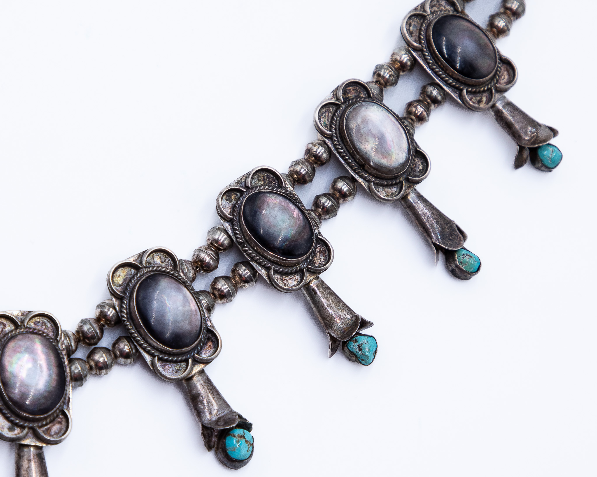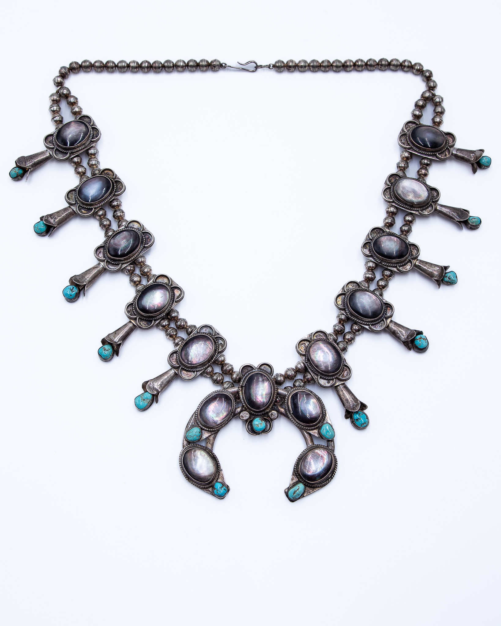 Vintage Navajo Turquoise Abalone Sterling Squash Blossom Necklace 28 Inches 208g