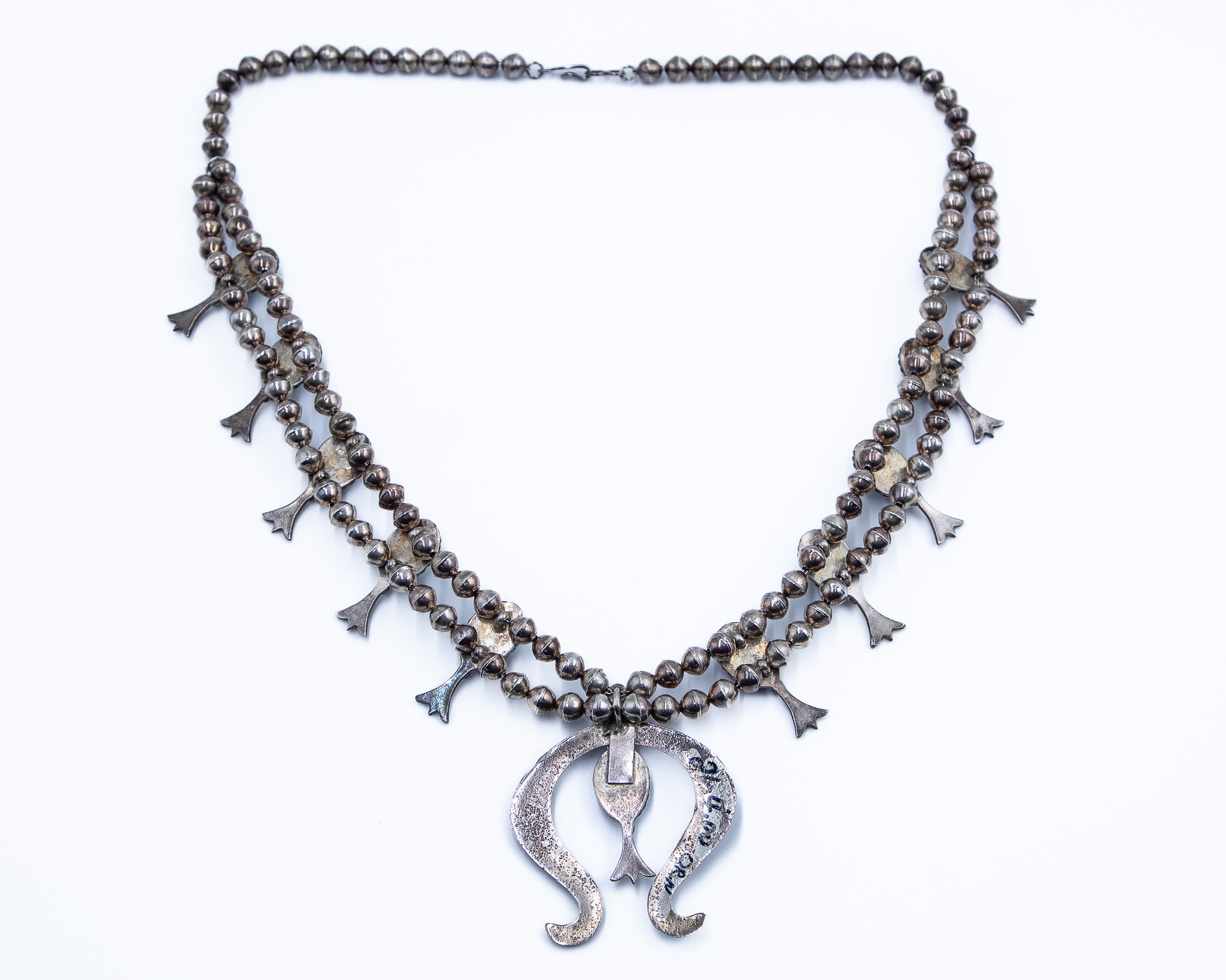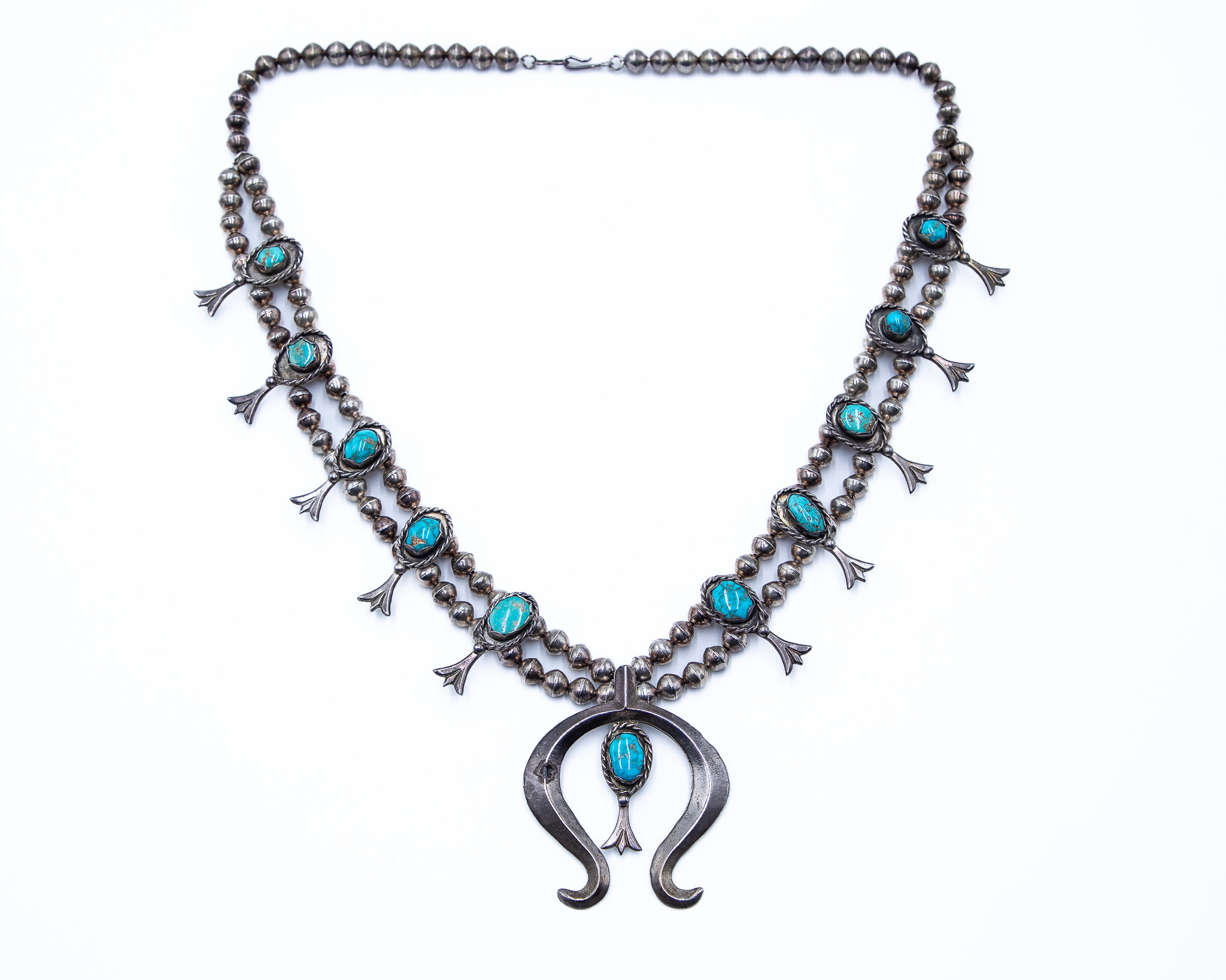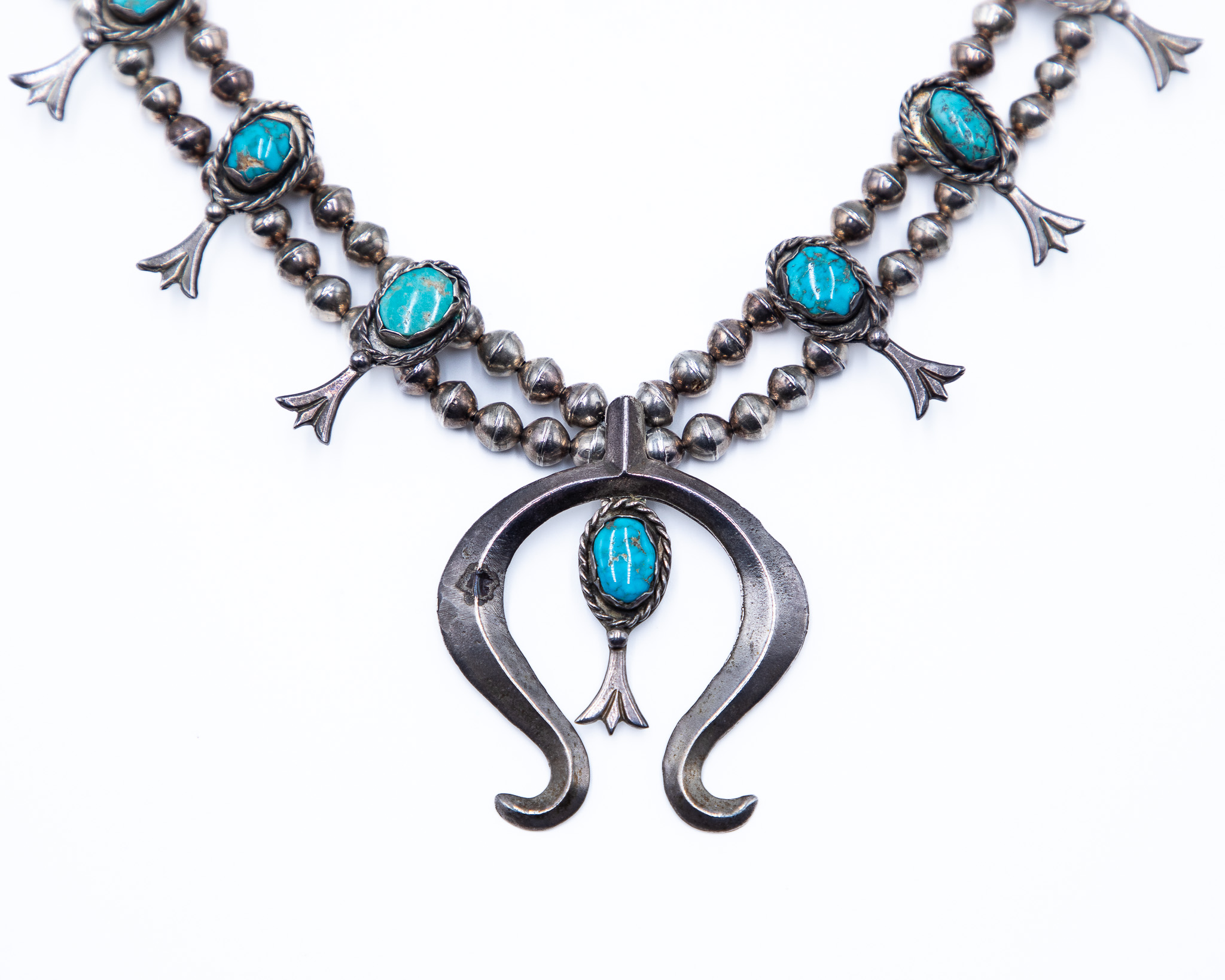 Signed ORN Navajo Sterling Turquoise Naja Squash Blossom Necklace 147g, 26 inches