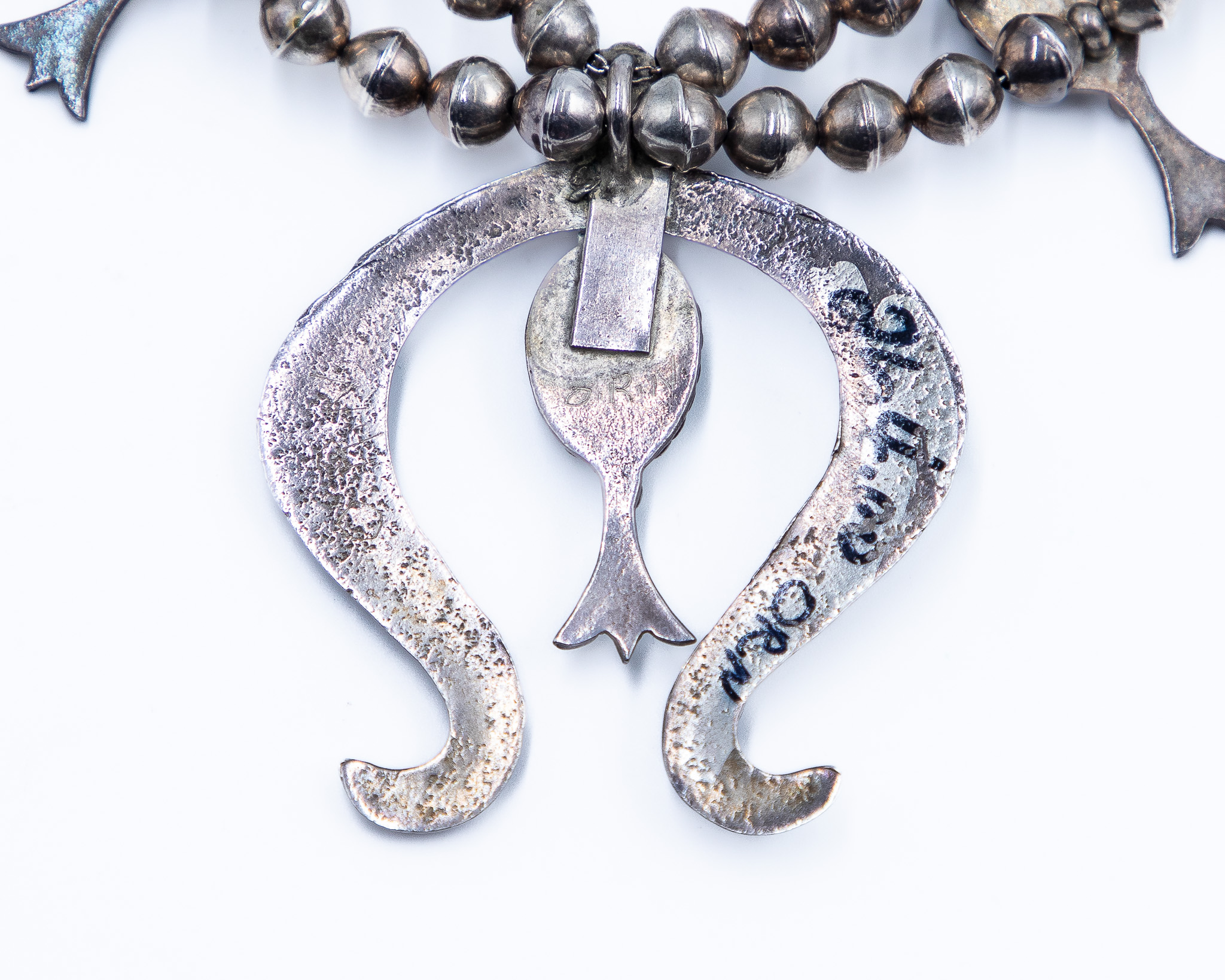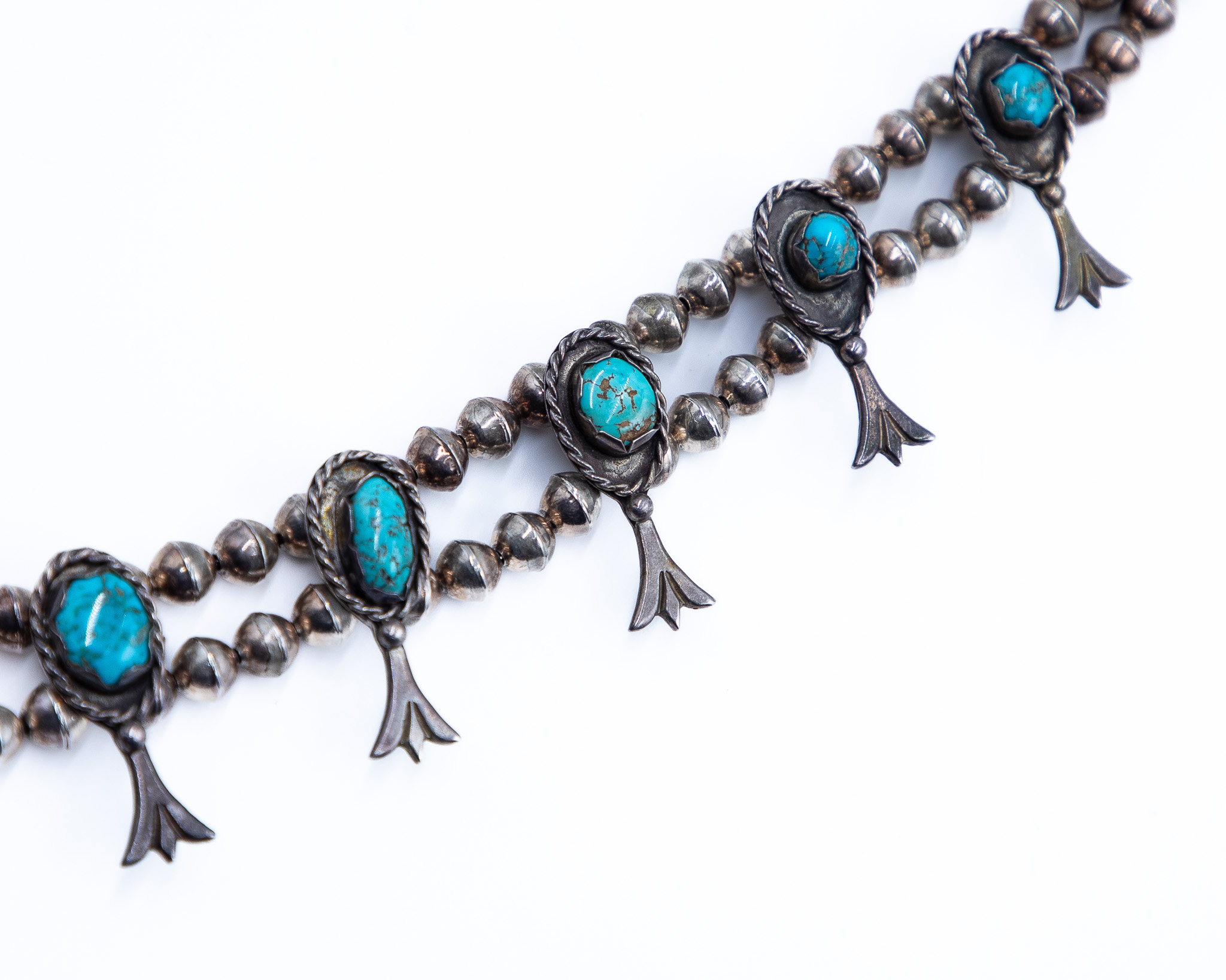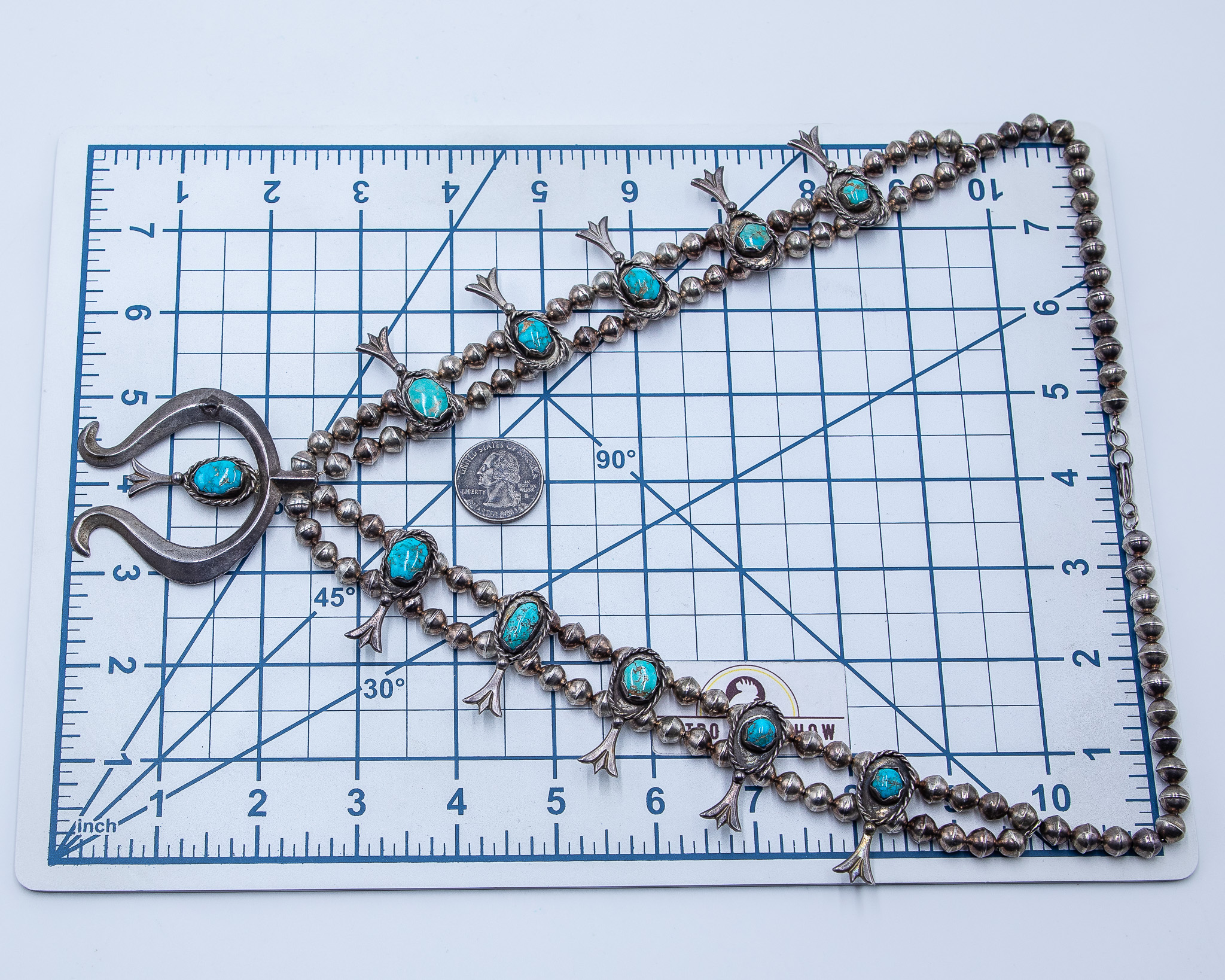 Signed ORN Navajo Sterling Turquoise Naja Squash Blossom Necklace 147g, 26 inches