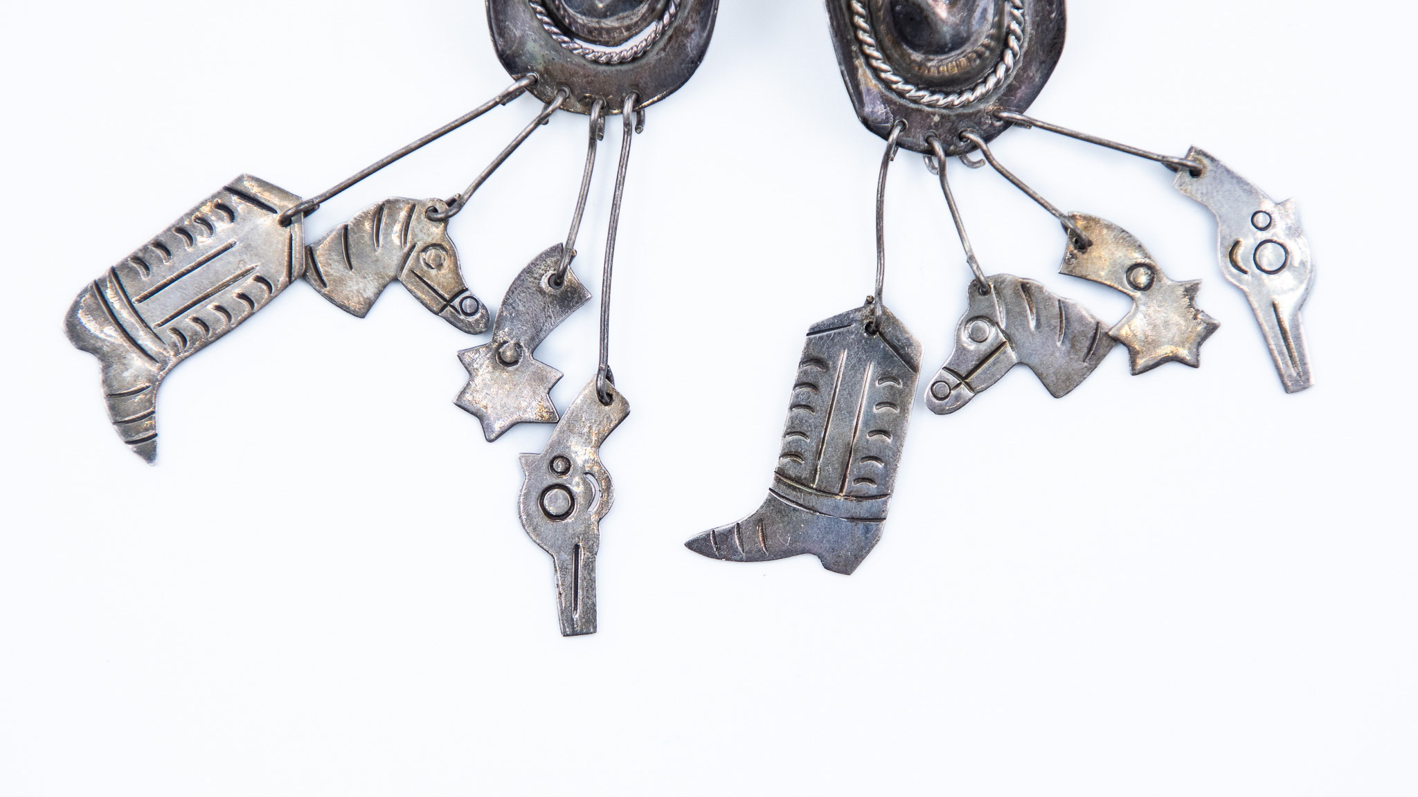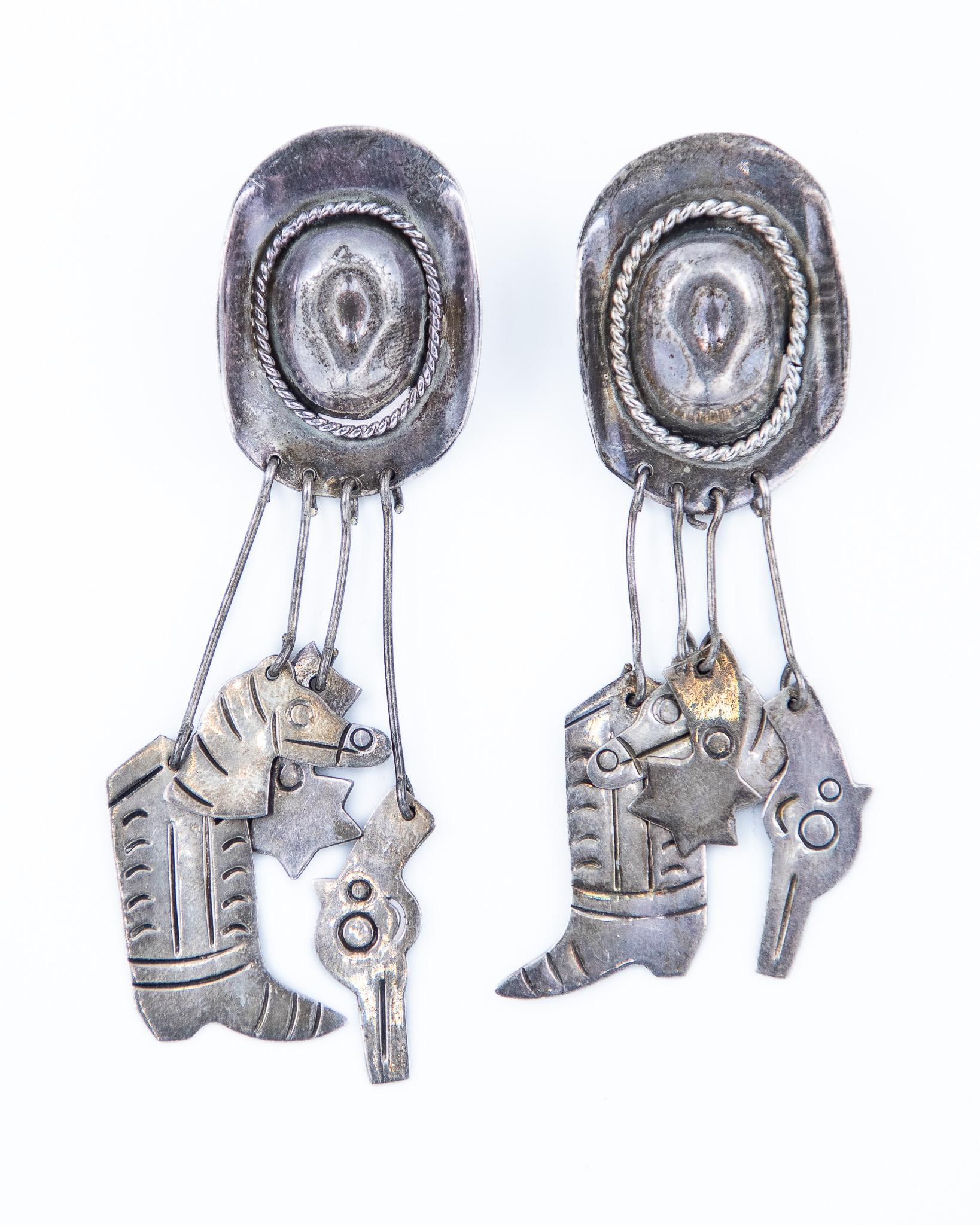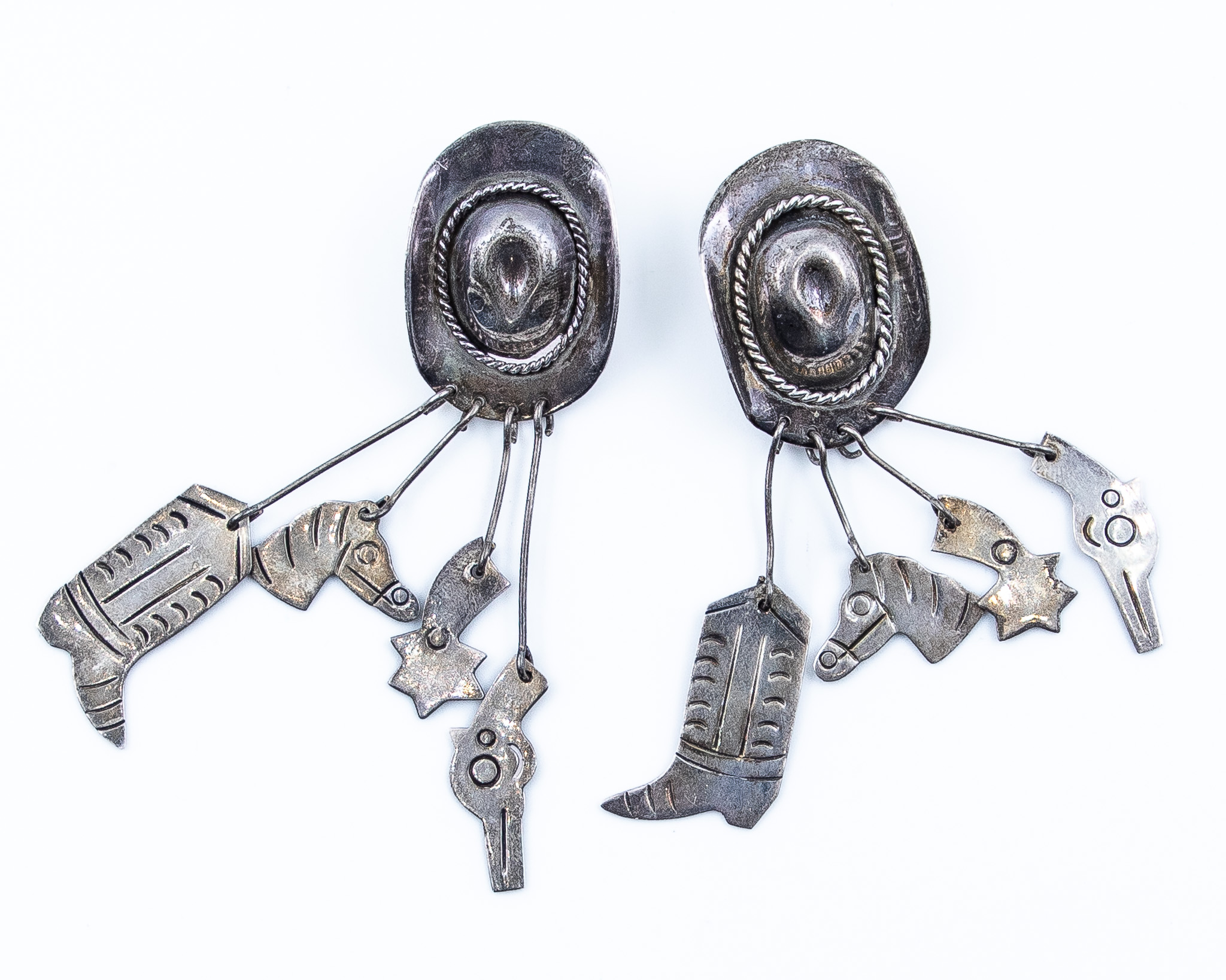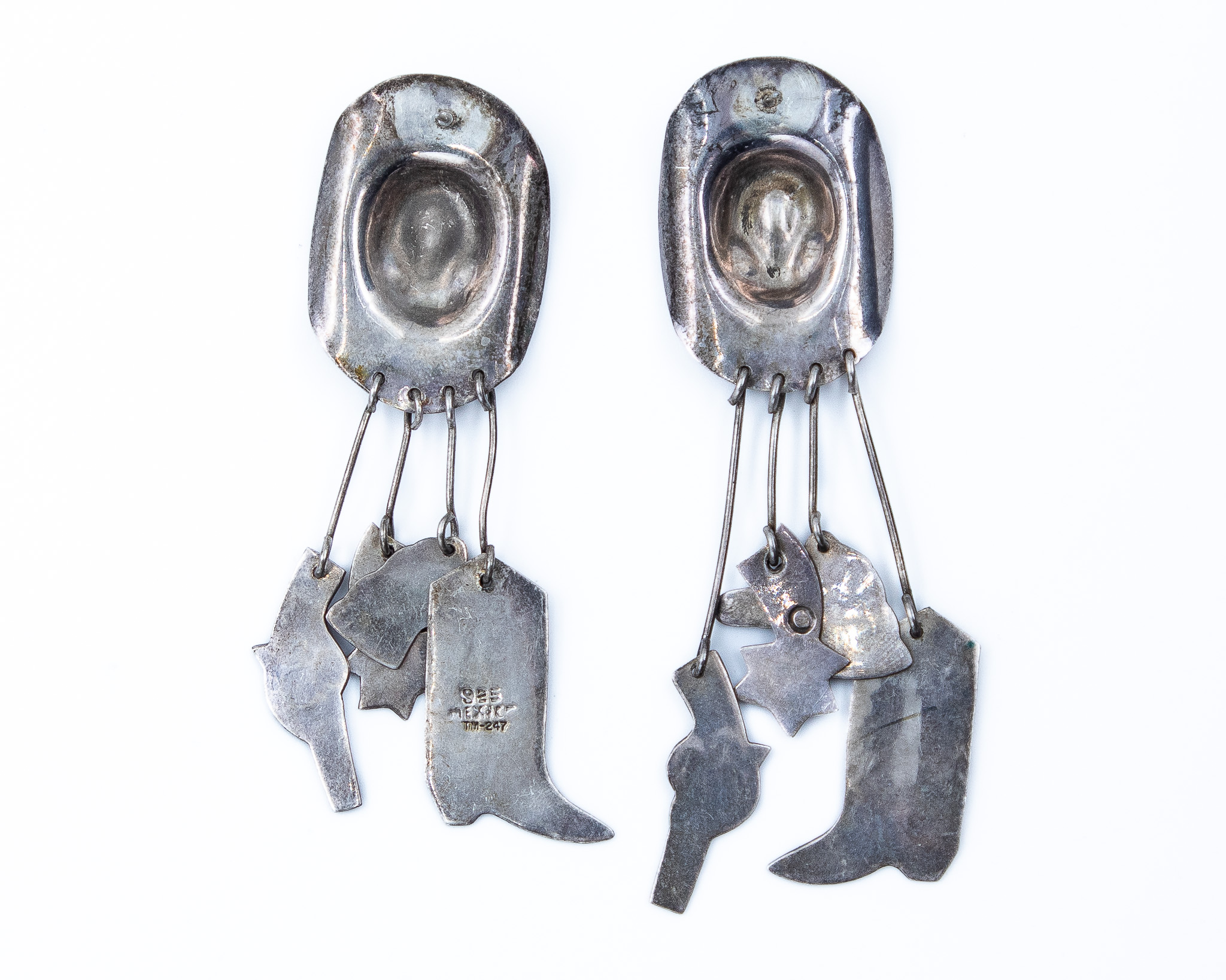 Signed TM-247 Taxco Mexico Sterling Cowboy Hat Boot Dangle Earrings 28g