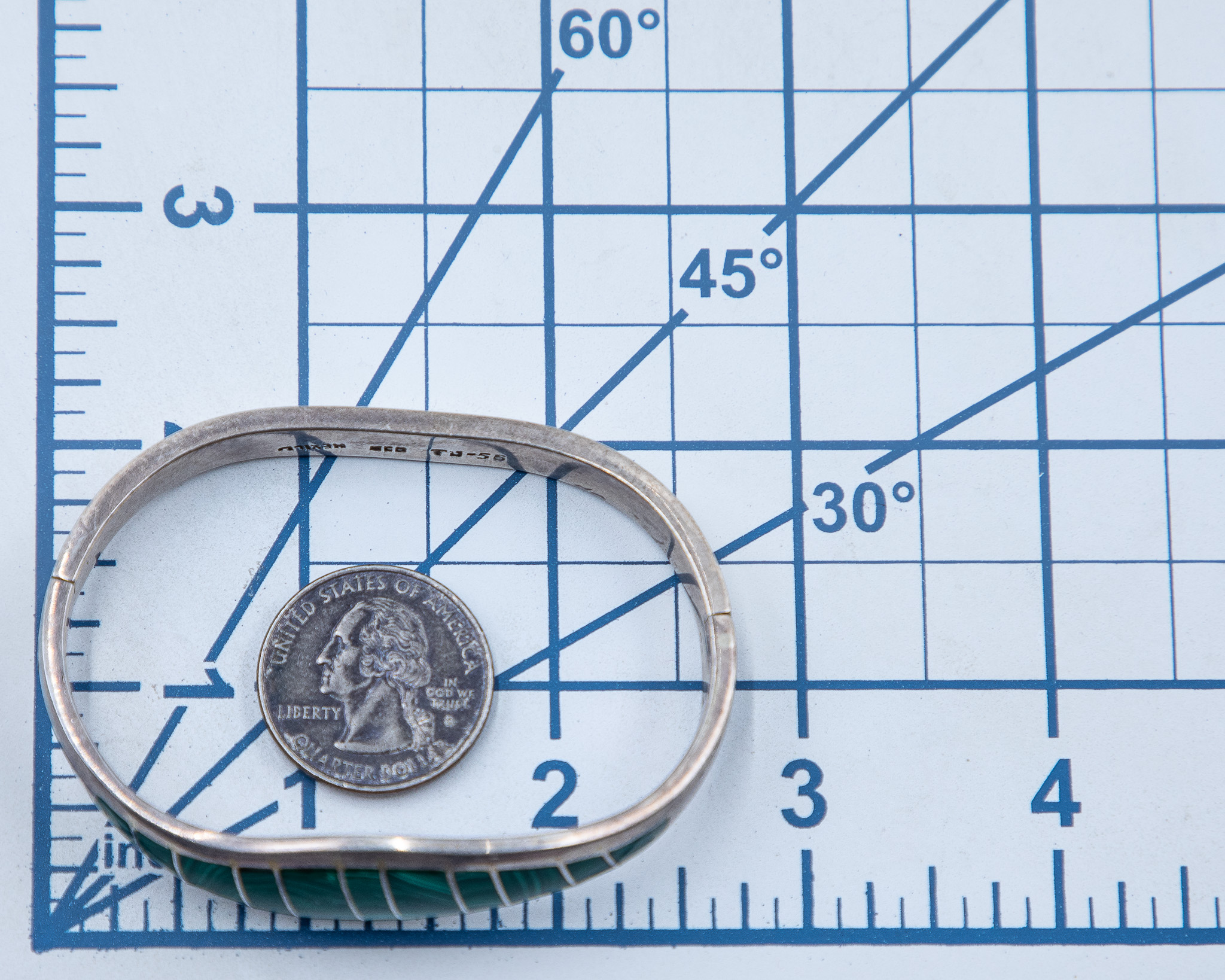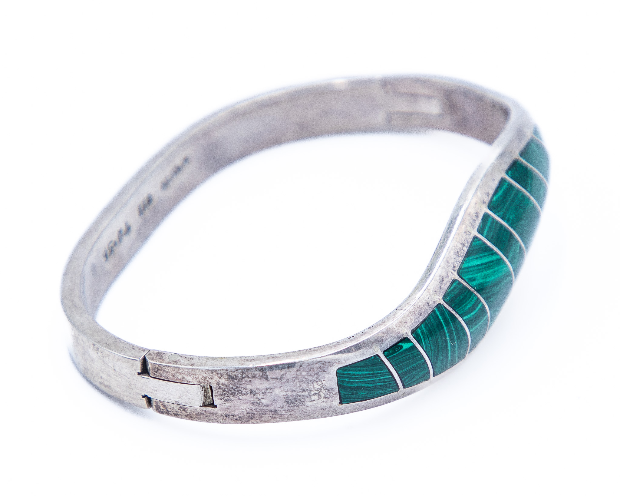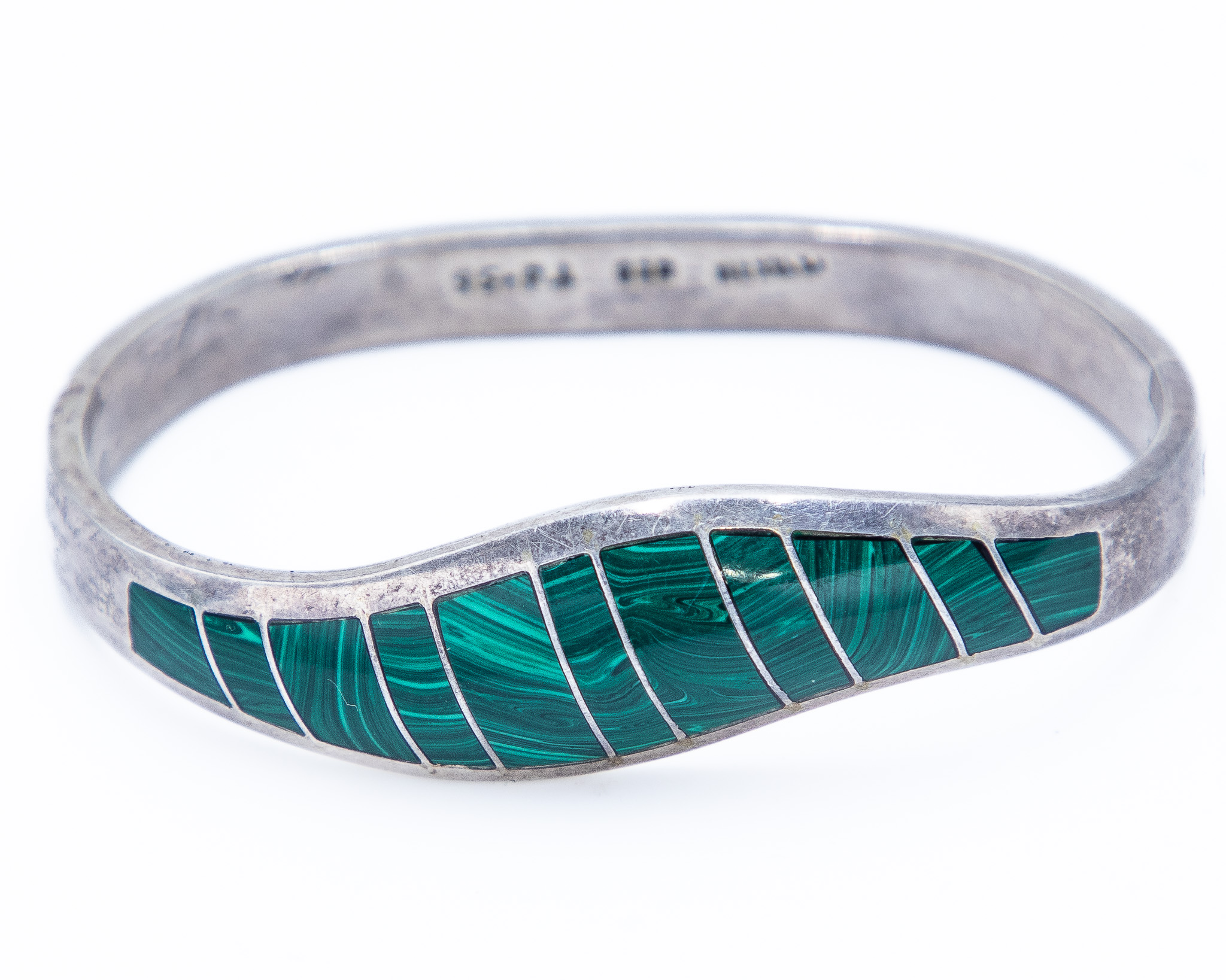 Signed TJ-56 Taxco Mexico Sterling Malachite Inlay Hinge Bracelet 41.5g