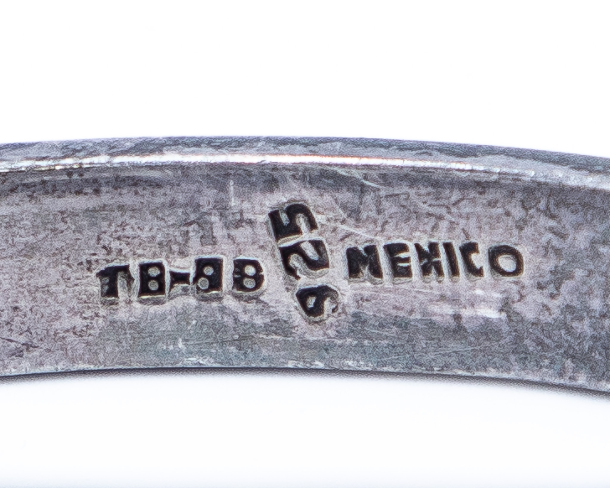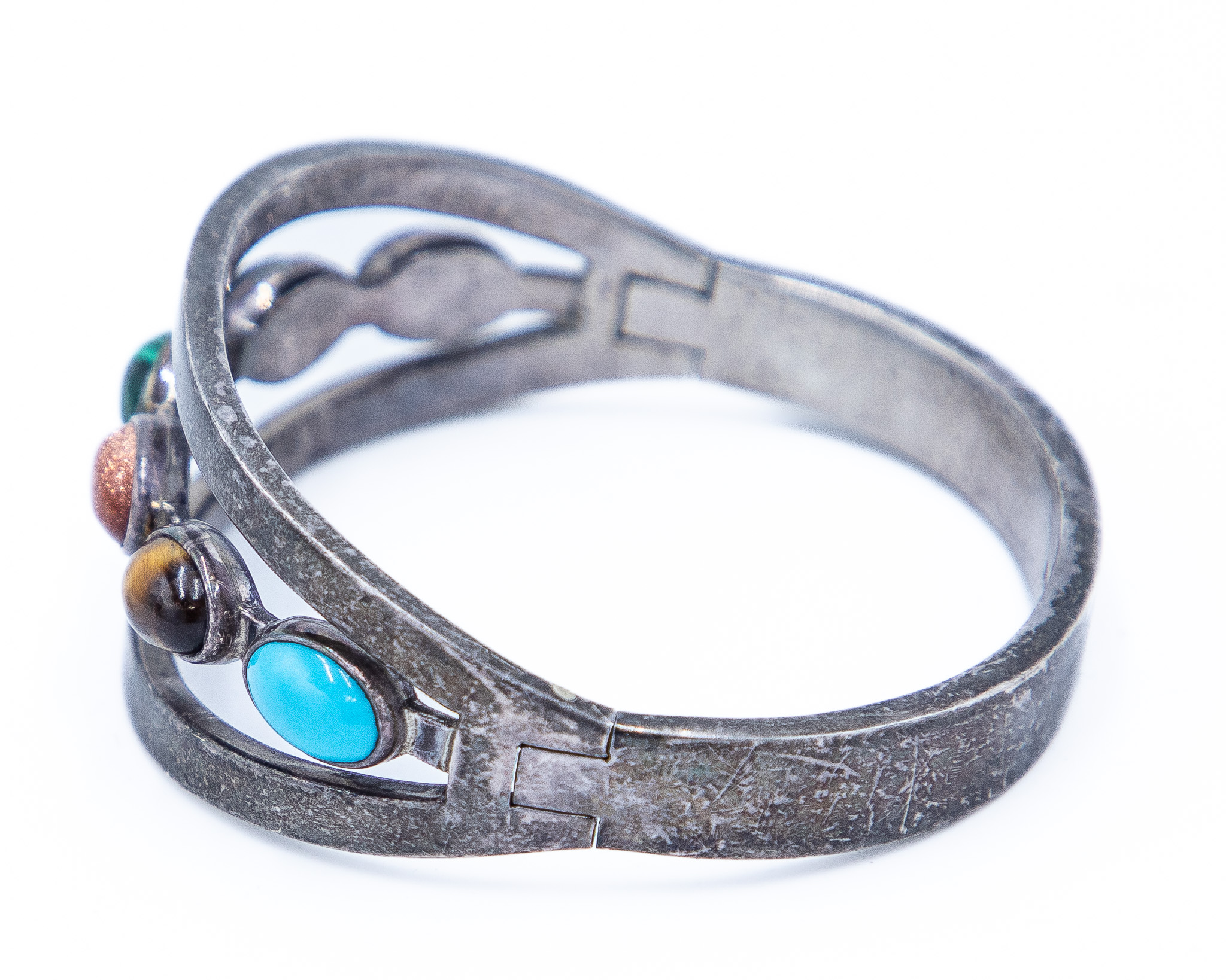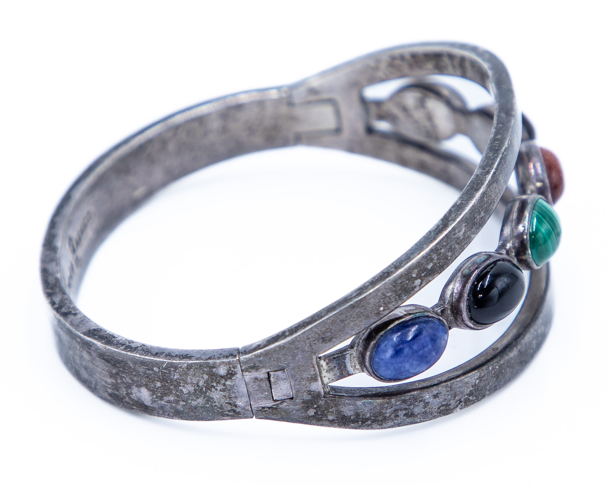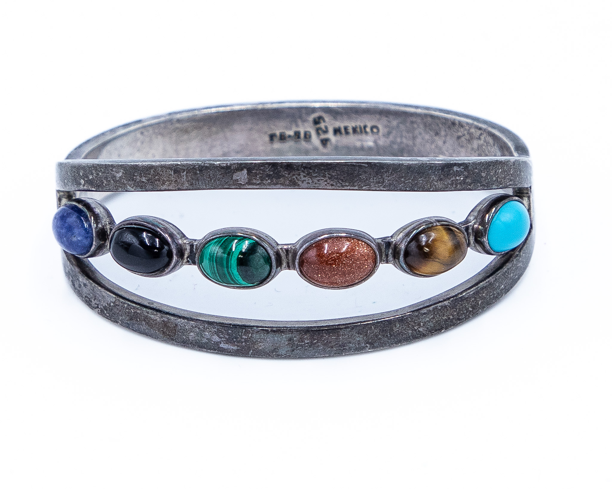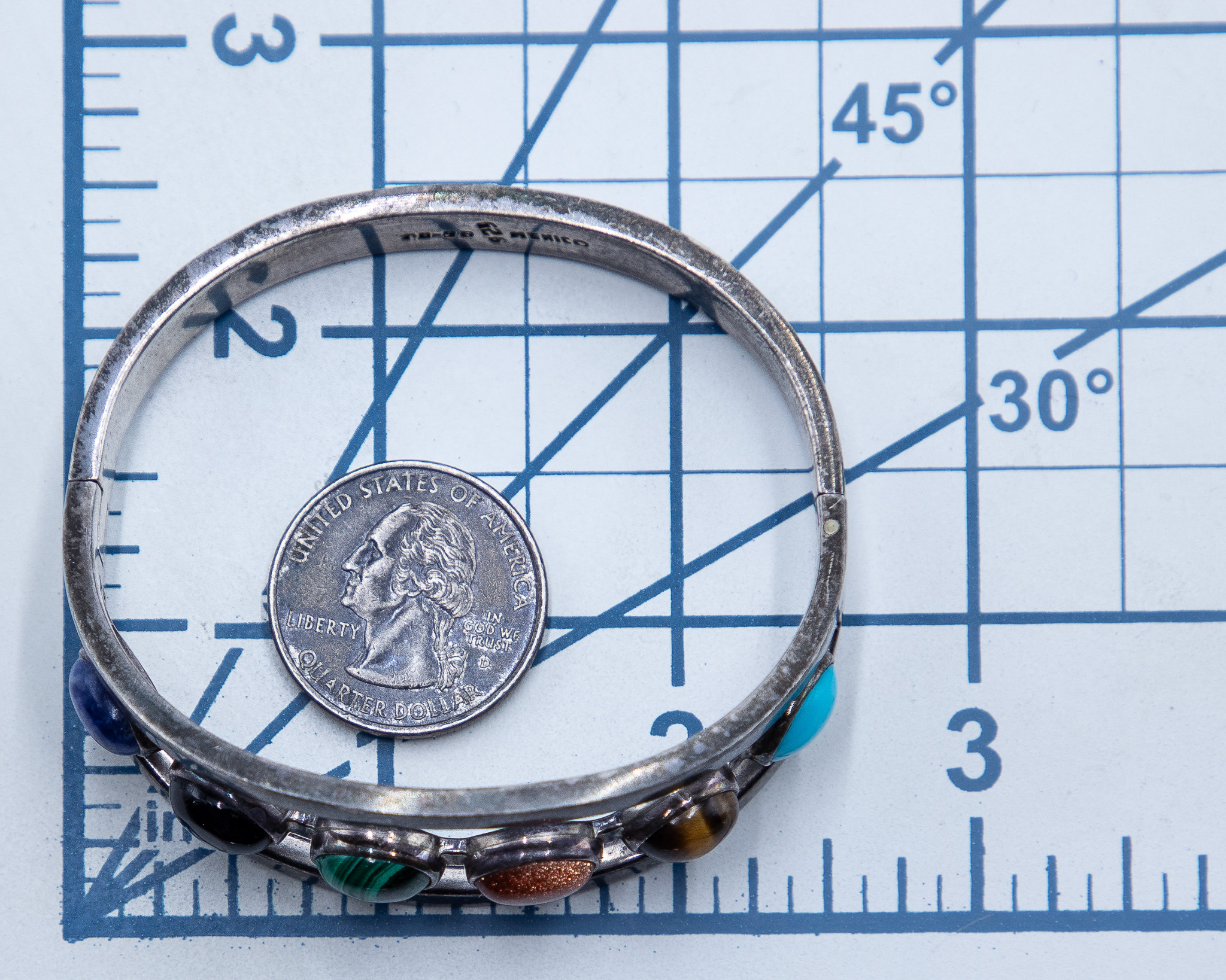 Signed TB-98 Taxco Mexico Sterling Multi Stone Hinge Bracelet 61g-Lapis, onyx, malachite, goldstone tigers eye, turquoise