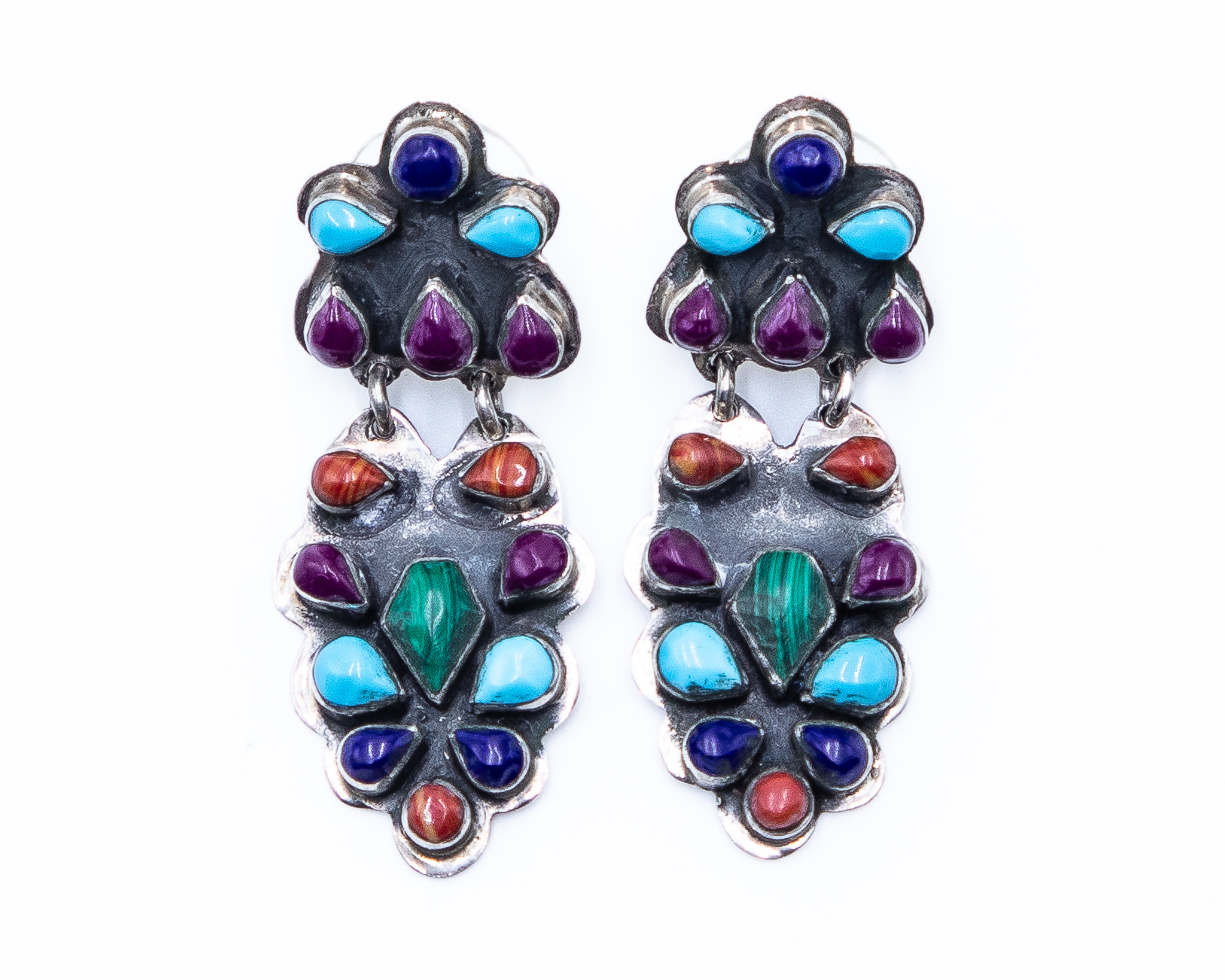 F. Yazzie Navajo Sterling Multi Stone Earrings 10.5g-Orange and Purple Spiny Oyster, Malachite, Turquoise, Lapis