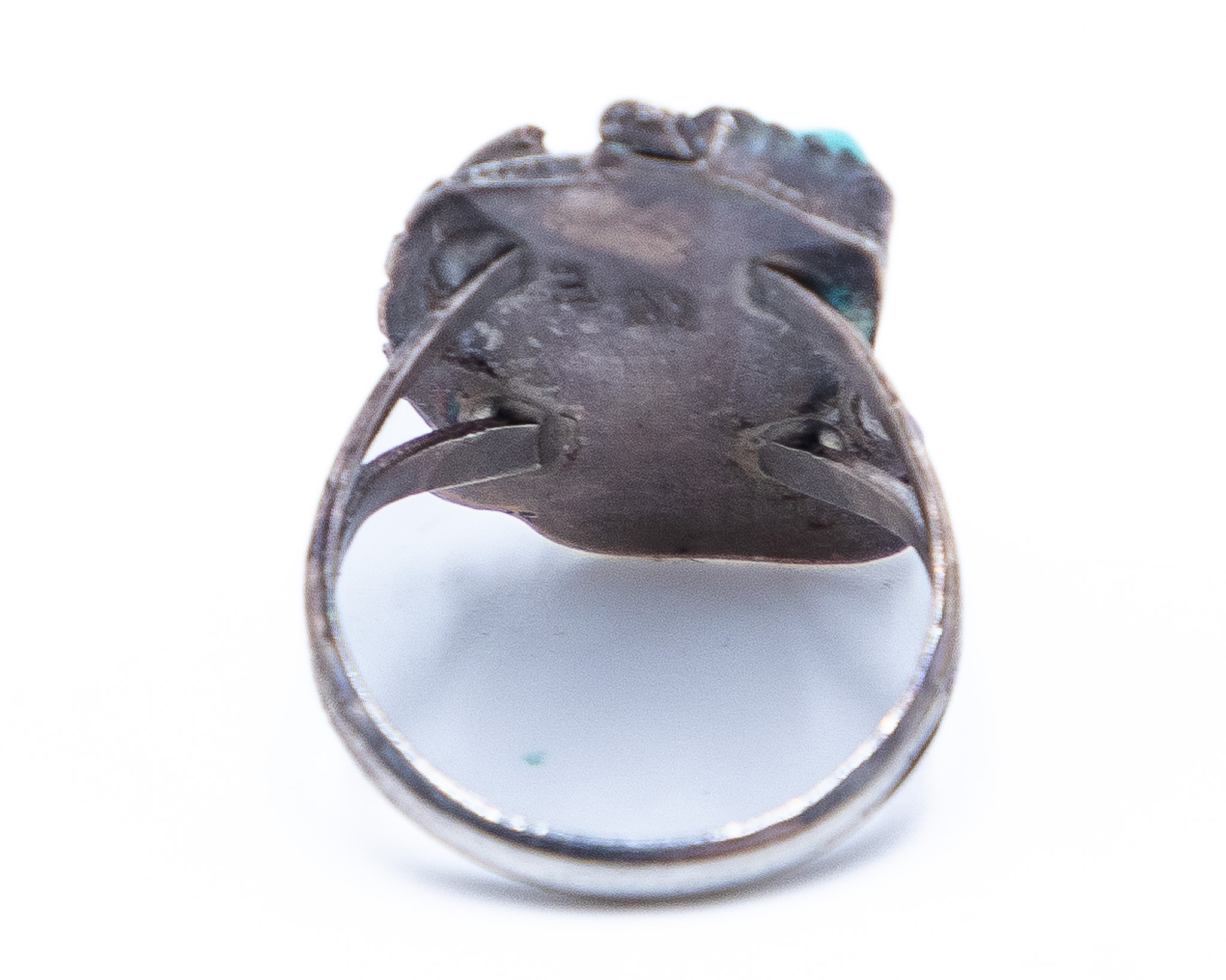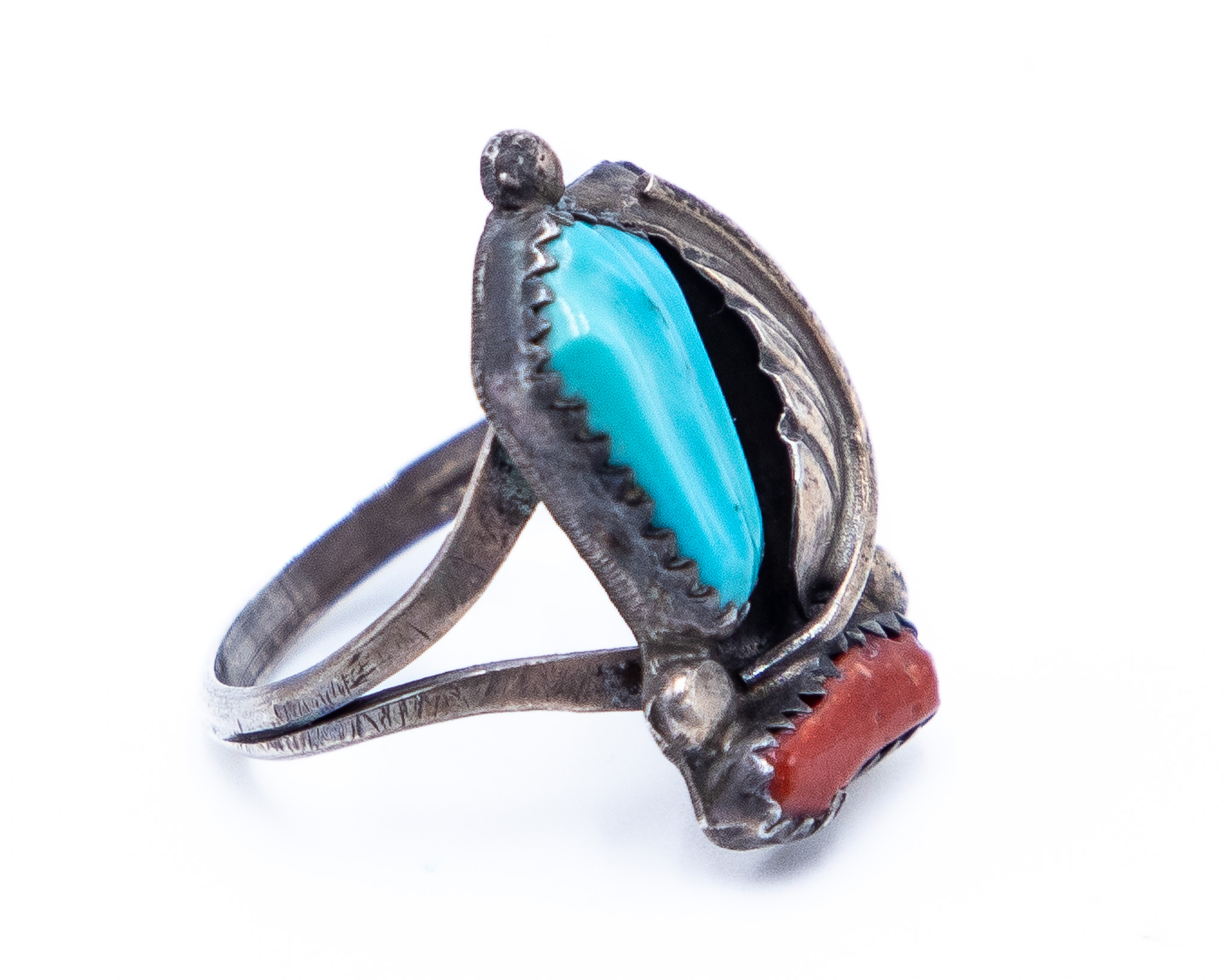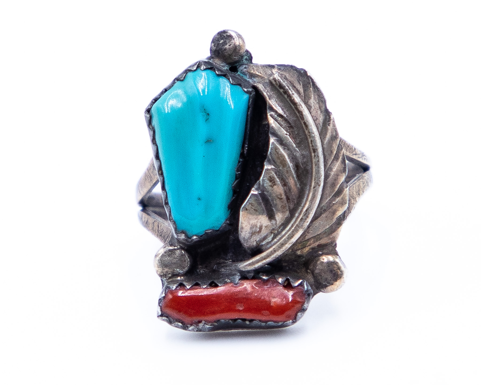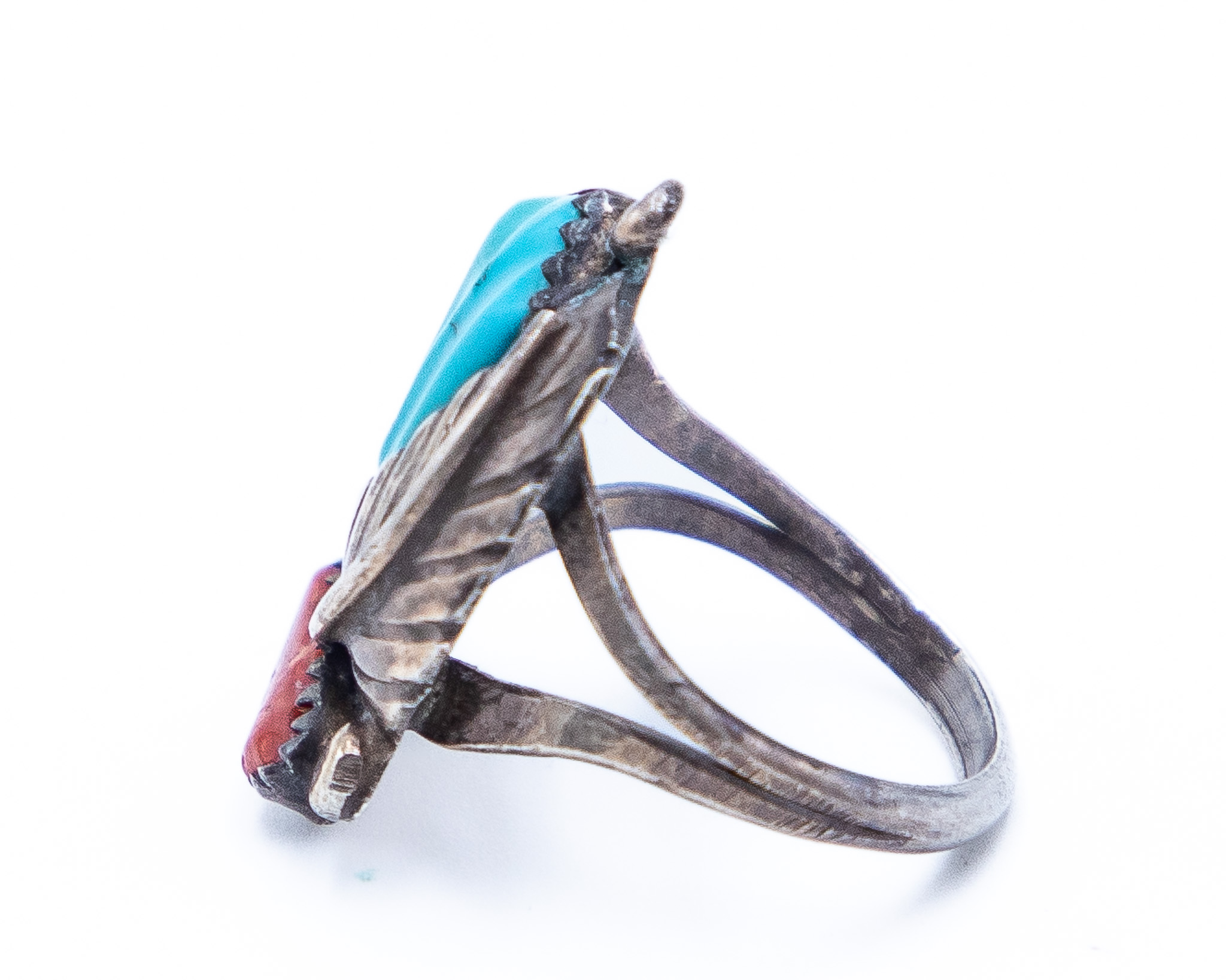 Signed NE Navajo Vintage Sterling Turquoise Coral Ring Sz. 7.25, 4.5g