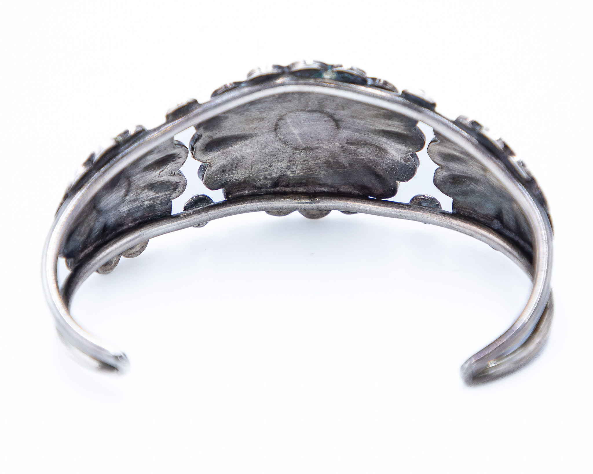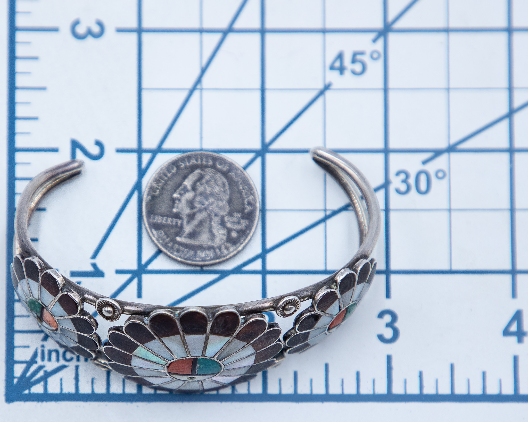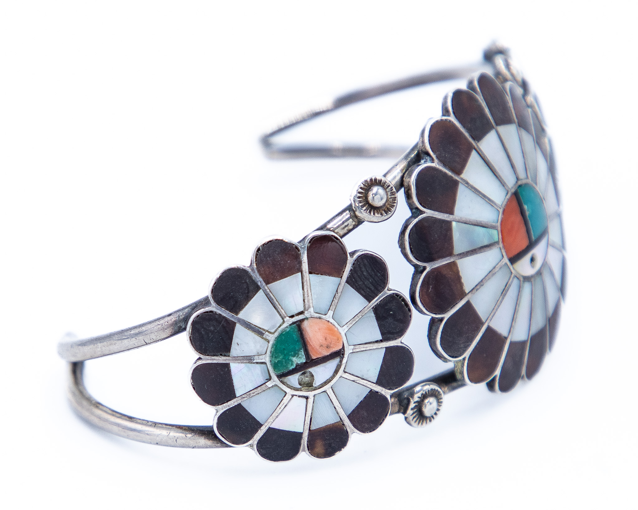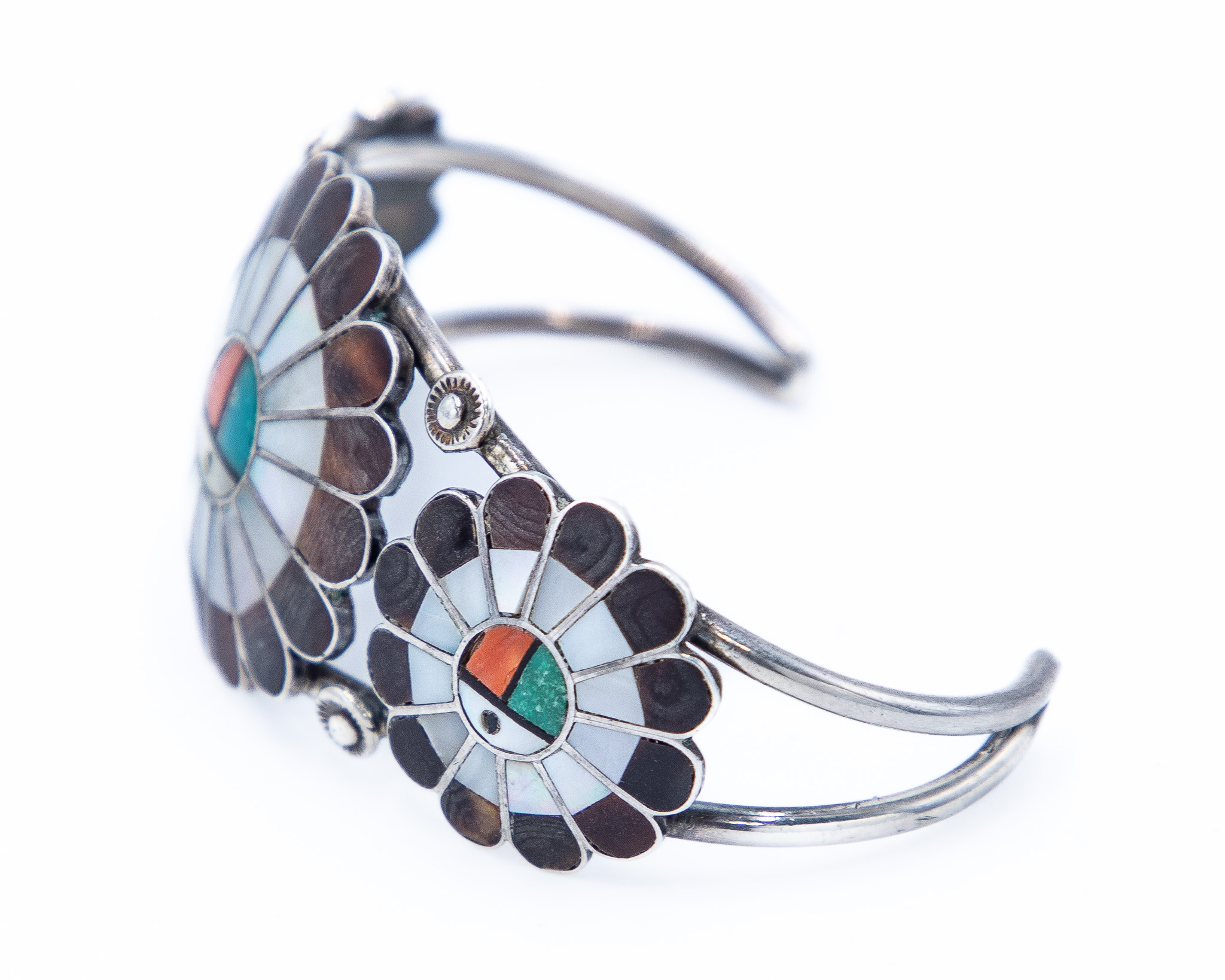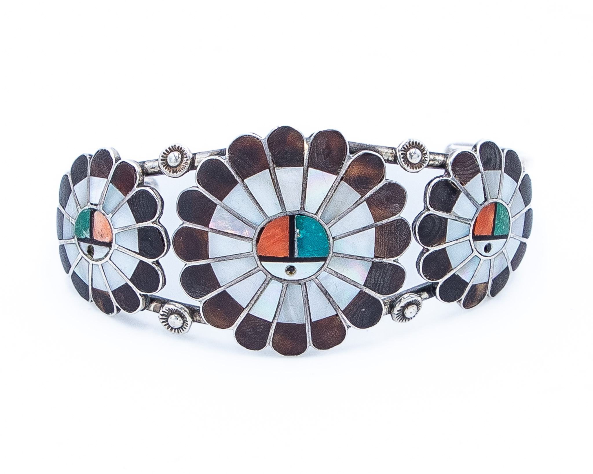Vintage Zuni Sunface Sterling Inlay Cuff Bracelet 30g-Turquoise, Spiny Oyster, Mother of Pearl, Wood/Petrified Wood-As Is, Missing Onyx Inlay