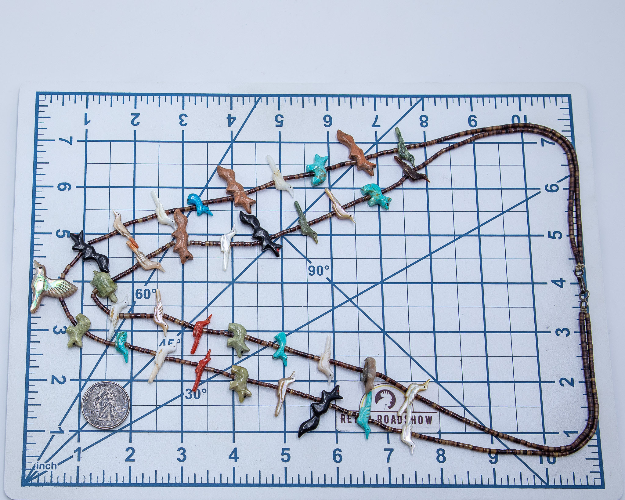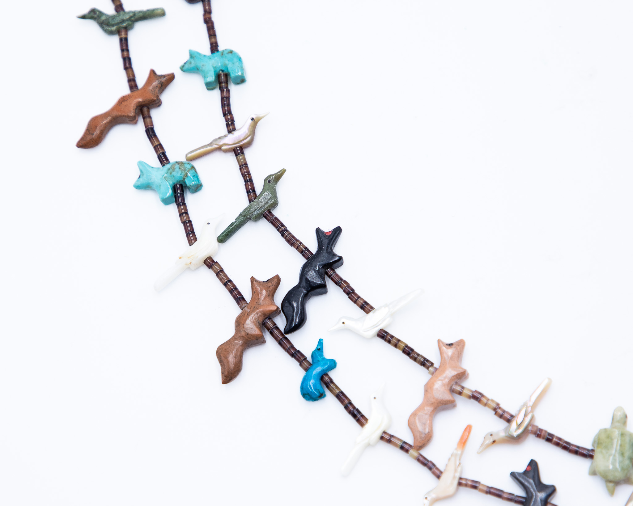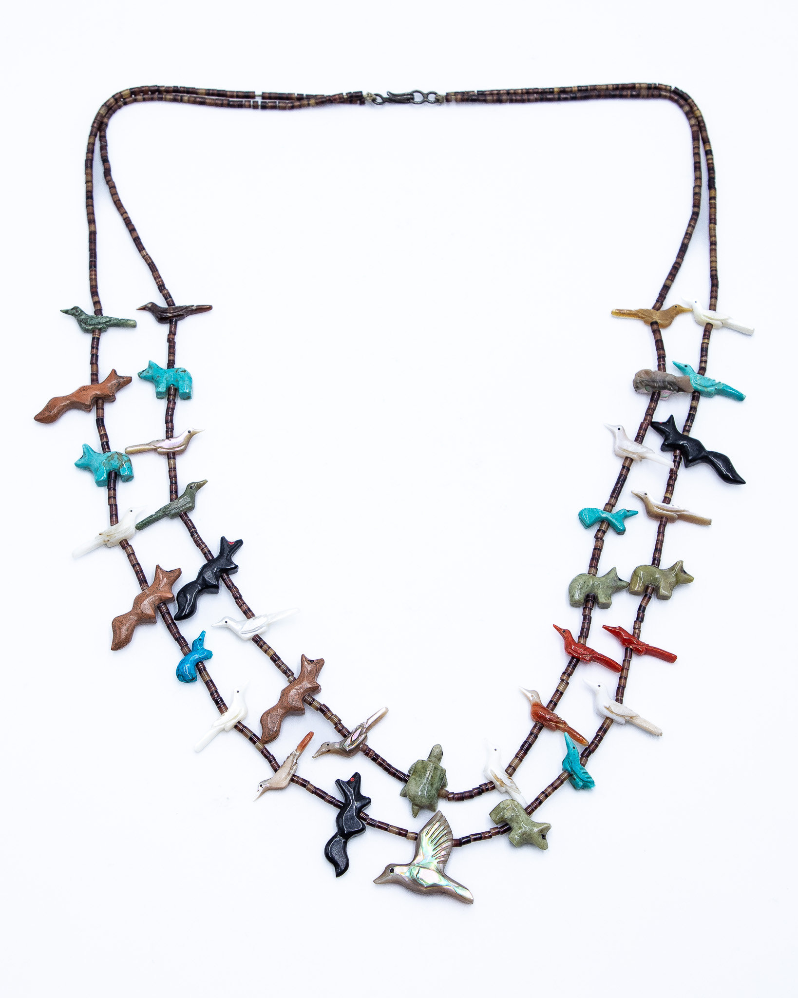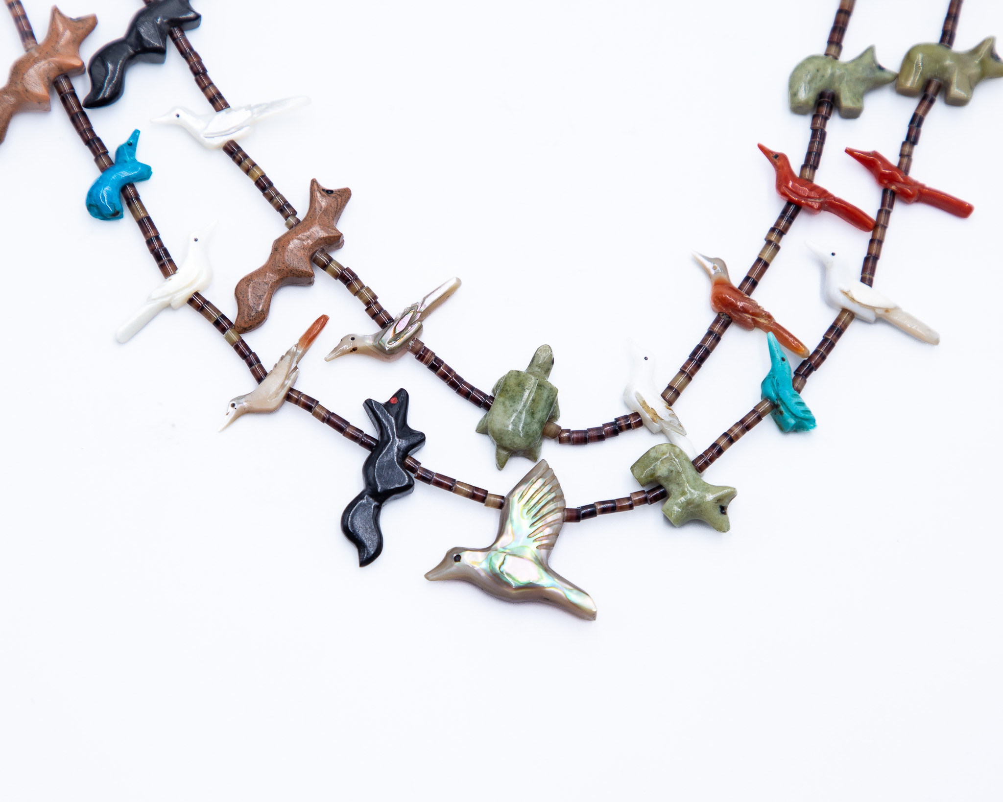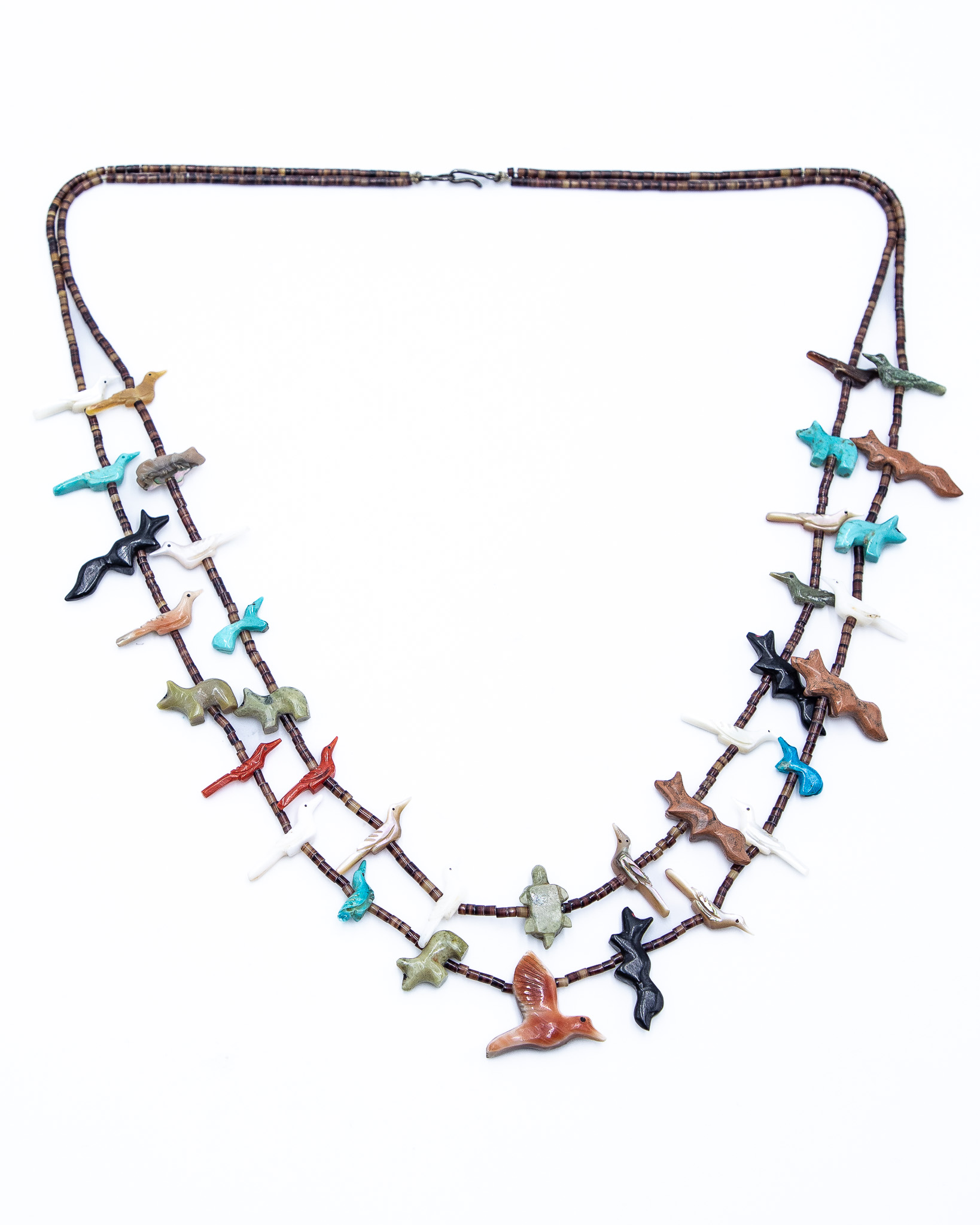 Vintage Navajo Multi Stone Carved Animal Effigy Beaded Necklace 45g This necklace is a mixed artist piece featuring Zuni artists Sam & Lita Delena as well as the Tsikewa family.