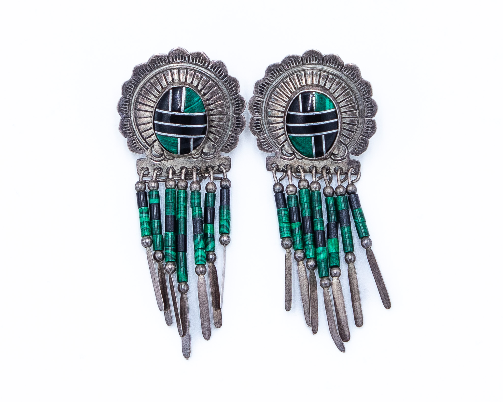 Vintage Zuni Malachite Onyx Sterling Inlay Dangle Earrings