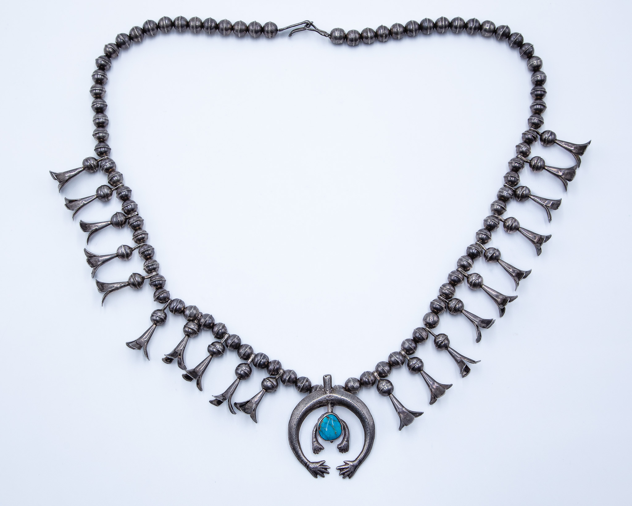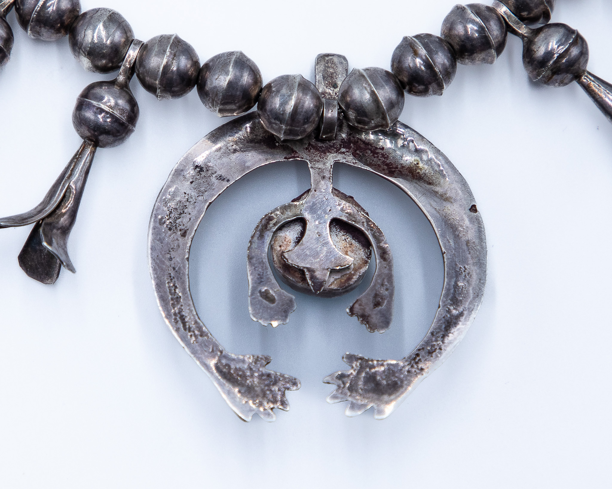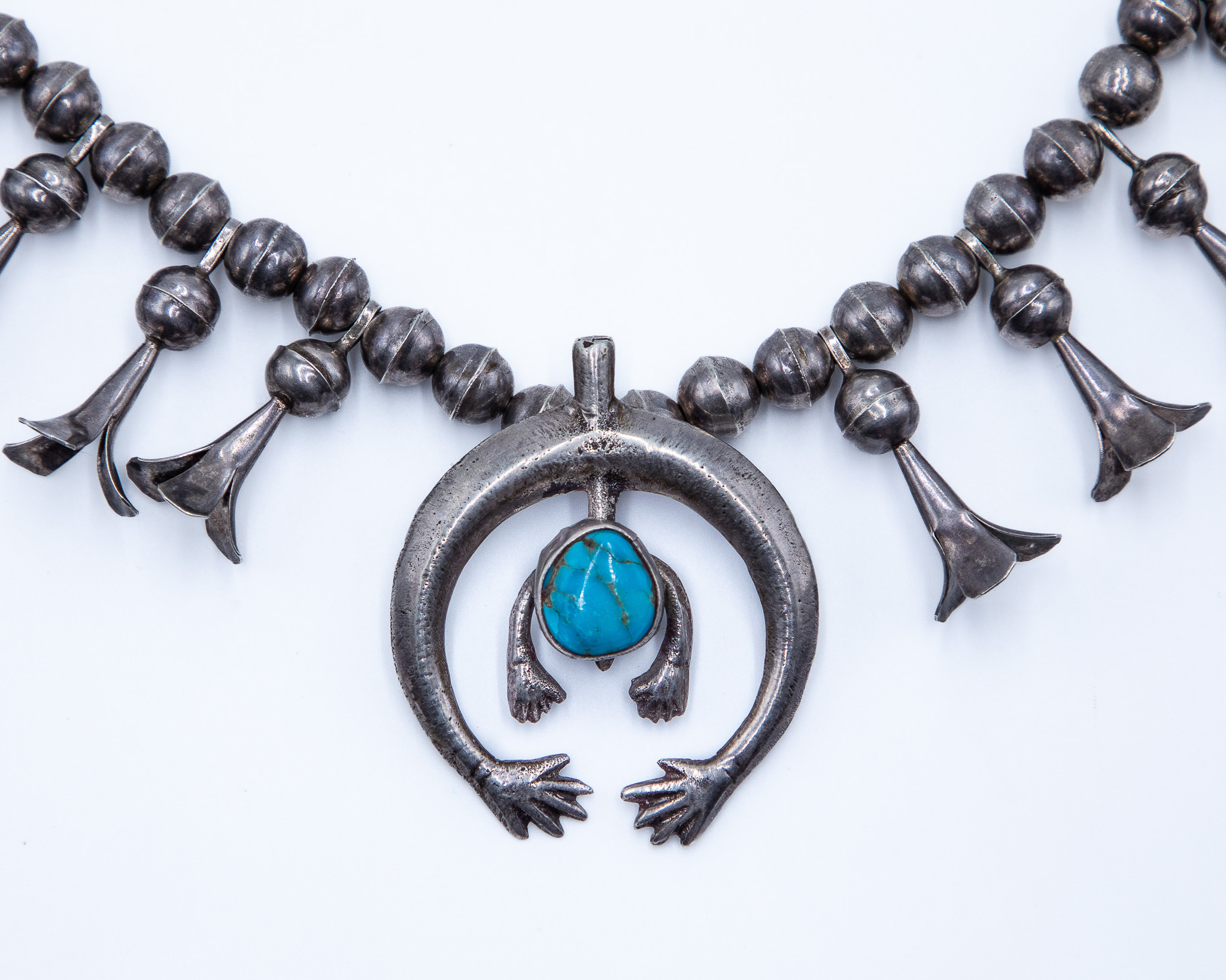Vintage Navajo Sterling Turquoise Squash Blossom Naja Necklace 26 Inches