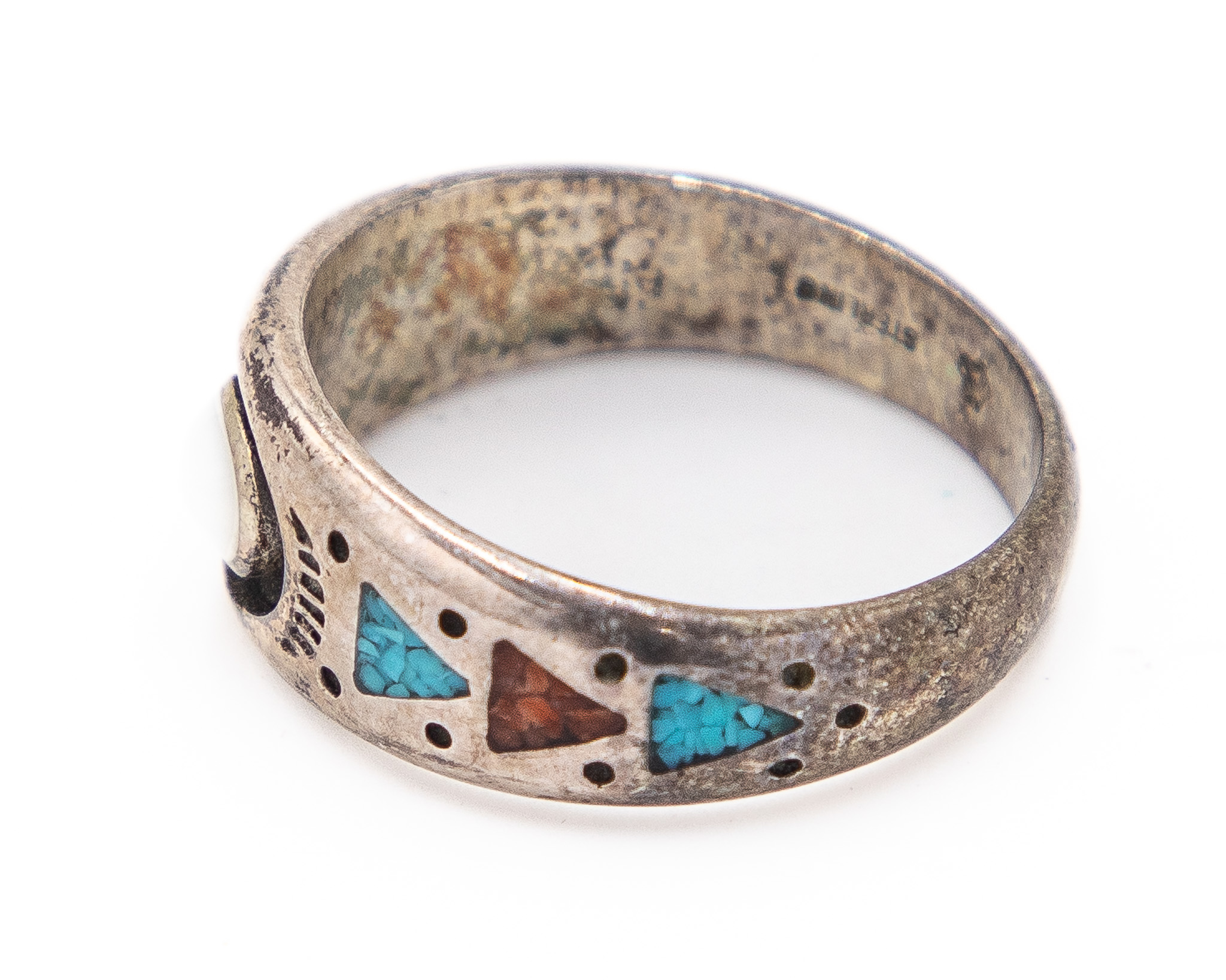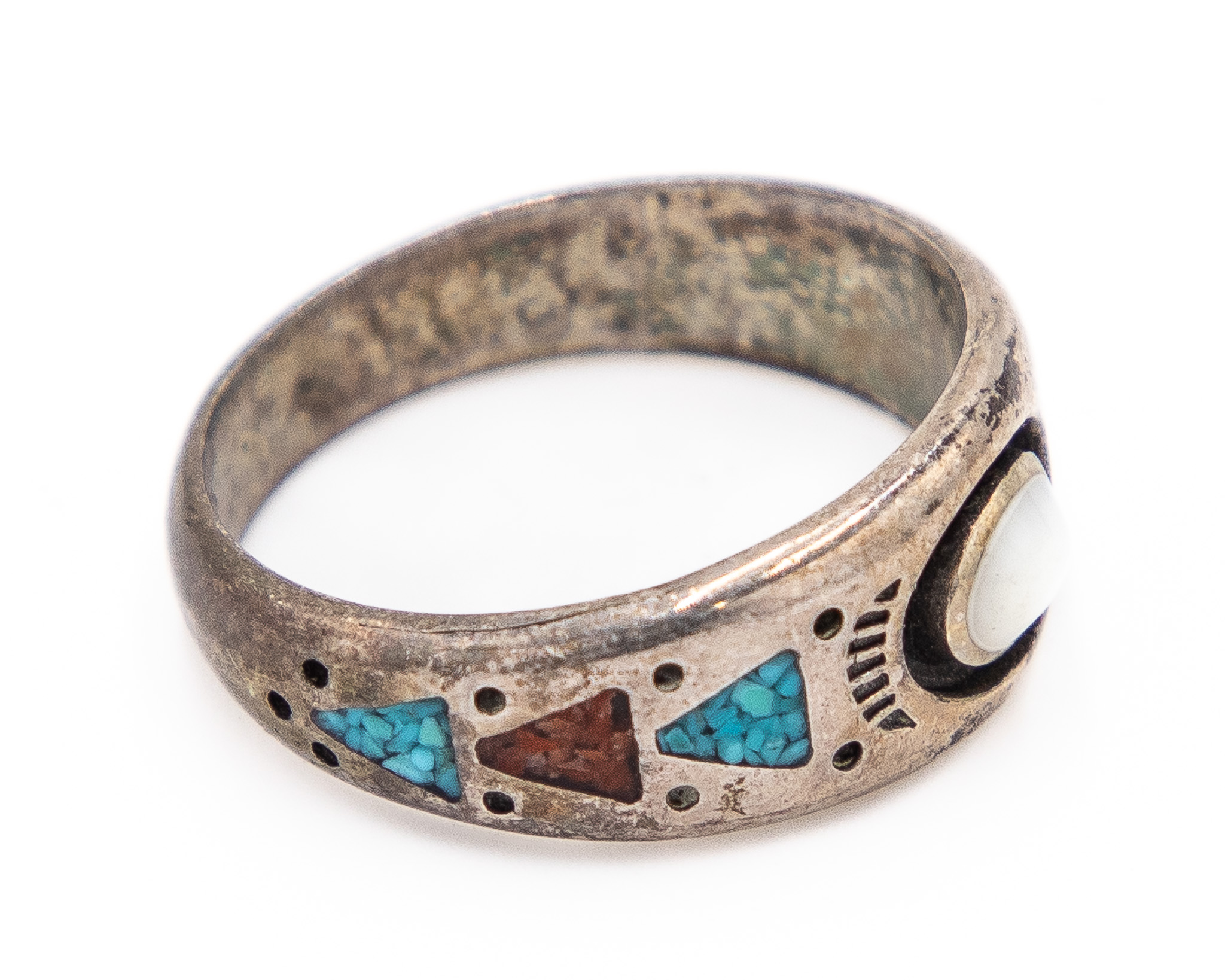 Vintage Native American Sterling Crushed Turquoise Coral Inlay Moonstone Ring Sz. 10, 6g