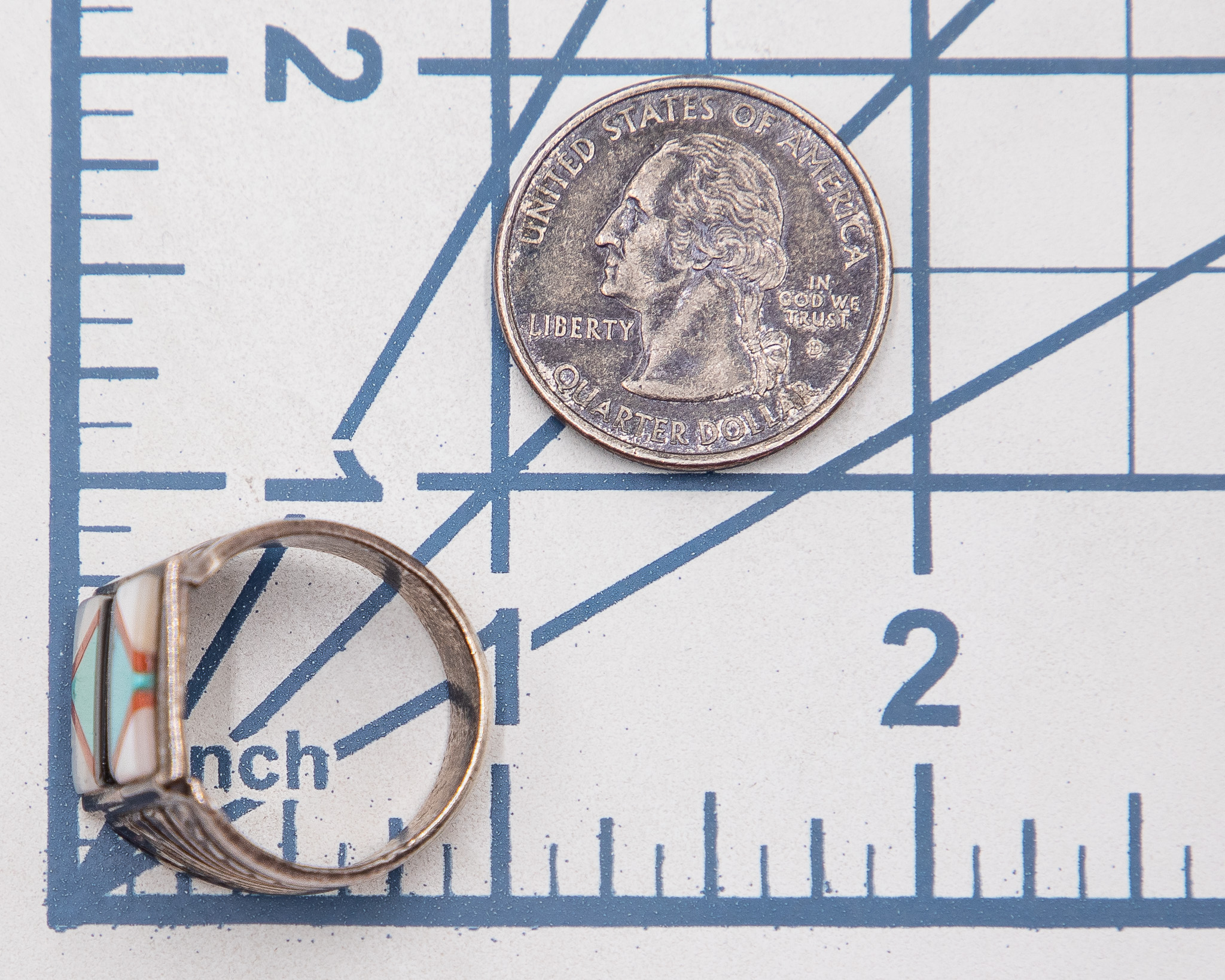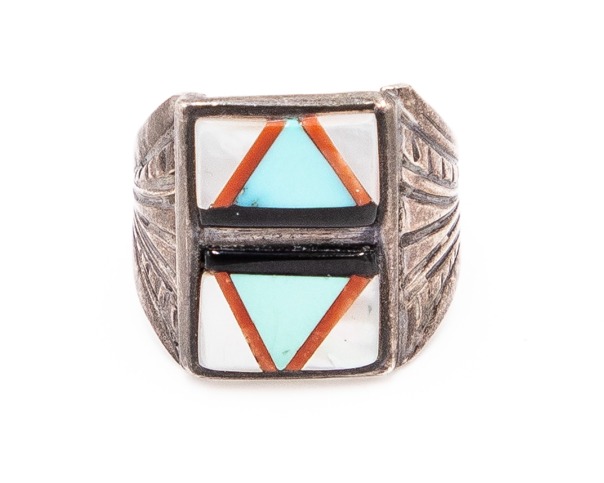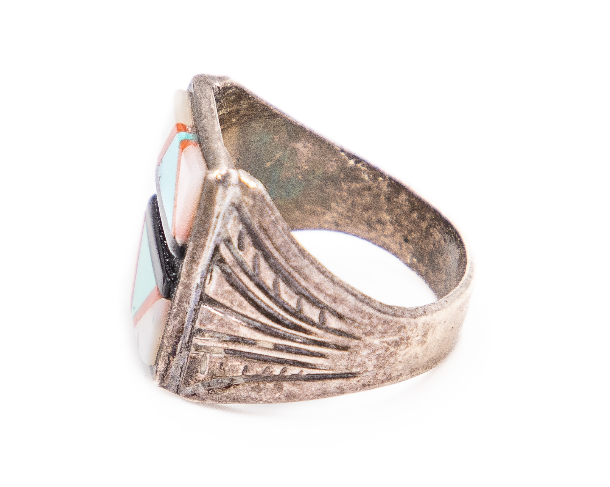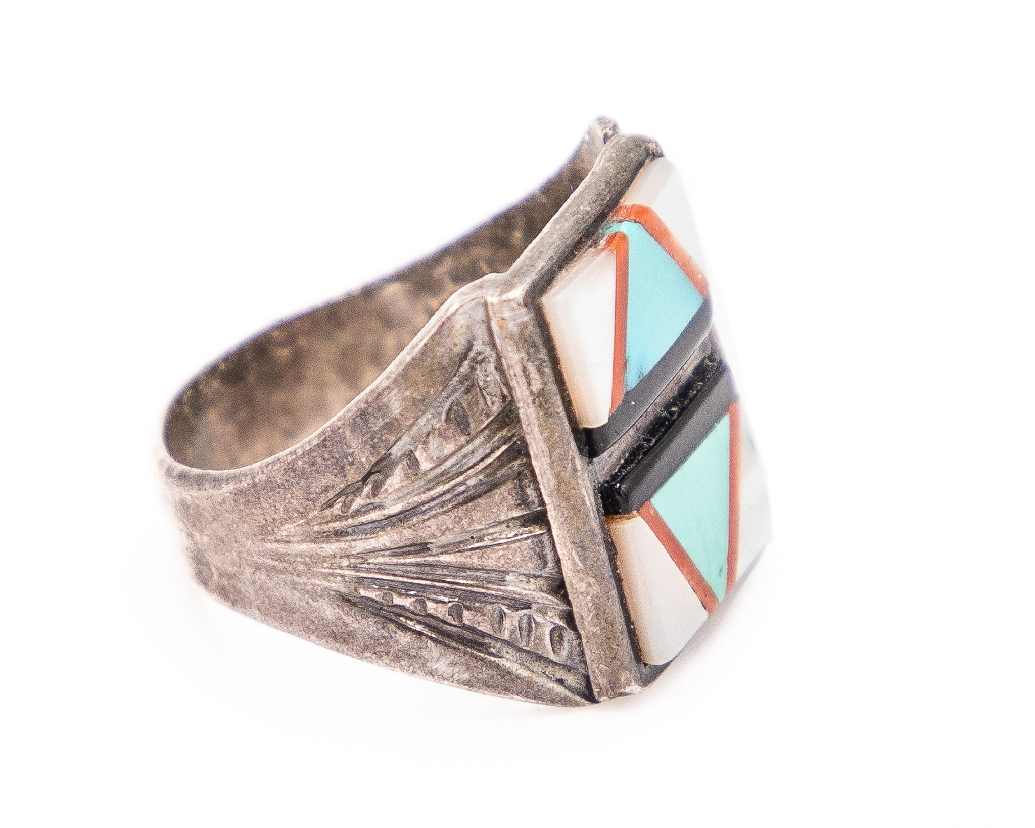 Sunburst Sterling Turquoise Coral Mother Of Pearl Jet Ring Sz. 9.5, 10g