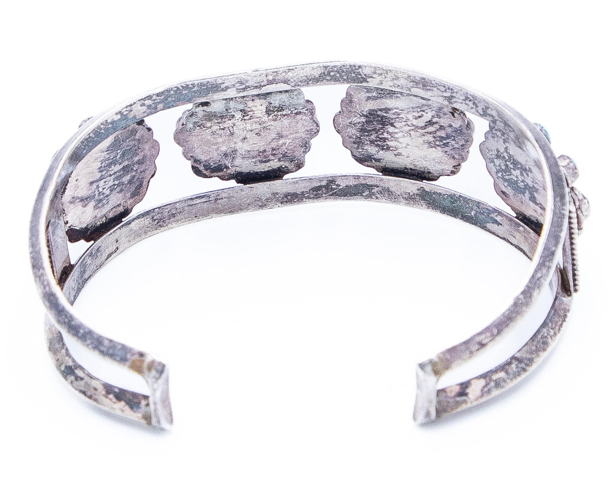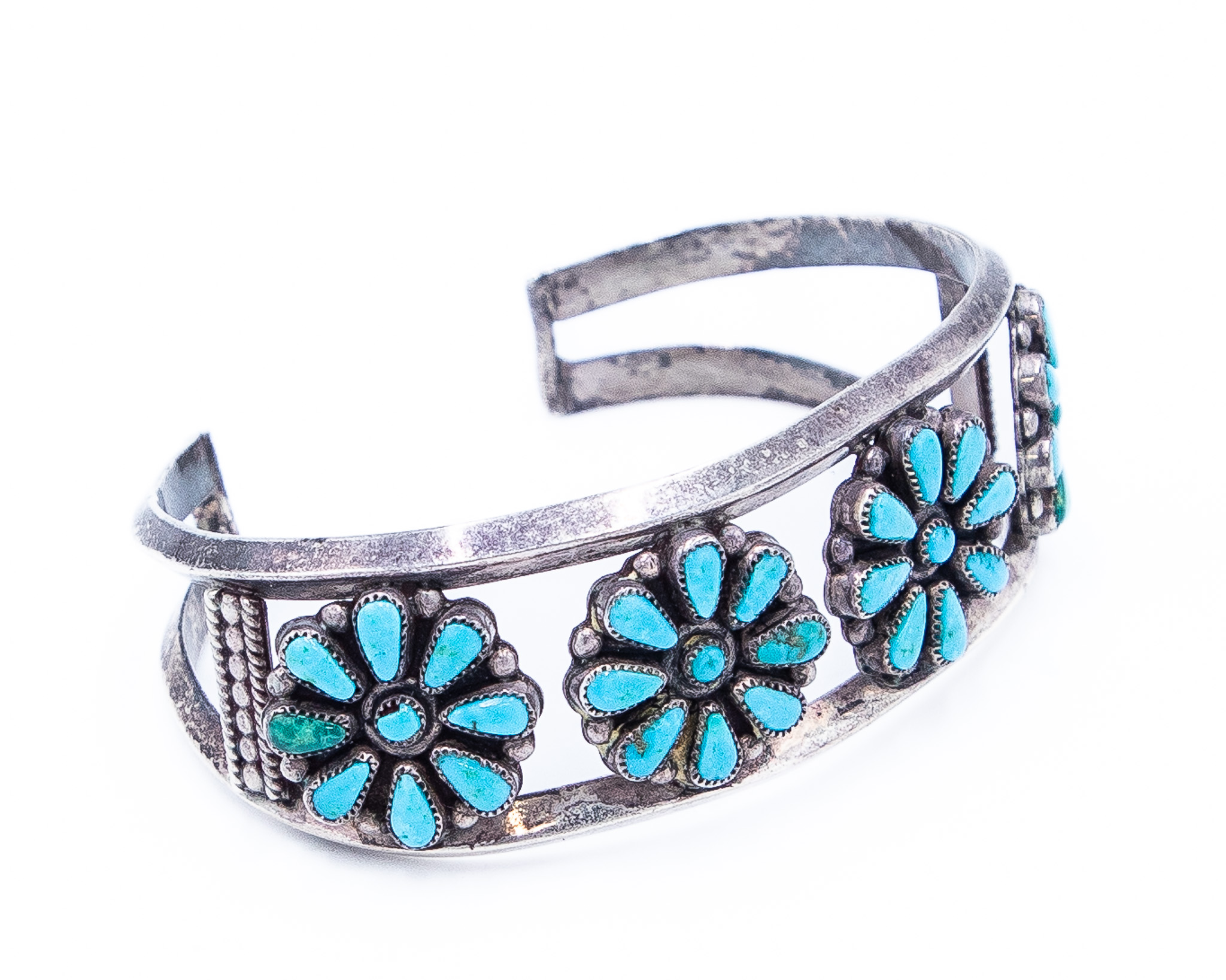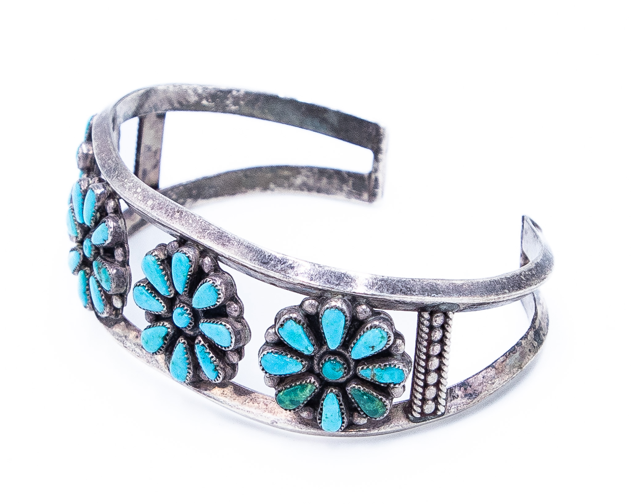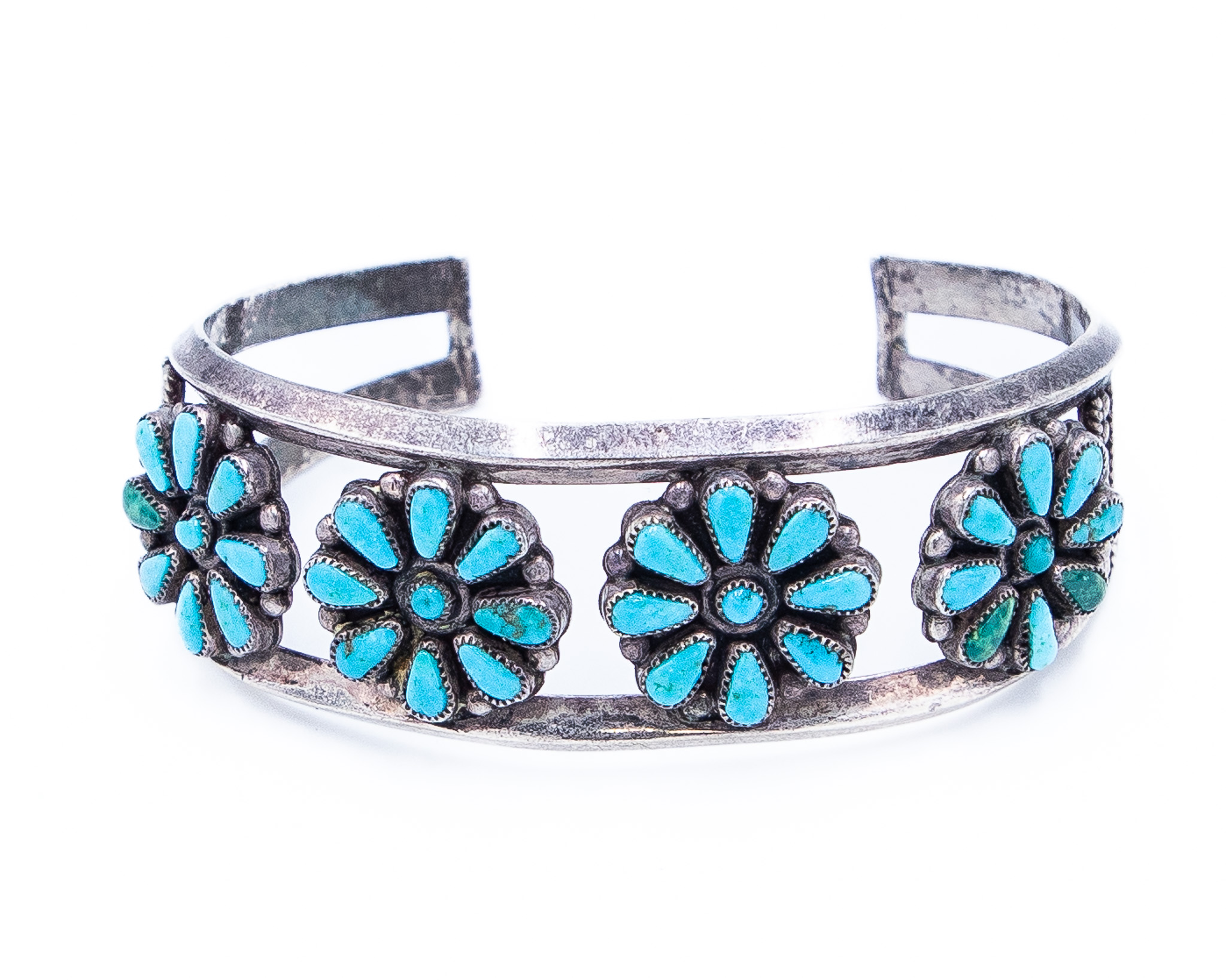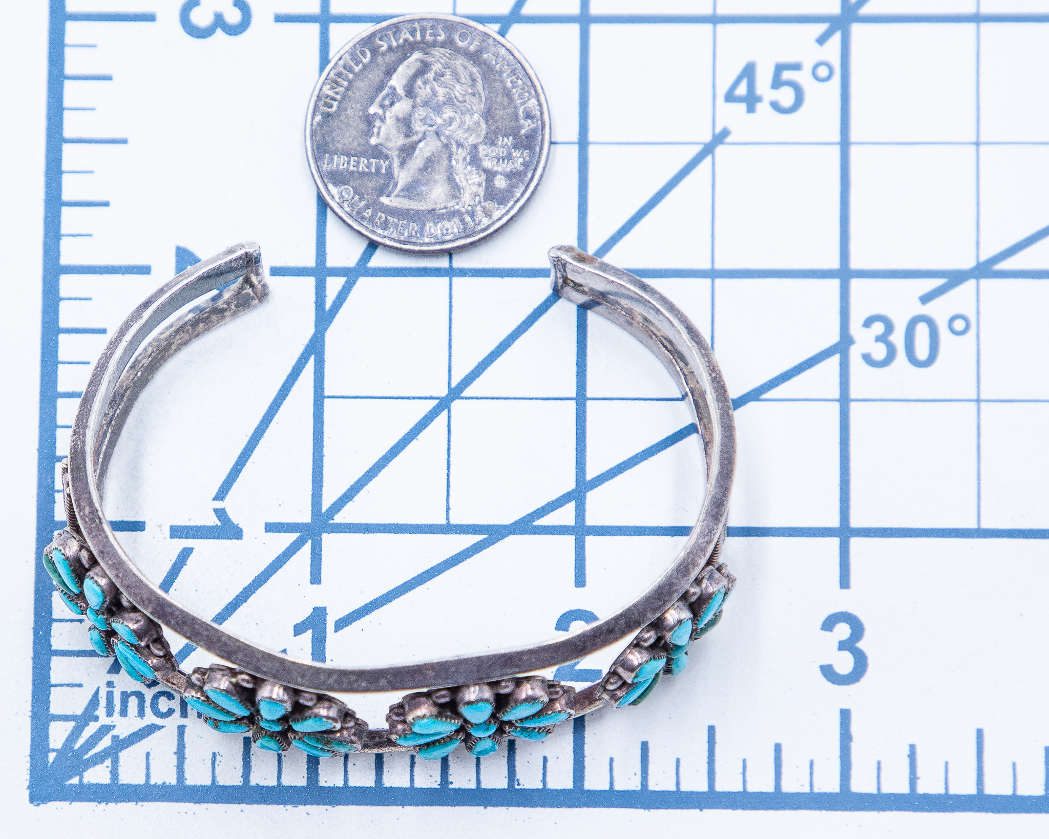 Vintage Zuni Petit Point Snake Eye Turquoise Sterling Floral Cuff Bracelet 30g